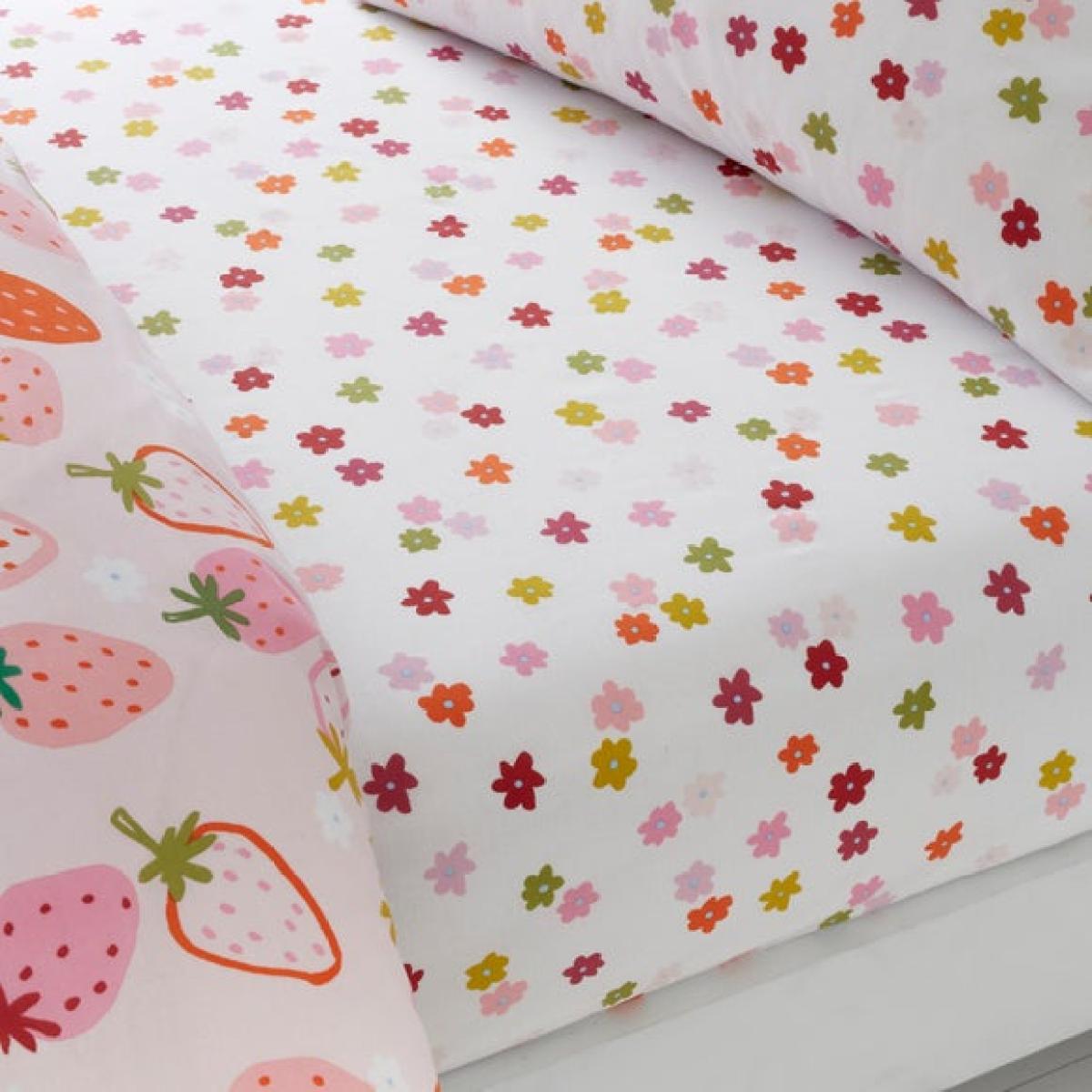 * Pack of 2 fitted sheets * Fun strawberry print kids will enjoy * Soft and breathable for comfy sleep * Elasticated corners for a snug fit Brighten up bedtime with this pack of two fitted sheets, printed with a fun strawberry design little ones will love. Made from soft, breathable fabric that’s gentle on young skin and easy to care for. The elasticated edges help keep the sheets in place, even during the wriggliest of nights. Great for busy households, they’re machine washable and quick to dry. A playful way to refresh their room without any extra effort. Designed to make bedtime that bit more cheerful.