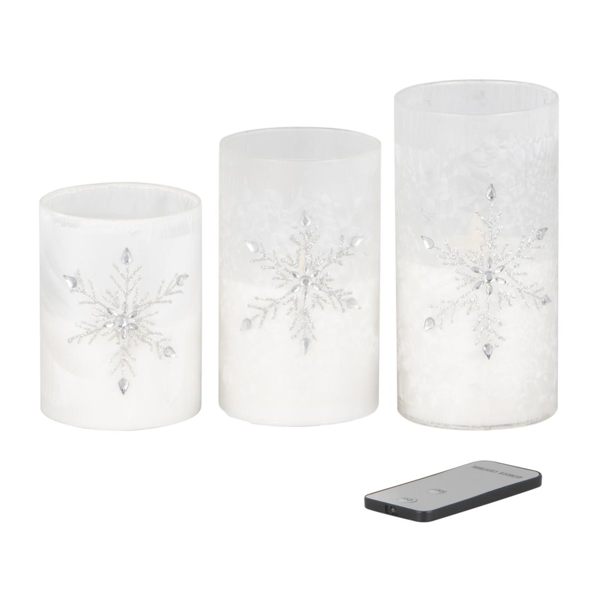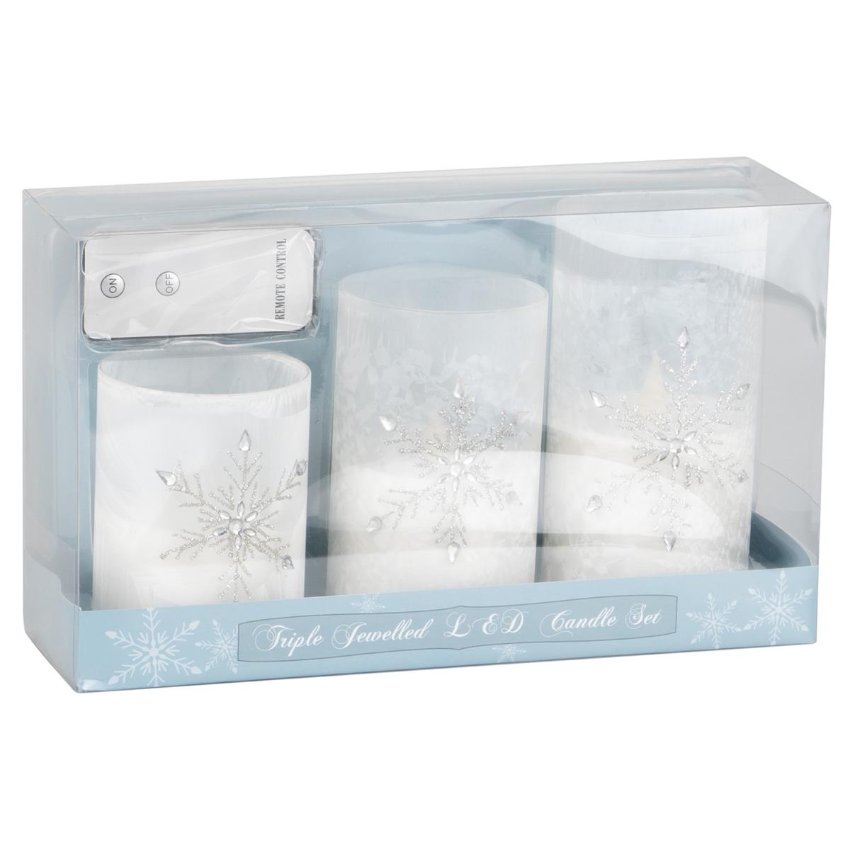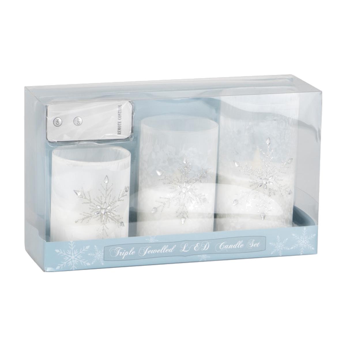 This stunning Set of 3 Snowflake LED Candles will beautifully transform your home during the magical months of winter. Decorated with a dazzling jewlled snowflake design, these cosy candles feature battery-operated LEDs and a remote control to easily switch them on and off from the comfort of your sofa.