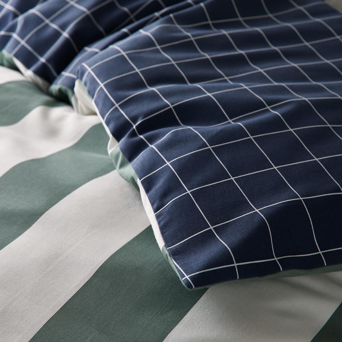 Stripes and checks make Paco bed linen vibrant... Cotton is part of our daily lives. We love it for its suppleness and softness. Easy Care, it is ideal for the beds of young and old alike!Product Details • 100% cotton • Contains 30% recycled cotton • Front printed with large green and white stripes/ back printed with small squares on a blue background • Straight buttoned hem Match this item with the rest of the bedding in the range for a stylish bedroom. And you can mix and match it with different colours and styles from our other bedding ranges when you want to change things up and create your own unique look. Care Advice • Machine washable at 60°C • By washing your laundry at 40°C instead of 60°C, you limit energy consumption. Dimensions • 140 x 150cm: Adjustable bed • 140 x 200cm: Single • 200 x 200cm: Double • Recycled cotton. Using recycled cotton is all about conserving resources and reducing waste.