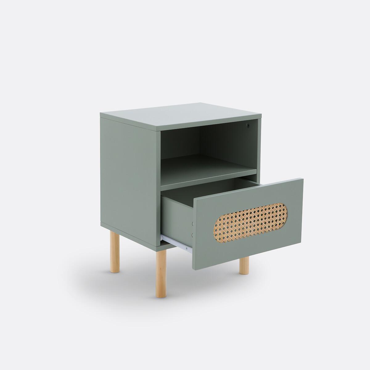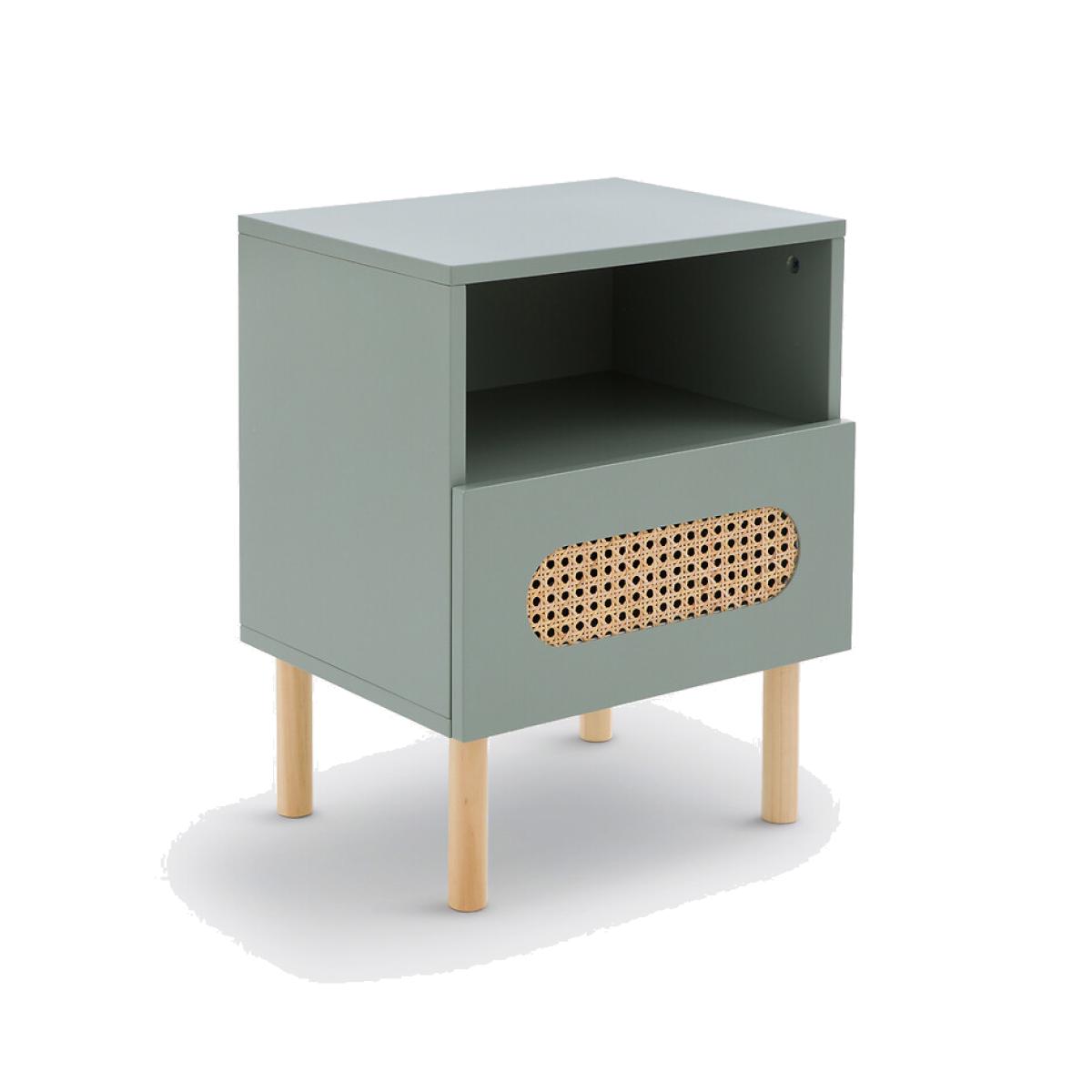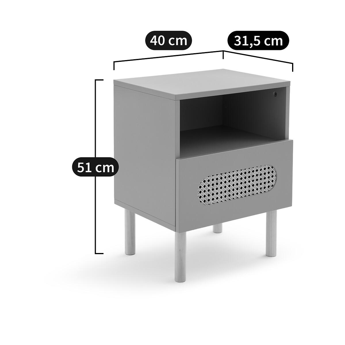 Pacome combines simplicity and functionality. With its drawer highlighted with a rattan cane patch, this bedside table brings a retro charm to the bedroom. Product Details • 1 open storage compartment and 1 drawer • Lacquered MDF unit, acrylic varnish finish • Solid pine legs, nitrocellulose varnish finish • Rattan cane patch on the front of the drawerDimensions. Overall • Width: 40cm • Height: 51cm • Depth: 31.5cm • Weight: 8kg. Usable space • Drawer: L32 x H10.5 x D23.7cm • This product requires assembly. • WOOD FROM SUSTAINABLY MANAGED FORESTS. FSC® certified wood comes from forests that are environmentally, socially and economically well managed. Parcel Dimensions • 1 parcel • L54 x H18 x D38cm. 9.7kg