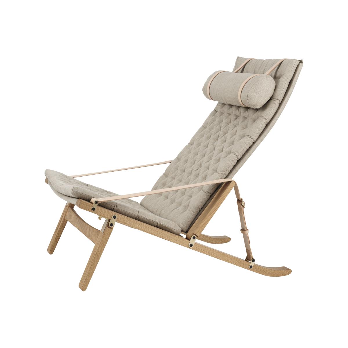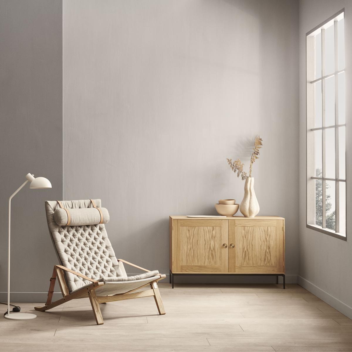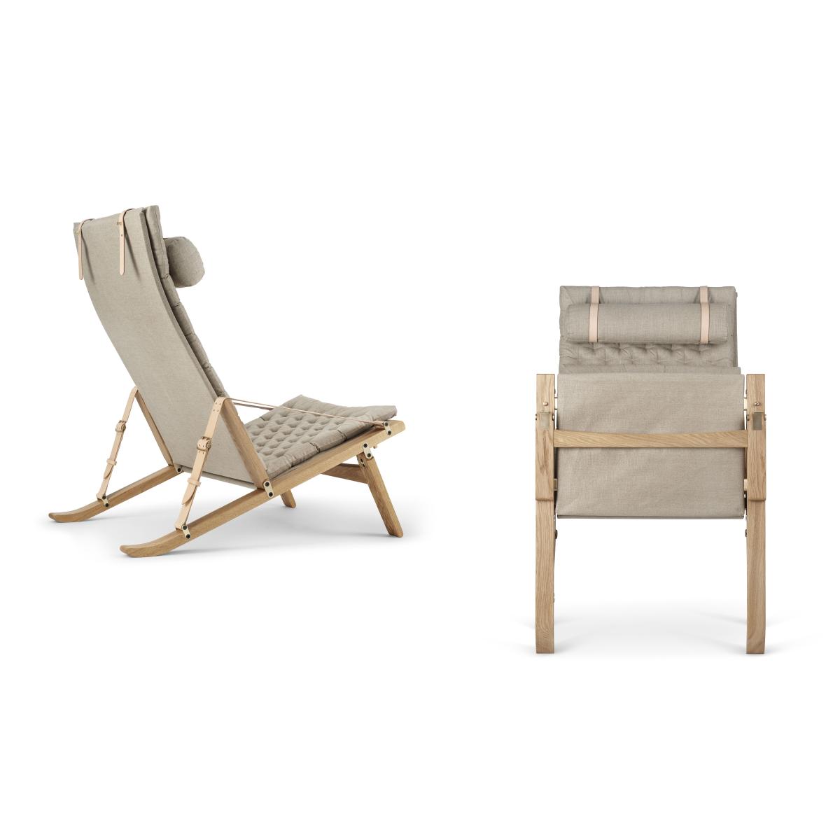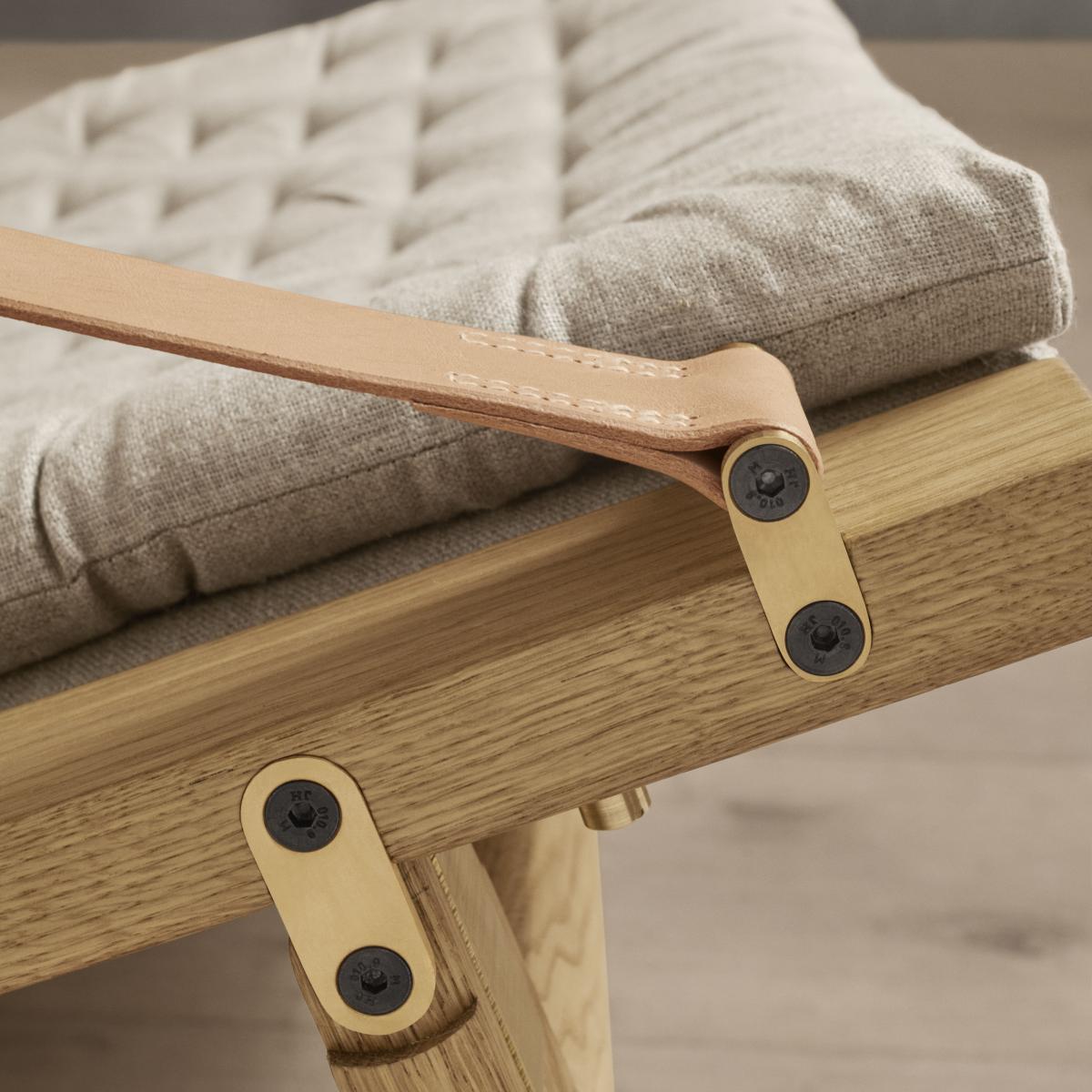 Since 1908, Carl Hansen & Søn has embodied the quintessence of Danish design by combining craftsmanship, quality and innovation. The brand brings together a collection of masterpieces of Scandinavian design: iconic items created by the greatest Danish designers. Handcrafted in Denmark, these pieces with their exceptional quality stand the test of time. With the strictest respect for the original models, Carl Hansen & Søn reissues the legendary creations of the founders of Scandinavian design. The Plico Chair folding lounge chair was designed in 1963 by the duo Preben Fabricius and Jorgen Kastholm. Kastholm's experience as a blacksmith combined with Fabricius' training as a cabinetmaker led to the creation of sculptural pieces, featured in museums around the world. Their work has influenced the aesthetics of Danish modernism. The designers sought to create a lounge chair that takes up as little space as possible when not in use, without compromising comfort and elegance. They created a deceptively simple design with luxurious details: magnificent brass fittings, saddle leather armrests. The frame is solid oak with curved rear legs for greater stability. The high backrest with its bolster provides optimal back support. The cushions are covered in linen with a refined look. The Plico Chair folding lounge chair is much more than just a piece of furniture: it's a functional work of art that embodies the heritage of Danish design.