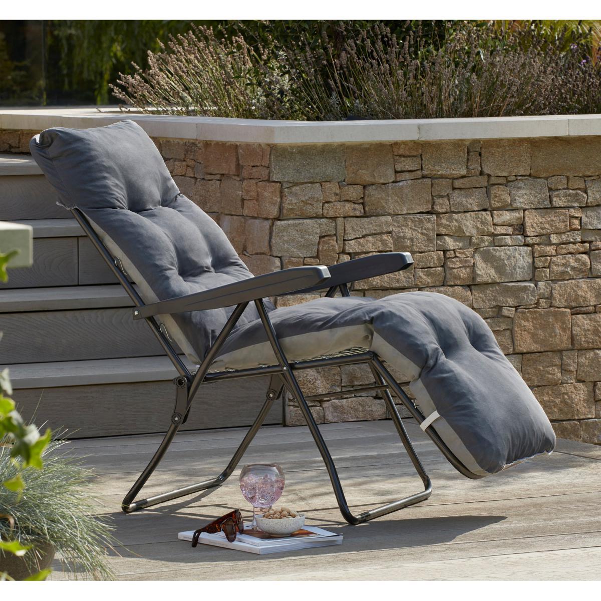 Perfect for relaxing in the sun in style, this padded lounger is comfortable and elegant. This lounger includes plush cushions for added comfort. This lounger has 6 adjustable positions and can easily fold away for easy storage.