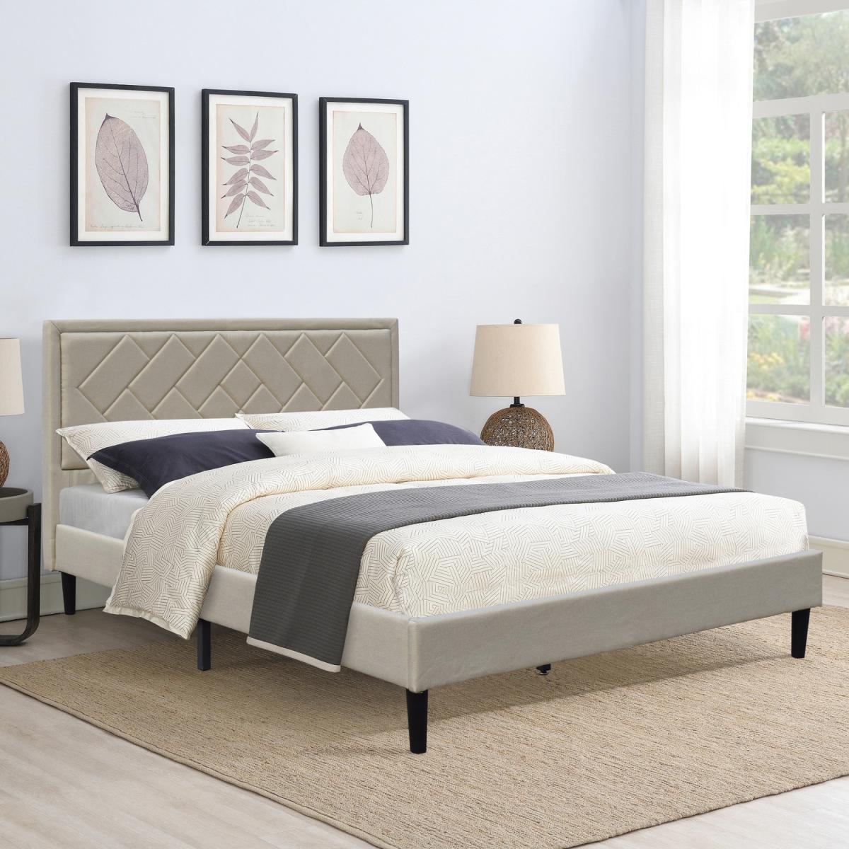 Padded Headboard Grey Fabric Bed Frame - Stone / King