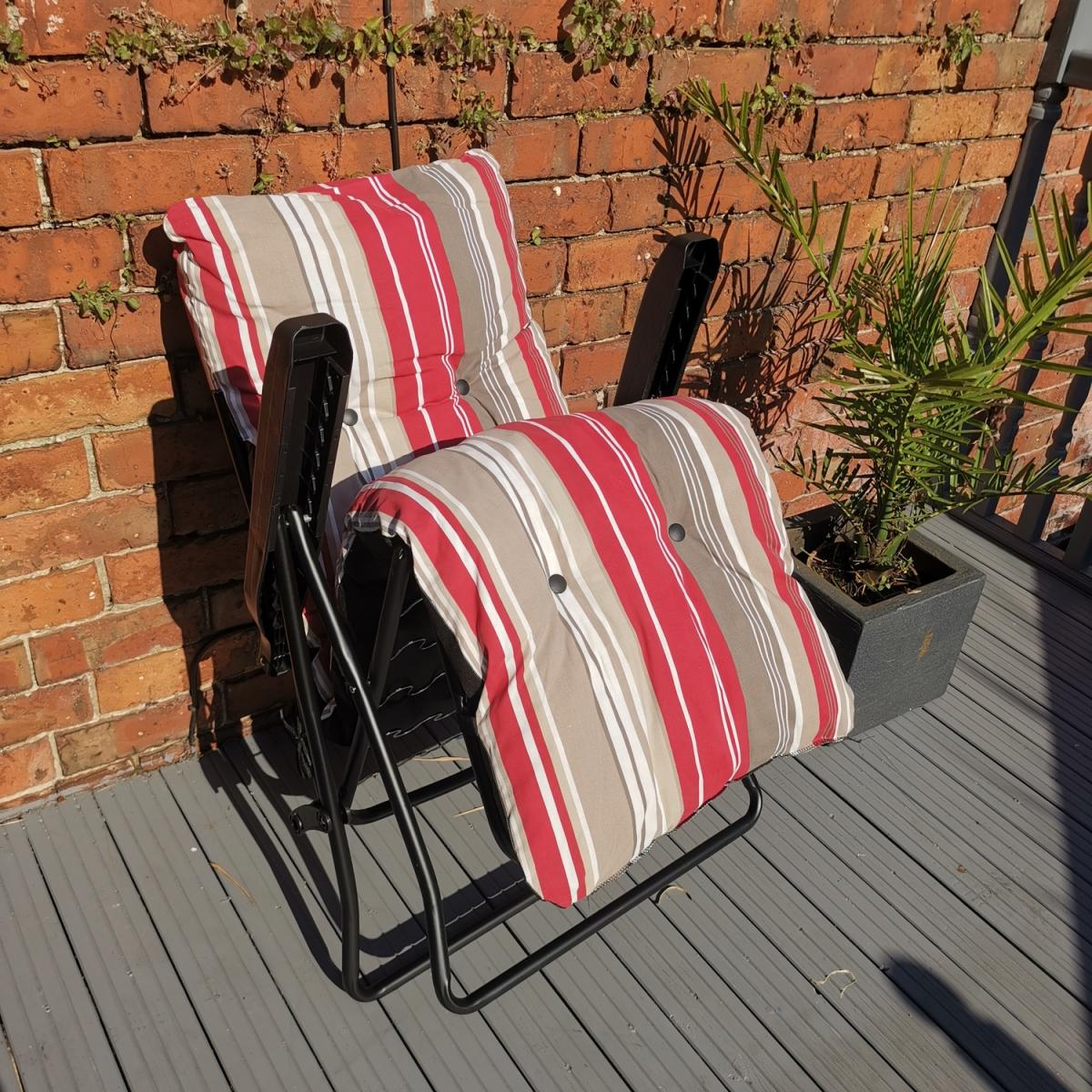 Single sun lounger chair. Steel frame with a thick crumb filled padded cushion in a choice of stylish designs. These comfortable chairs can make a striking addition to your outdoor space. Relax in the sunshine this Summer on one of these stylish sunloungers. Easy to put up, and folds down for easy storage. Plastic feet included. Approximate dimensions - 60.5 x 81 x 107cm. Max user weight 110kg.