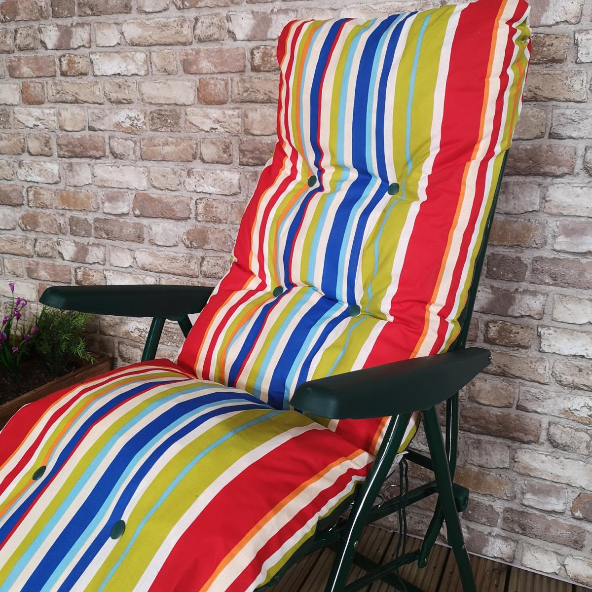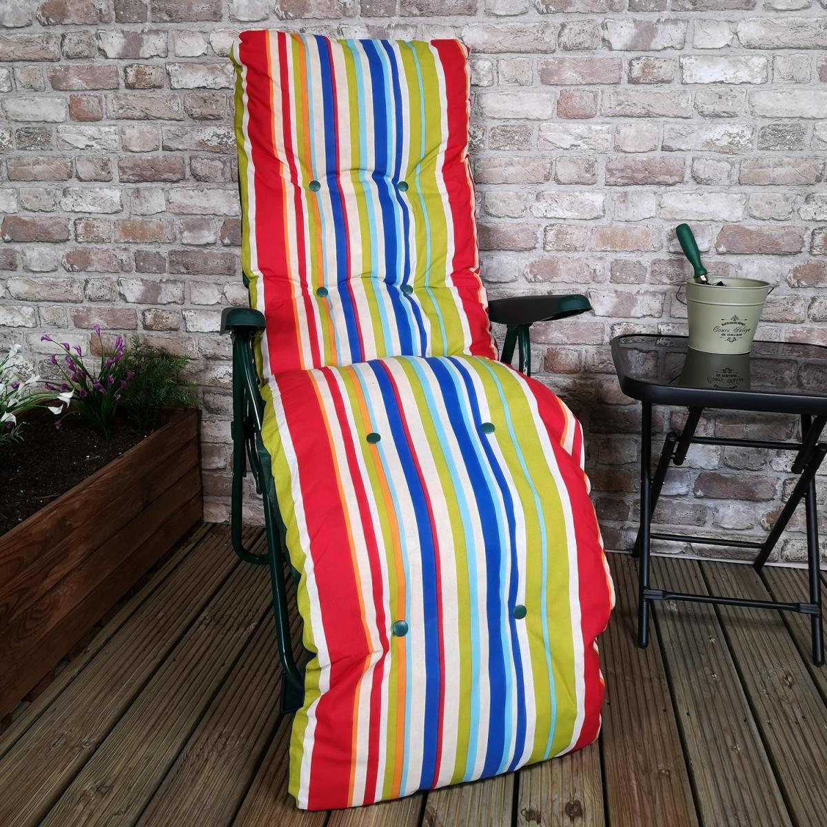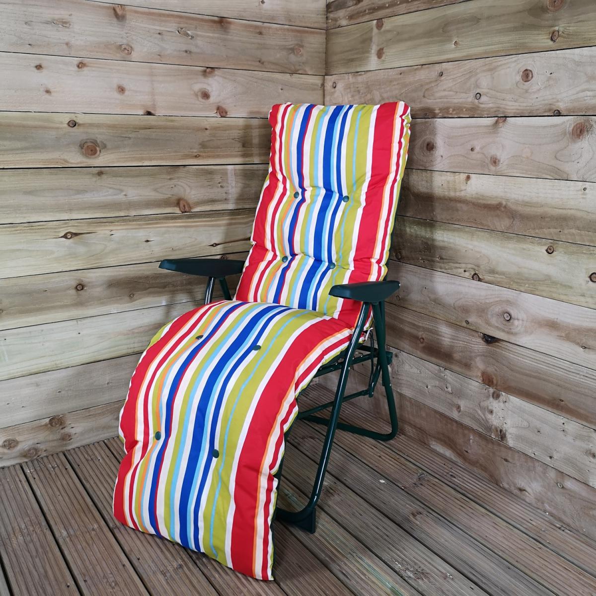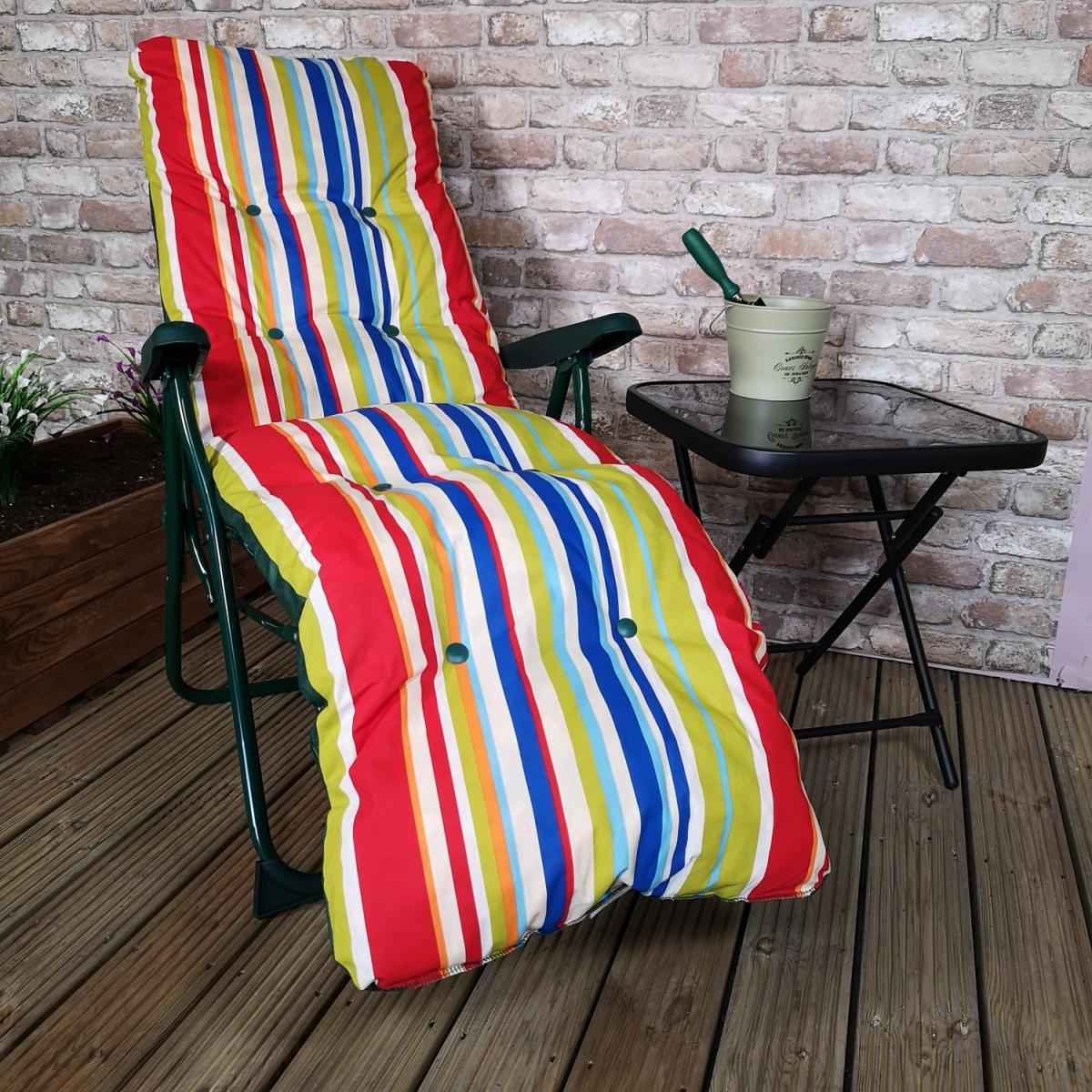 I love this padded outdoor sun lounger for its vibrant, cheerful design that easily injects colour into any garden or patio. The bright stripes make it a perfect statement piece for a relaxed, summery vibe, yet it also works well in more understated outdoor settings when paired with neutral cushions and natural materials. Its 20cm padding provides added comfort for long lounging sessions, making it both practical and inviting. For styling tips, consider layering with complementary outdoor cushions in similar or contrasting colours to create a cosy breakout spot, and place it near some lush greenery or a small side table to complete the look. It’s versatile enough to work in modern, rustic, or even eclectic gardens, making it a handy piece to have on hand for both everyday relaxation and entertaining guests.