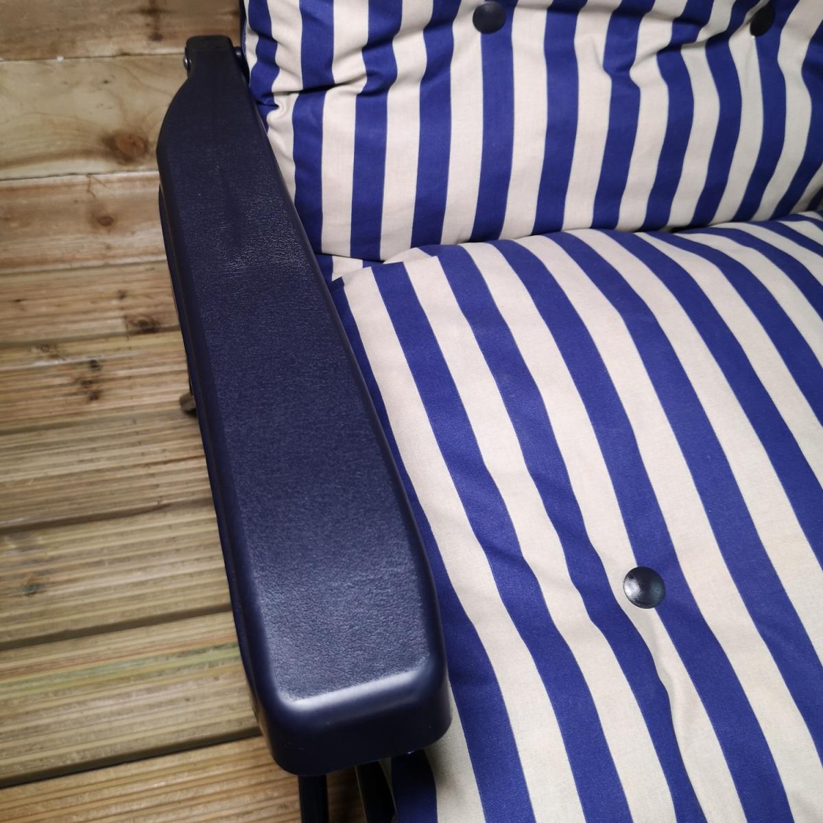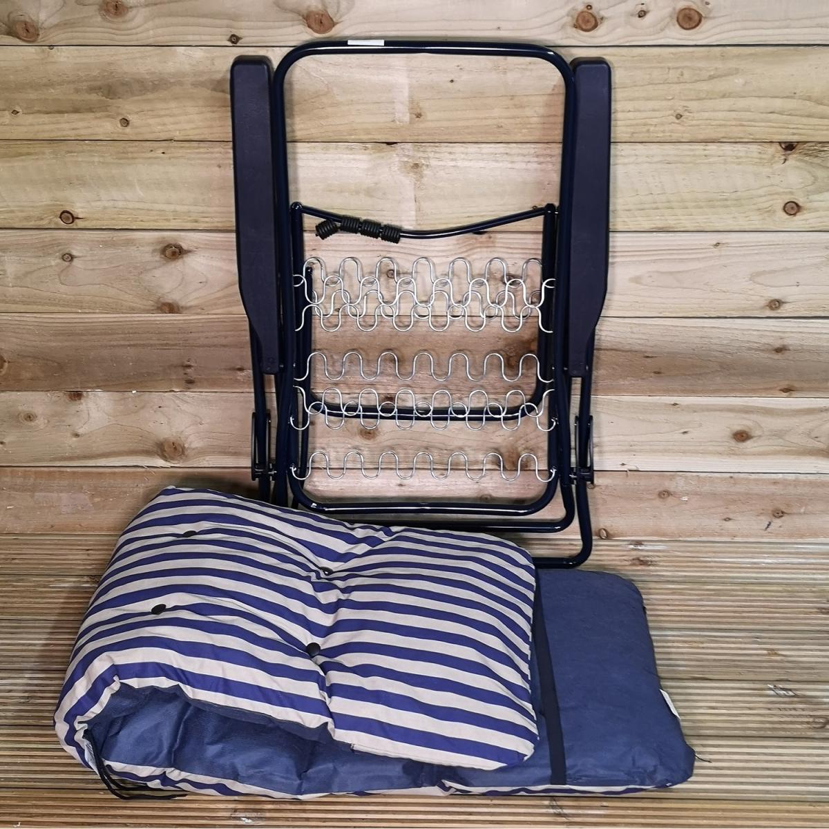 Sit back in comfort and feel your worries float away in this 7 reclining positions sun lounger. Navy tubular sprung frame with coordinated blue stripe design cushion. Cushion is made from cotton and polypropylene with a crumb foam filling - clean with a damp cloth and allow to fully dry. The lightweight and folding design means that the loungers are easy to relocate and store when not in use. This comfortable sun lounger will make a stylish and practical addition to your garden or other outdoor space.