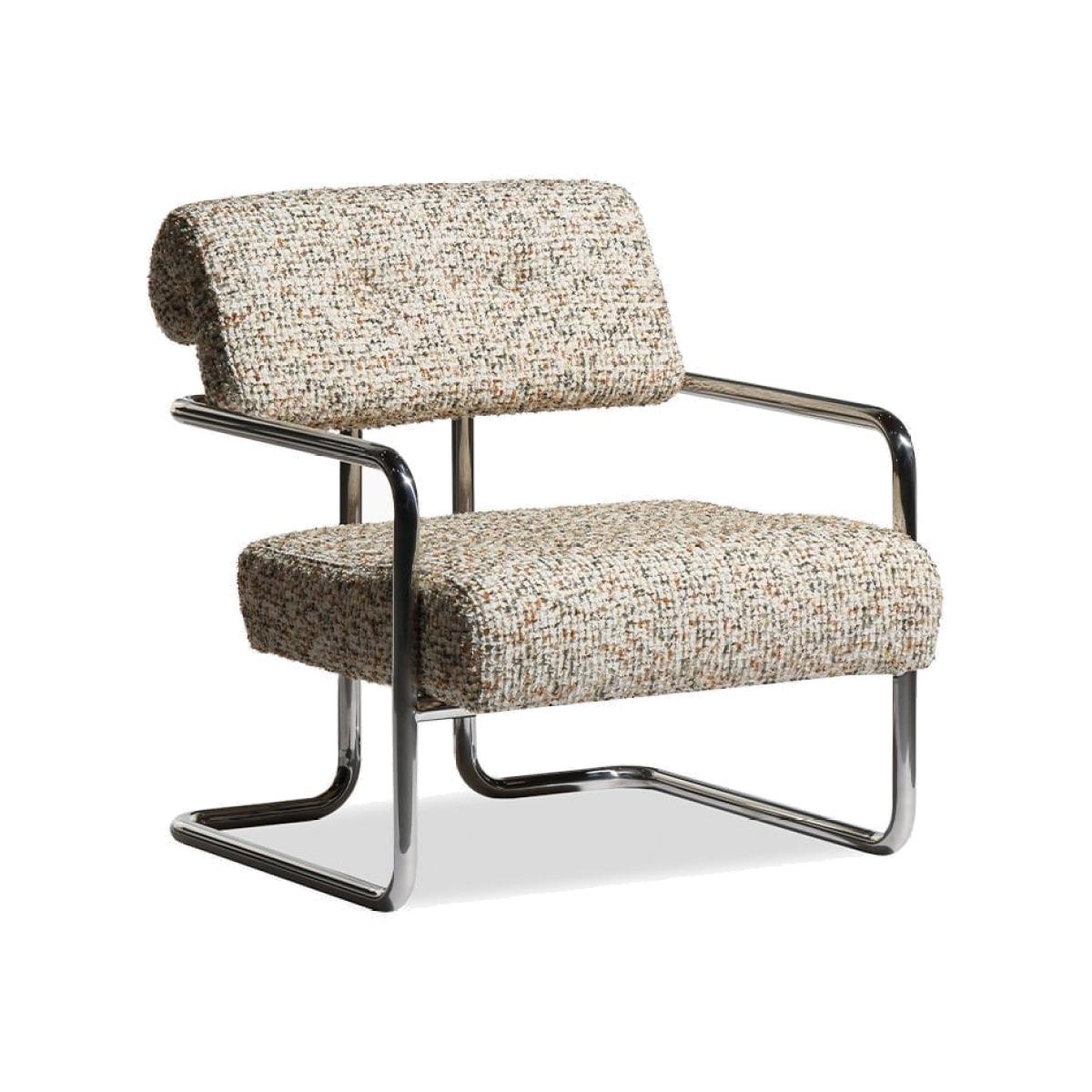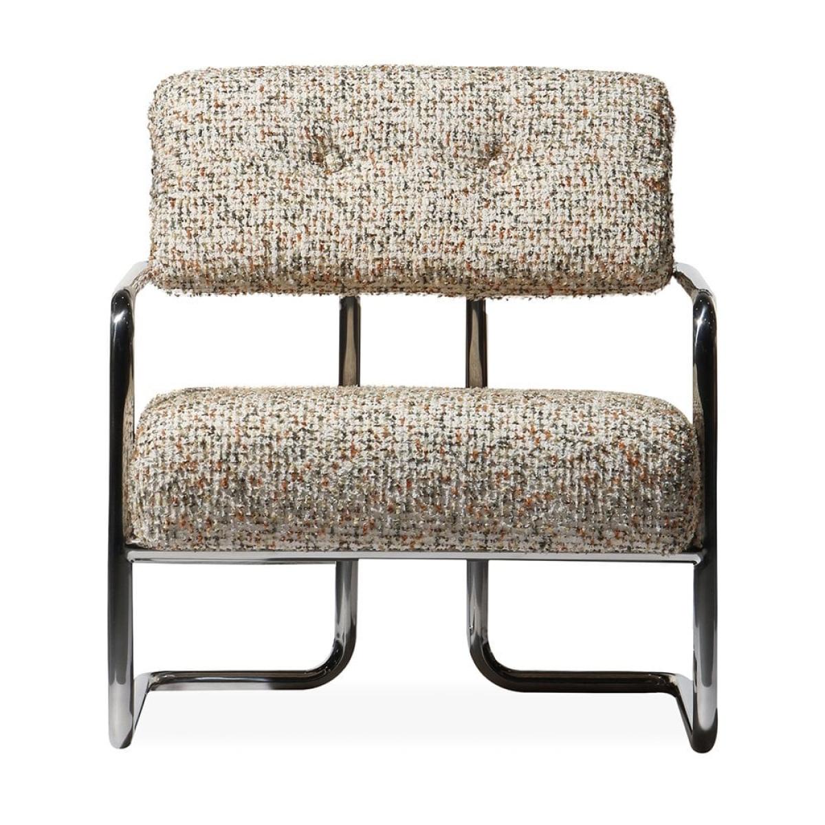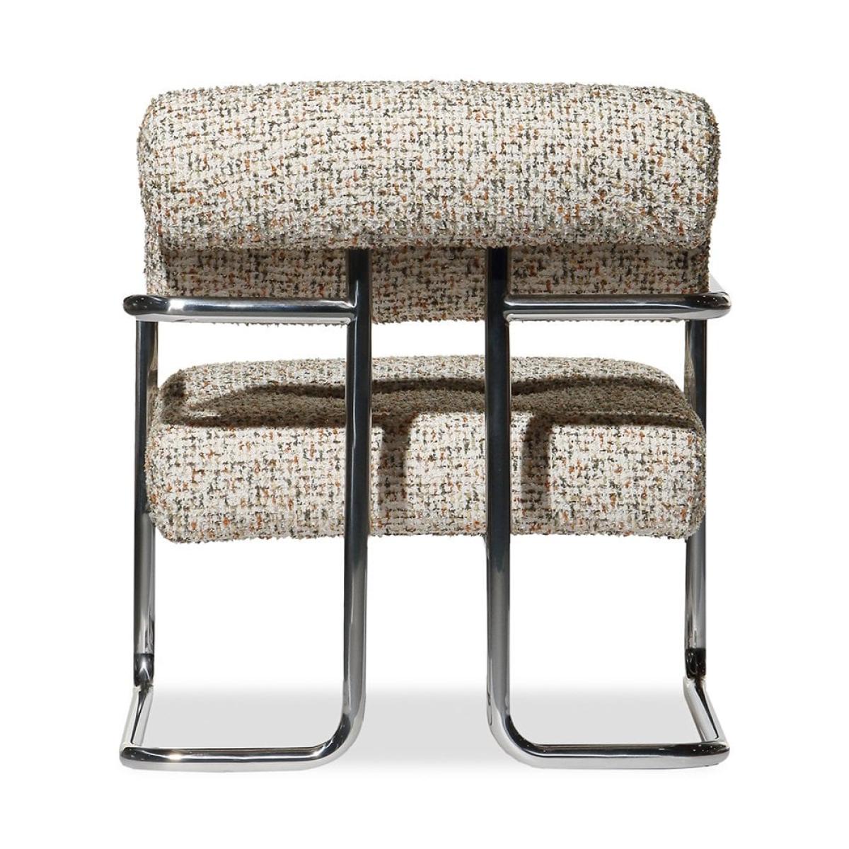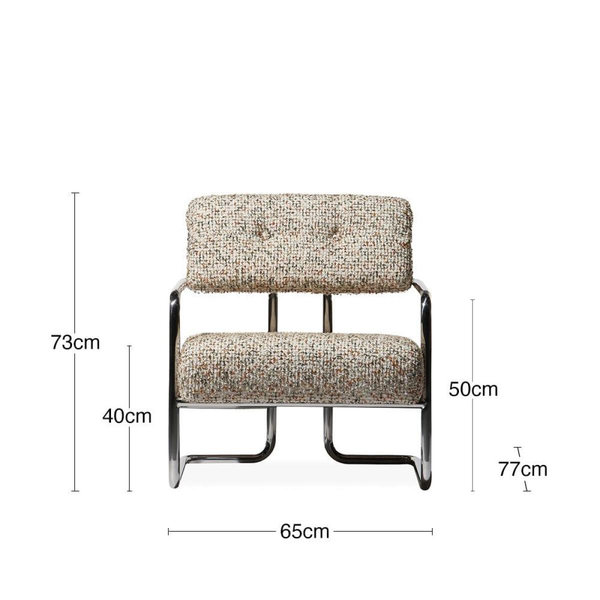 For refined Italian design, the Paddington Accent Armchair radiates the 70s and 80s Mad Men aesthetic. Taking inspiration from brutalism with its clean lines and muted colour palette, this exceptional armchair is created from premium materials including a curved chrome frame and soft nougat fabric with speckles of green, orange, and golden yellow intricately woven within. Each accent chair is hand-finished in this eco-conscious and ethically sourced design.