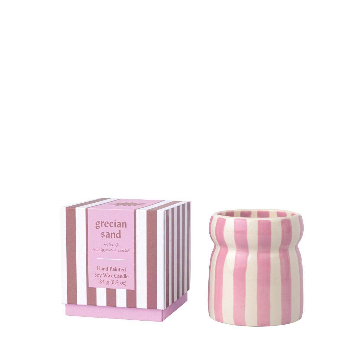 This little candle is perfect for adding a relaxed, beachy vibe to both modern and coastal interiors. I love it styled on a neutral tray alongside woven textures or with seaside-inspired accessories to enhance its Grecian Sand scent. Its soft pink and cream striped ceramic vessel works well in light-filled spaces, adding a touch of colour without overpowering. Practical styling tips include grouping it with other candles of varying heights for impact or placing it on a side table with a stack of coffee table books for a casual yet considered look. Its sizeable 439g offering makes it ideal for creating a warm, inviting atmosphere in living areas or bathrooms, especially if you’re aiming for a laid-back, Mediterranean feel.