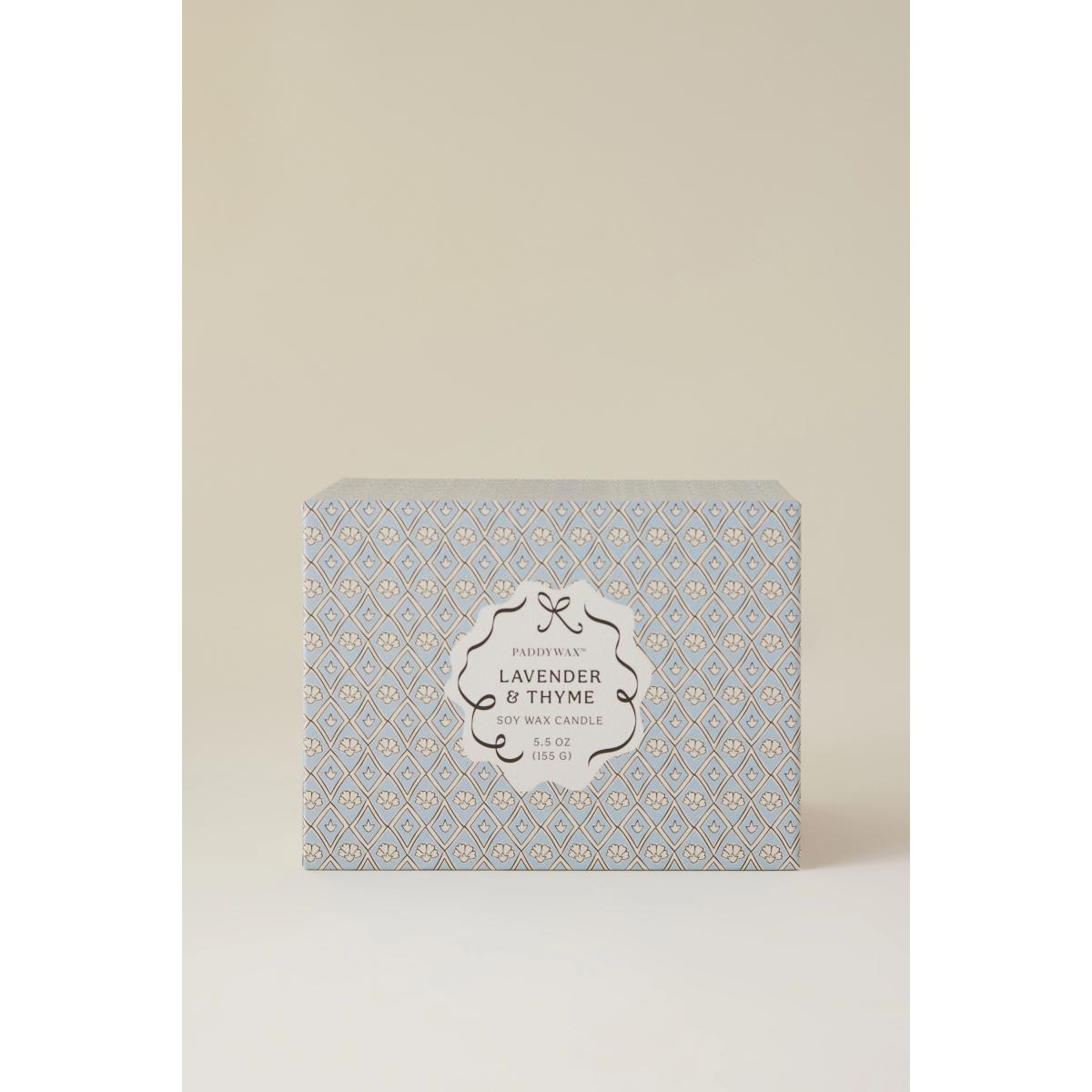 **Lavender Thyme:** Top Notes: Cyclamen Petals, Eucalyptus Leaves, Crushed Lavender Middle Notes: White Thyme, Blushed Peony, Wild Muguet Base Notes: Soft Musk, Vanilla Orchid, Tonka Bean * For the best burn experience, keep the following in mind:* * The first time you light your candle, allow it to burn until the wax pool melts all the way to the edge; for a larger candle, this may take several hours. Wax has "memory," so if it is extinguished with a partial pool, that will prevent a full, even pool from forming in the future. * Trim your wick each time you light the candle, removing any "bloom" from the previous burn. We recommend lighting a wick that is 1/4-1/2" in length. * Ensure that your candle is placed on a heat-safe surface. * Do not allow wick trimmings, dust, or other materials to accumulate in the wax pool. * To ensure safety and longevity, be sure to check the bottom of your candle for additional instructions, including details on when to discontinue use. * By Paddywax * 33-35 hour burn time * Soy wax blend; cotton candle wicks * Ceramic vessel and lid * Paper sliding box * Imported **Highlights:** * Hand-painted ceramic vessel with a scalloped lid, perfect for repurposing as a trinket dish