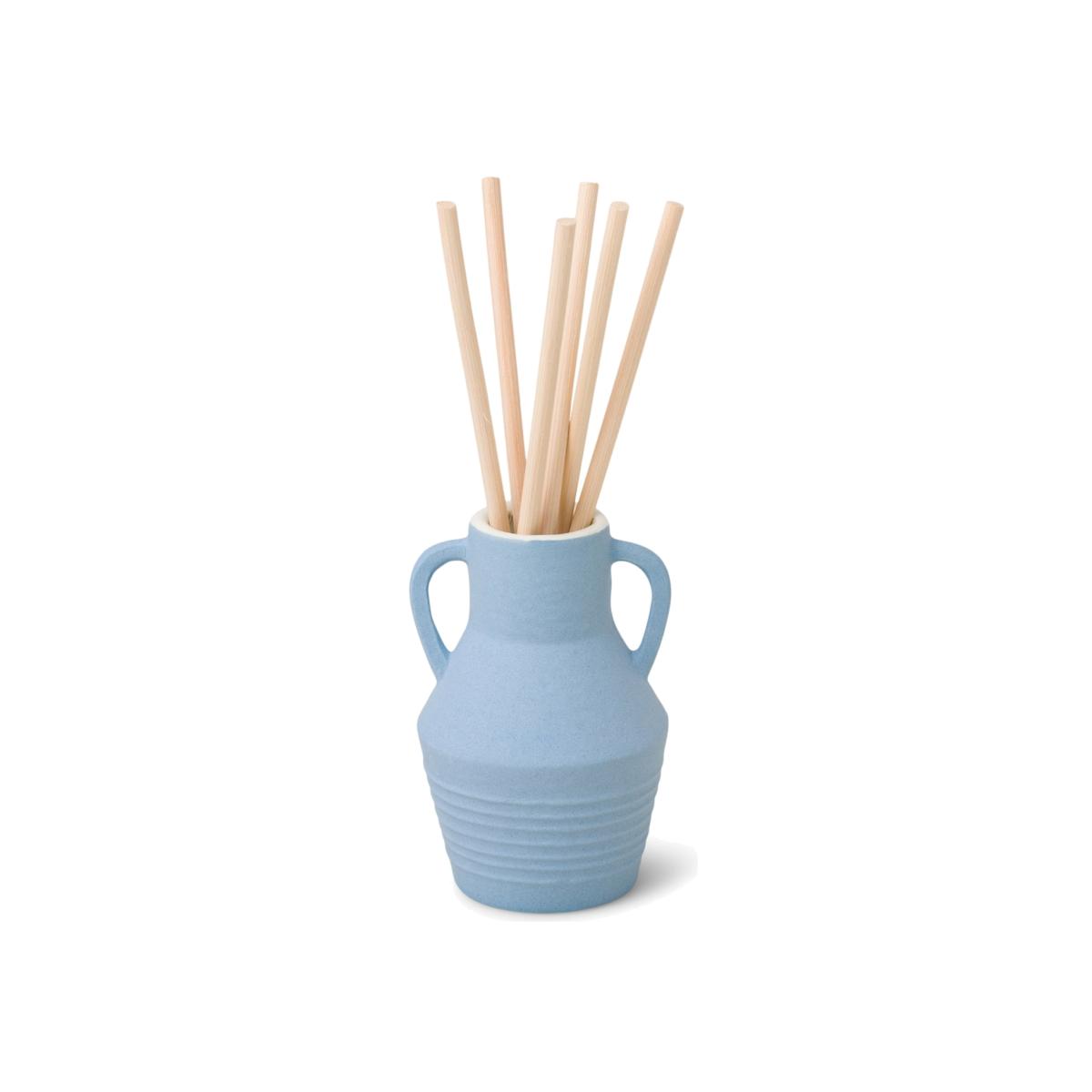 Escape to an island in the Aegean Sea with the Santorini collection. Influenced by timeless texture, this collection will transport you to a volcanic island of pure paradise. After enjoying the Santorini-inspired scents, these unique diffuser vessels can be repurposed as stylish storage vases. Top Notes: Orange, Lemon Blossom, Sea Salt Accord. Middles Notes: Jasmine, Rosemary, Thyme. Base Notes: Balsam, Cedar, Anise, Amber. Rosemary Sea Salt scent. Reed Material: Natural Wood Reeds. Includes Gift tube, ceramic diffuser, natural wood reeds, and 4oz scented oil. Gift boxed. 118ml capacity. Size H19.2, W6.5, D6.5cm. Diameter 6.5cm.
