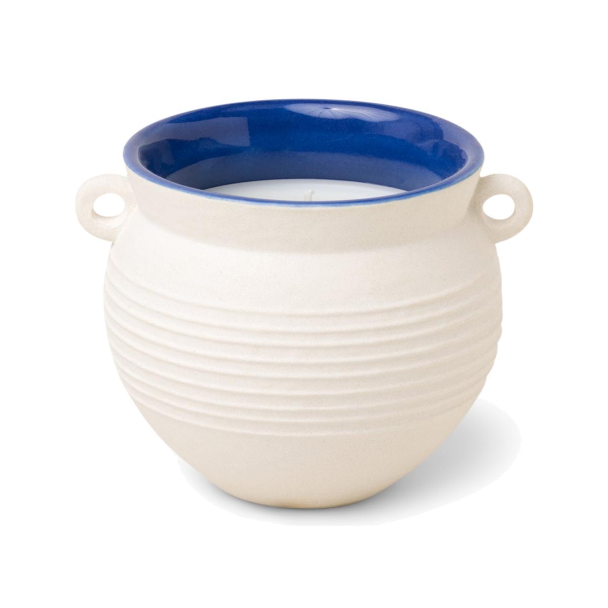 Escape to an island in the Aegean Sea with the Santorini collection. Influenced by timeless texture, this collection will transport you to a volcanic island of pure paradise. After enjoying the Santorini-inspired scents, these unique large vessels can be repurposed as stylish storage vases. Inspired by the textures, colours, and fragrances of Santorini. Textured ceramics with inspired details, ribbing and handle details that resemble pottery jugs. Glossy glaze on the inside with a different colour textured glaze on the outside. Repurpose as a catchall or planter. Cliff & Hinoki Wood scent. Soy wax. Approximate burn time 55 hours. Size H9, W12, D12cm. Diameter 12cm.