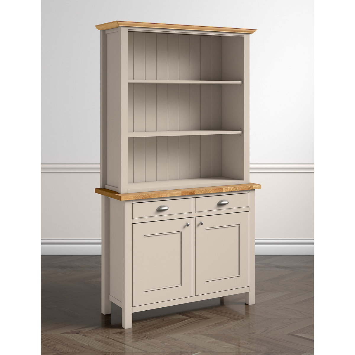 There's no reason why you can't have style and functionality, as this Padstow open top proves. Designed to be teamed with our two door sideboard, this top is constructed using sustainably sourced wood with a low-sheen lacquer used to enhance its endurance. Complete with a paint finish and featuring veneer tops of natural oak, two shelves help create three distinct sections, maximising storage space, ideal for storing kitchen crockery or living room books and games.