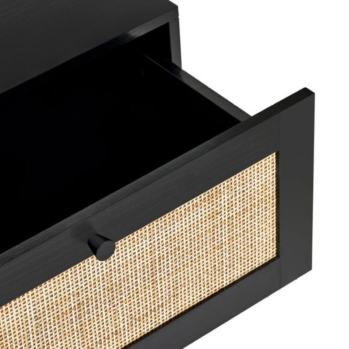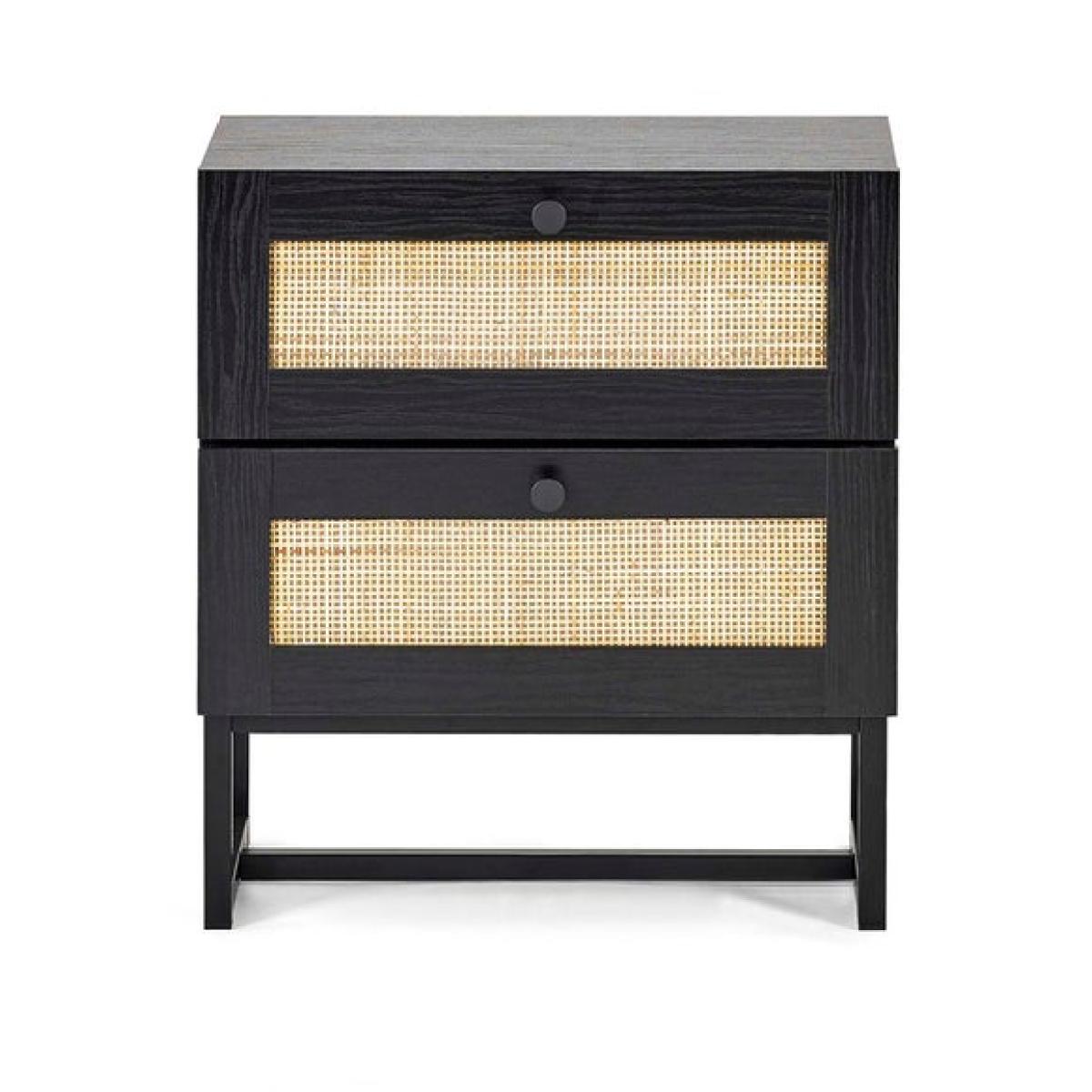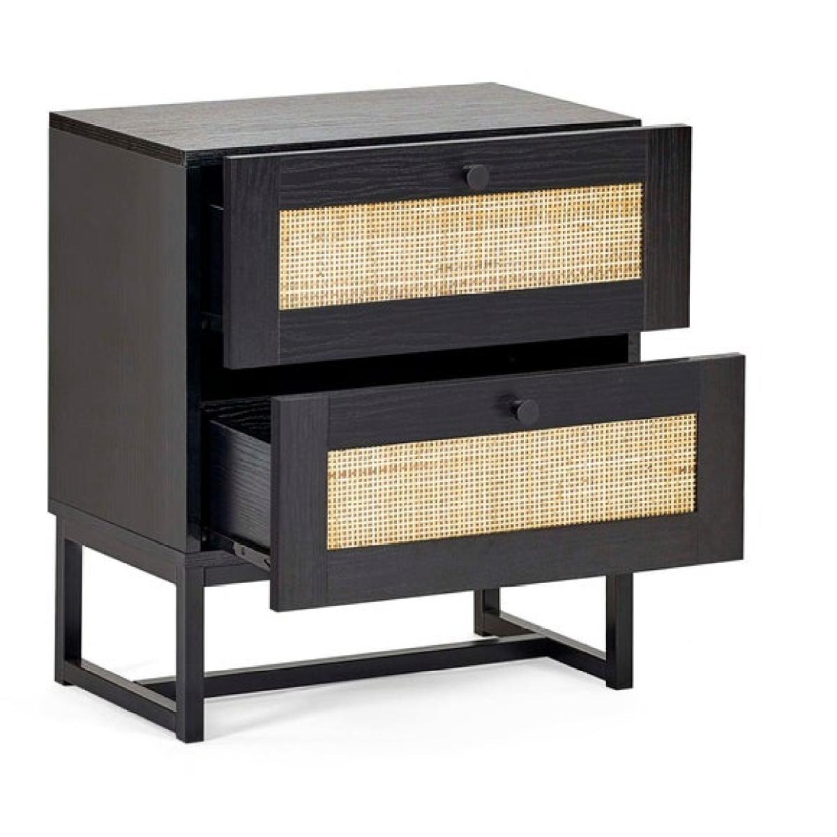 * Modern bedside table * Rattan front * Industrial-style base This bedside table combines practical storage with a stylish design. It features two drawers that provide space for your nighttime essentials, helping you keep everything close at hand and neatly organised. The natural texture on the drawer fronts adds a unique touch, while the sturdy base ensures durability.