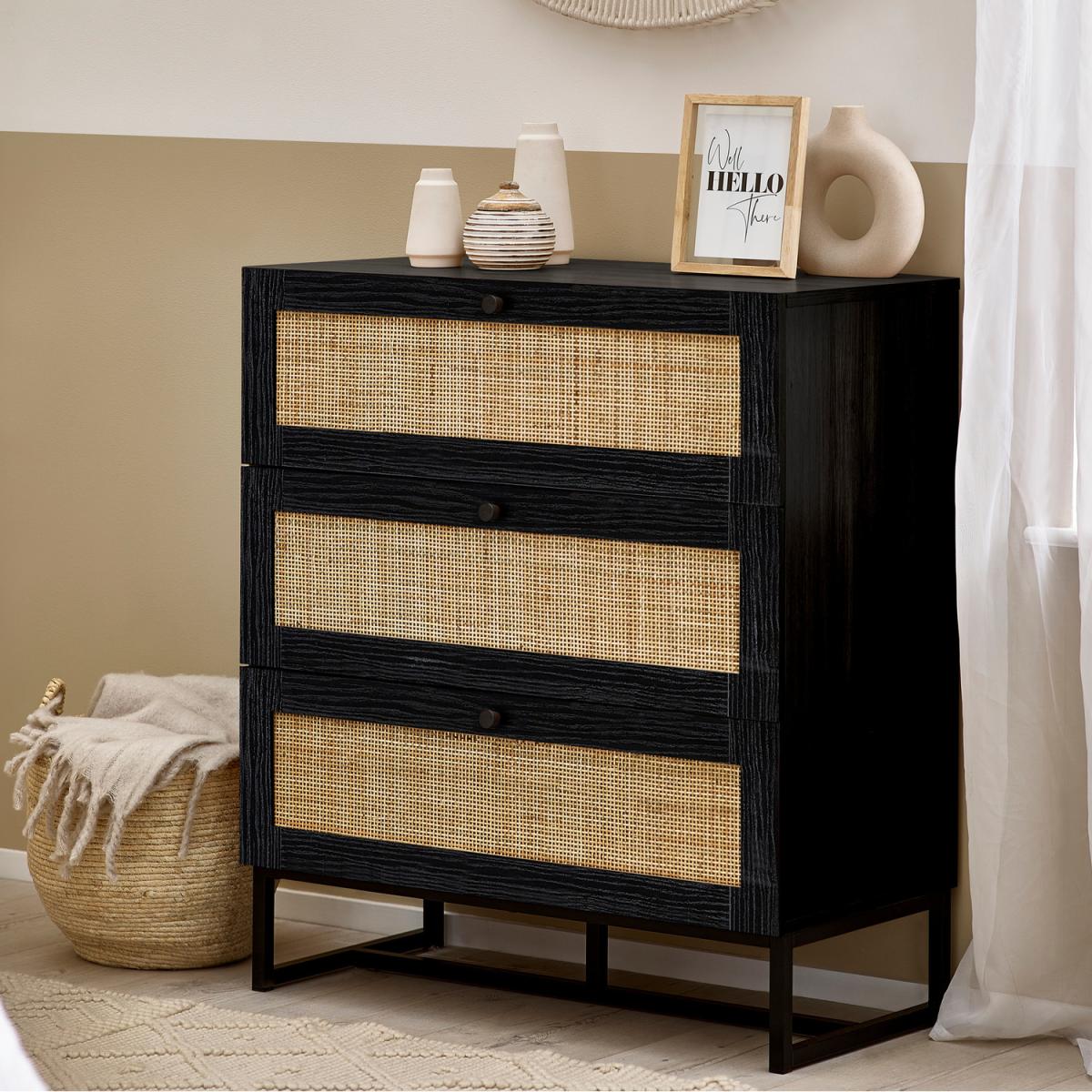 I’m a fan of this three-drawer chest for its mix of matte black timber and natural cane fronts - it adds texture without overpowering a room. Its clean lines suit Scandi, contemporary and coastal schemes equally, slotting in as a bedside table, hallway storage or beneath a living-room mirror. Styling-wise, keep the top simple: a low vase of foliage, a stack of books and a small table lamp bring balance. Pair it with light walls and muted rugs to let the contrast sing, or use richer tones - deep greens or terracotta - to emphasise its modern-farmhouse edge.