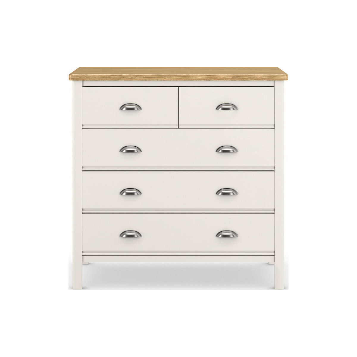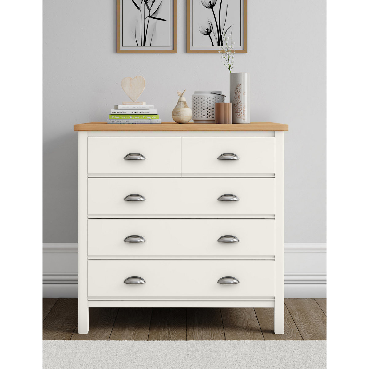This lovely Padstow chest of drawers will improve your space and add some visual panache wherever you put it. Stylish and functional, this chest of drawers features a total of five drawers for all of your folded clothes and personal belongings. The overhanging wood coloured top contrasts wonderfully with the base, and the curved legs add additional visual interest. Masterfully crafted with sturdy oak, this chest also features a low shine veneer finish for added durability. We're so confident our furniture is built to last, our industry-leading guarantee covers any manufacturing failure on all furniture. That's our promise, and why our furniture comes with a 10-year guarantee that you can trust. Excludes: outdoor furniture and any issues that are a result of normal wear and tear, improper care or accidental damage.