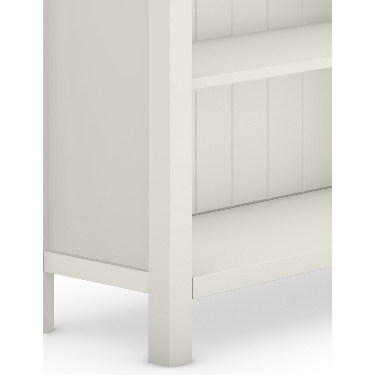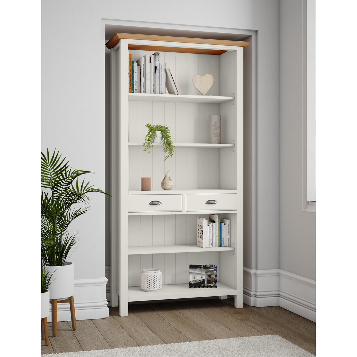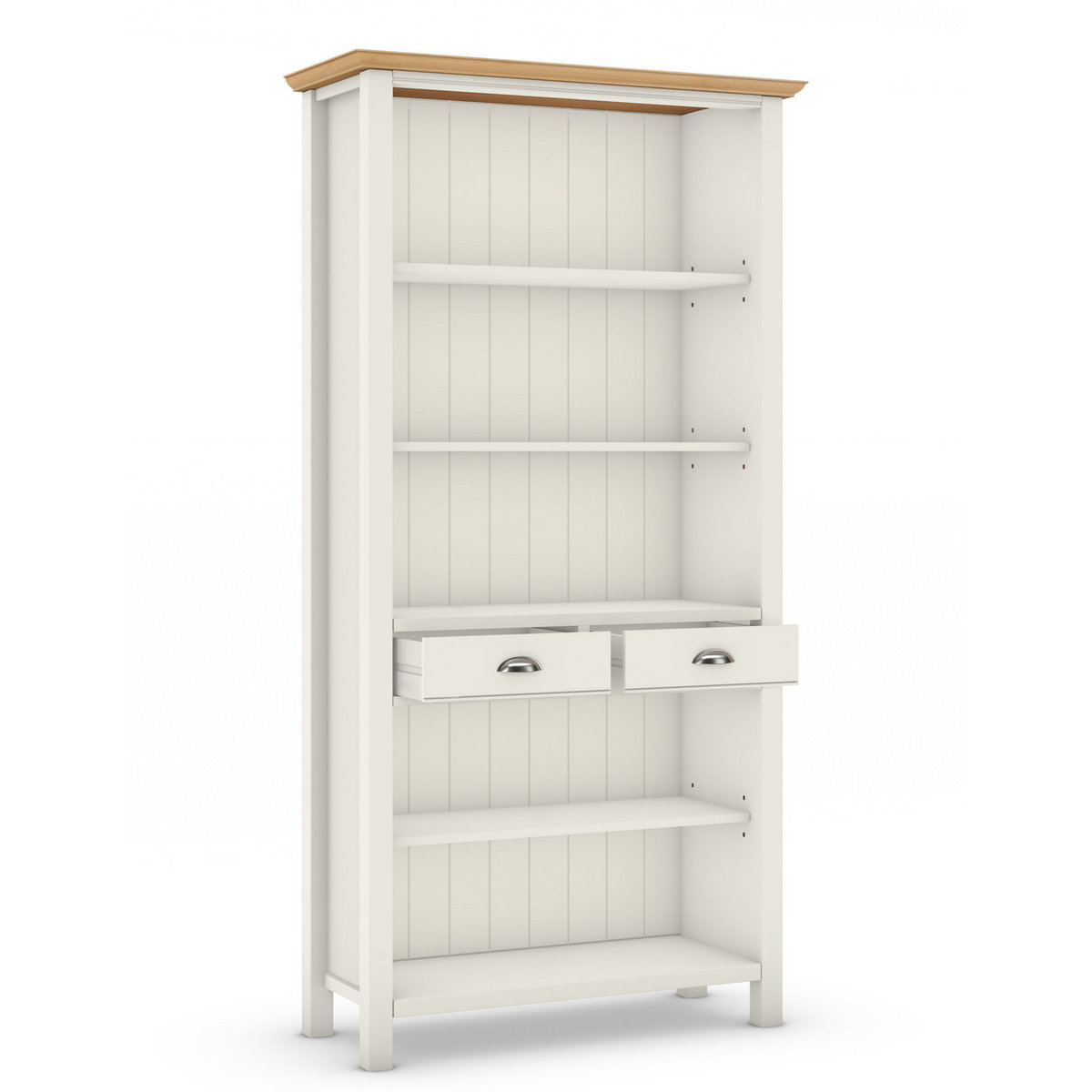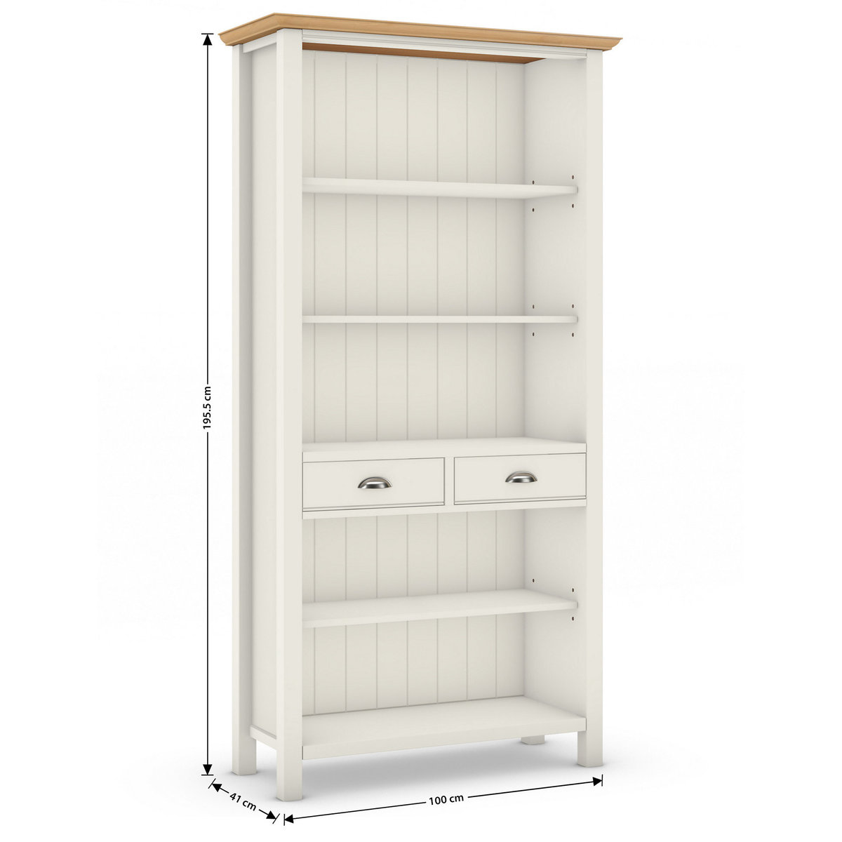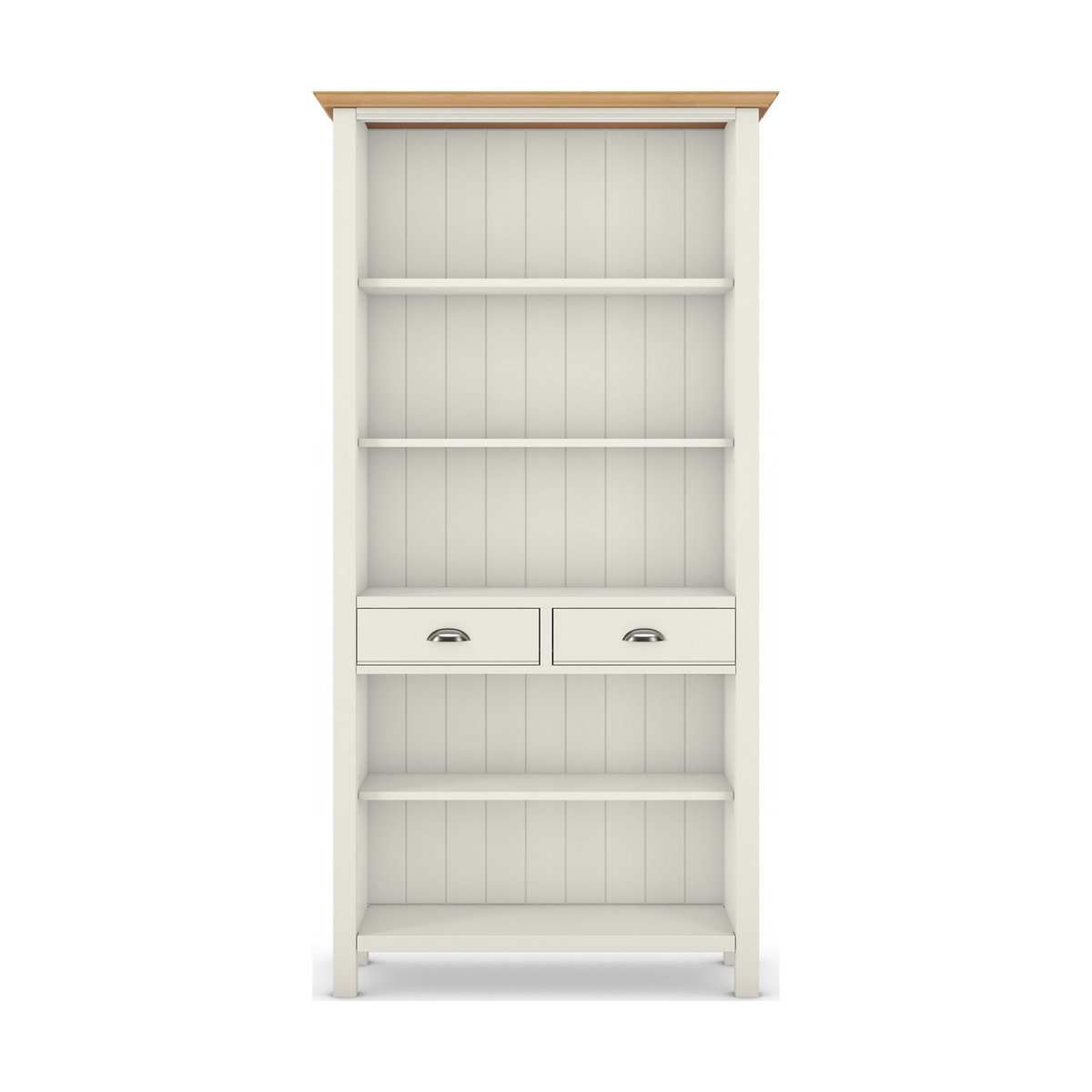 Introduce a rural aesthetic to your home with this superbly crafted Padstow bookcase. Clean-lined and contemporary, it's fitted with plenty of shelves to store your favourite books and two handy drawers for keeping knick-knacks in. Designed in a neutral ivory hue with a complementary natural oak veneer top, it's ideal for any setting. A protective low-sheen lacquer gives this piece a durable finish. Find coordinating designs in the Padstow range. We're so confident our furniture is built to last, our industry-leading guarantee covers any manufacturing failure on all furniture. That's our promise, and why our furniture comes with a 10-year guarantee that you can trust. Excludes: outdoor furniture and any issues that are a result of normal wear and tear, improper care or accidental damage.