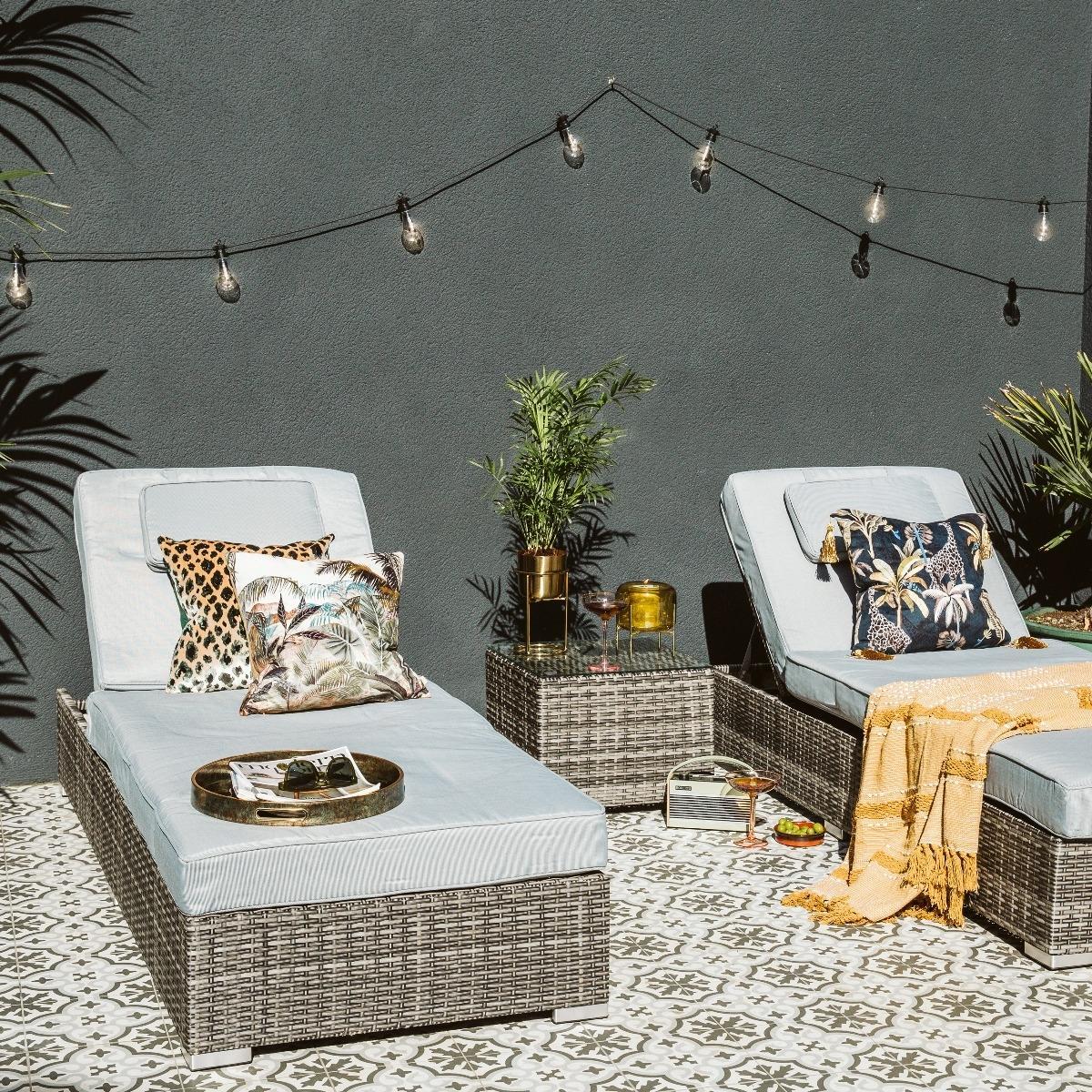 Design. For deluxe lounging, our Padstow Garden Sun Lounger Set. Will bring modern. Glam. To your outdoor space. The two. Sun loungers. Have. Adjustable backrests to find the right angle for. You, and. Includes a side table to place. Refreshments. The super. Cosy cushions are foam and fibre filled to ensure that whichever position, you are supported. Made from a durable rattan weave, this item is easy to maintain. With removable. Cushion. Covers. For easy cleaning. , with a lightweight aluminium frame. To allow effortless movement.