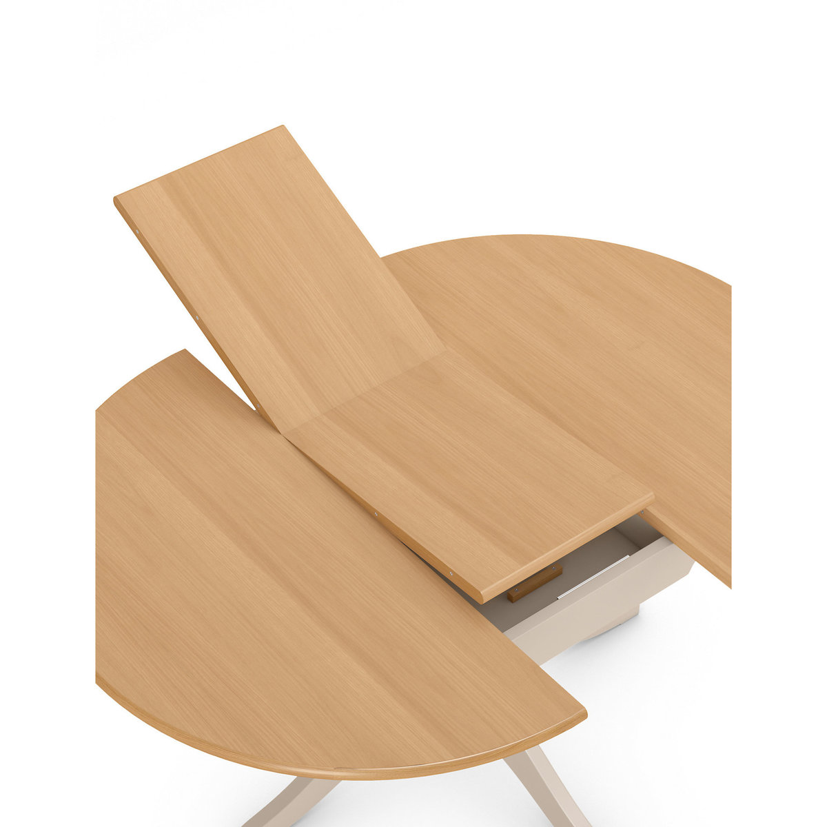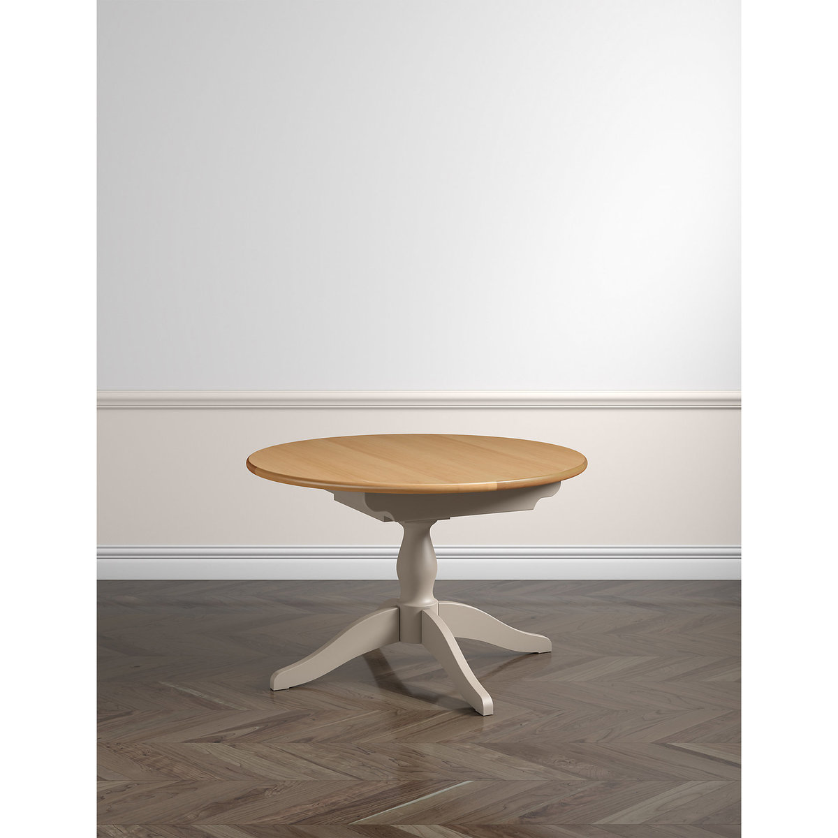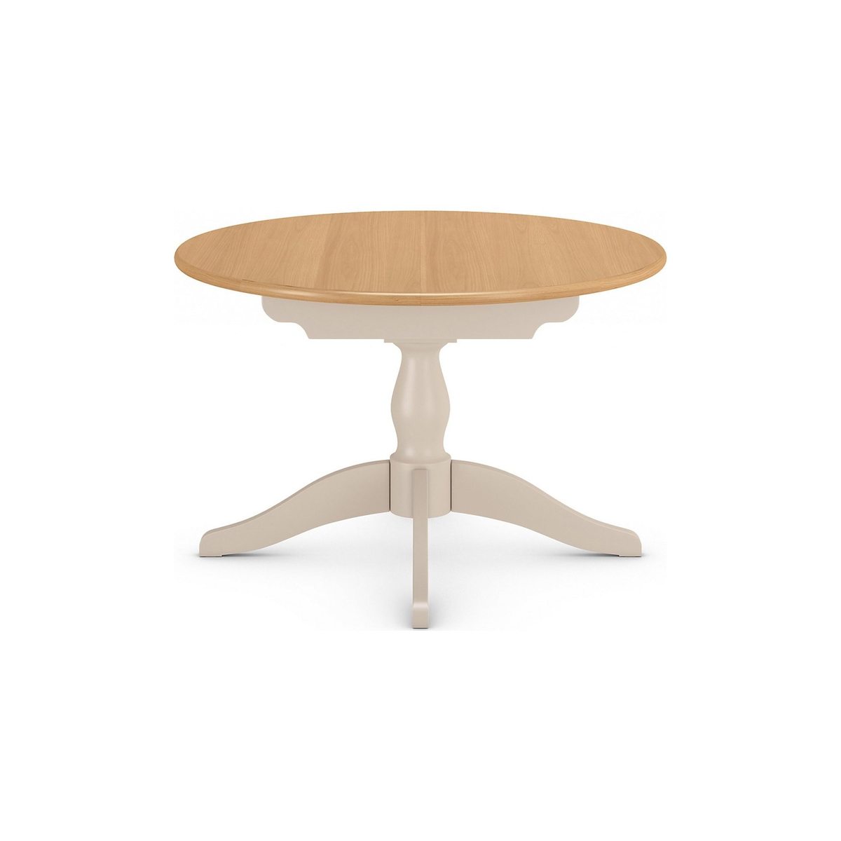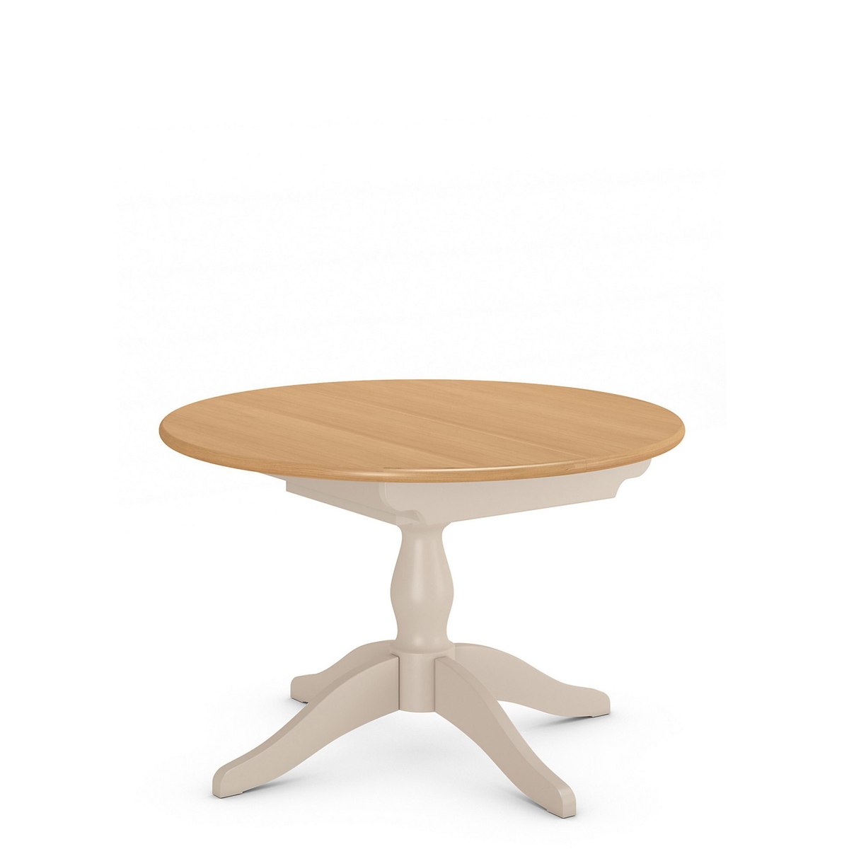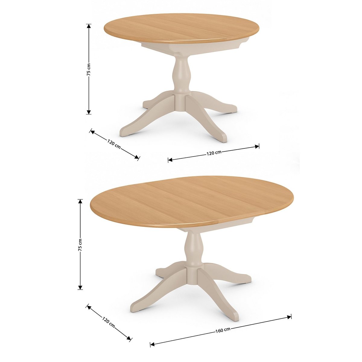 Sure to be the envy of any dining room, this Padstow extending round dining table is as elegant as it is functional. Constructed using responsibly sourced wood, this table comes with solid oak veneer tops and a painted finish for a sleek, stylish centrepiece. Able to seat between four and six thanks to the extension leaf stored under the table top, this extended dining table also has a low-sheen lacquer to keep the wood strong and looking beautiful."}