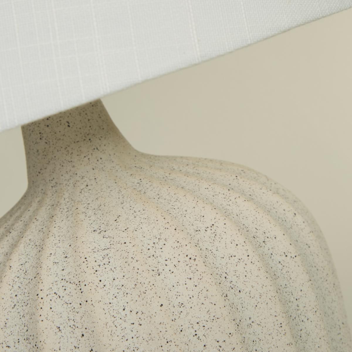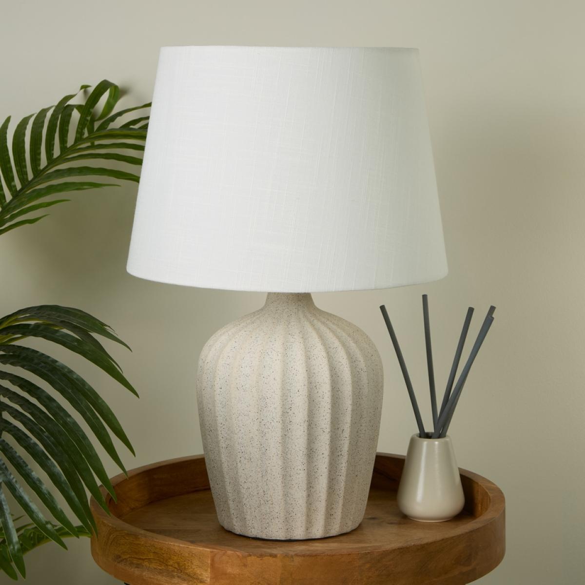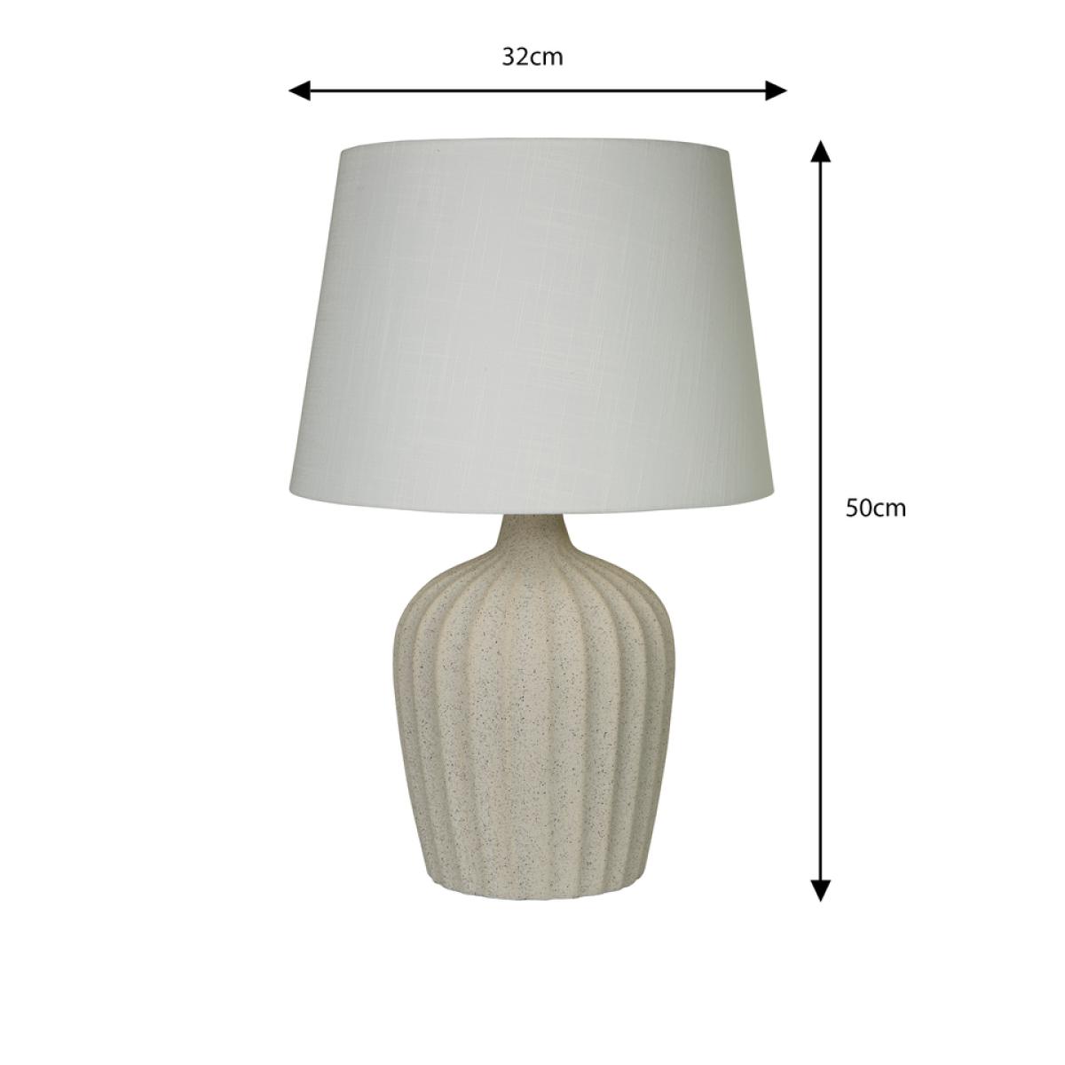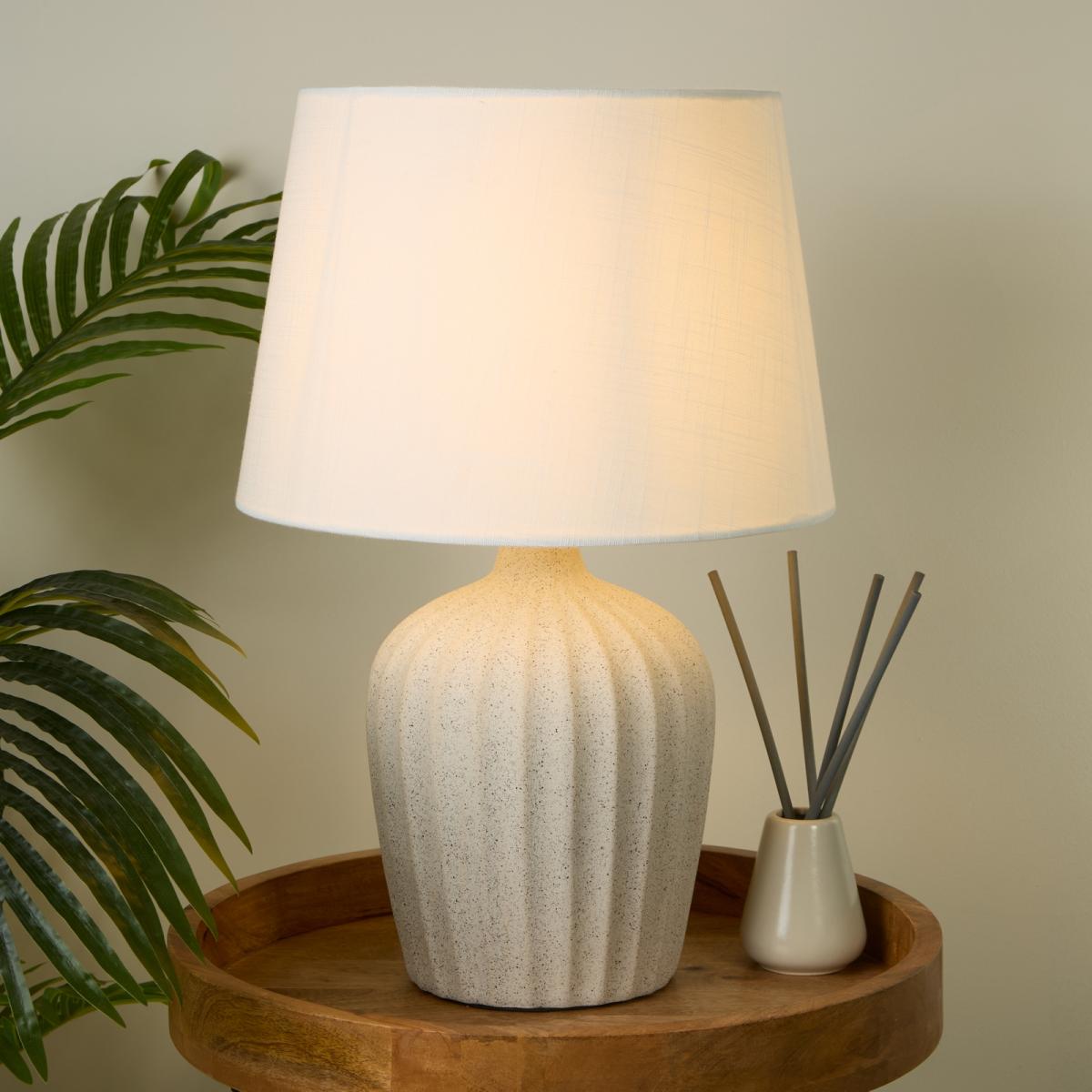 This table lamp exudes sophistication with its beautifully ribbed stone base, capturing the essence of contemporary design. The crisp cream shade adds a touch of lightness, creating a perfect balance for any room.