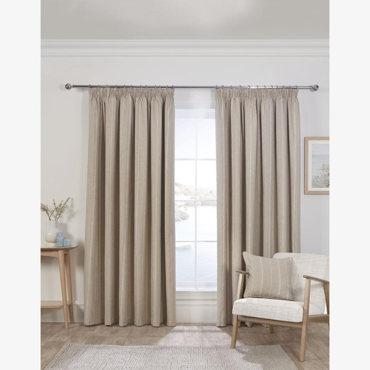 Enhance comfort and style in your space with the Padstow Thermal Curtain. Featuring a subtle stripe design in a coastal style, this curtain combines elegance with functionality. With its thermal blackout construction, the curtain blocks out light and helps regulate room temperature. It keeps your room cool in summer and warm in winter.