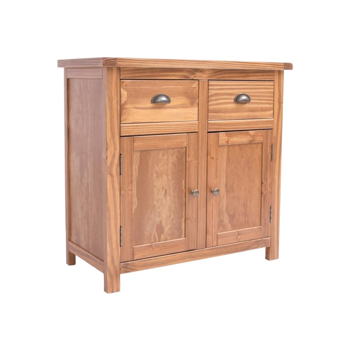 Our Padua collection has a simple but pleasing design and is produced by our skilled craftsmen to the highest standards using responsibly sourced solid wood and veneers. All items are made using a combination of solid pine wood and veneers and are carefully hand-finished in a light brown colour using a high-quality eco-friendly water-based lacquer. The Padua 2 door 2 drawer sideboard is the perfect cabinet to fit in small spaces, but still offers plenty of storage space for all your needs. It offers 2 deep drawers made with a solid wood frame and it comes with a choice of 2 different handles. The top has a 3cm thick solid wood frame, making it extremely sturdy. The cabinet compartment has a single shelf, which can be removed if required to fit larger items. Added to these features is a simple construction for easy home assembly, making it a great value product to be taken home today.