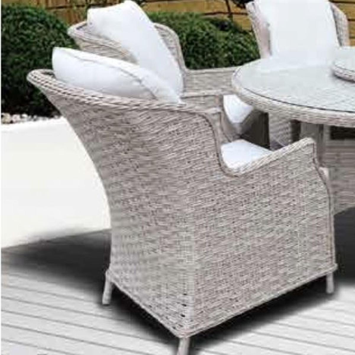 This stylish outdoor furniture set features a durable aluminium frame combined with wide synthetic wicker and full round synthetic wicker decor for a modern, elegant look. The cushions are crafted with UKFR compliant 230gm spun polyester fabric and include 6cm thick piped seat cushions for enhanced comfort. A 5mm tempered glass table top adds a sleek finish and includes a convenient parasol hole, making it both functional and attractive for any garden or patio setting. Pagoda Chambery Beige Deluxe Set - Grey