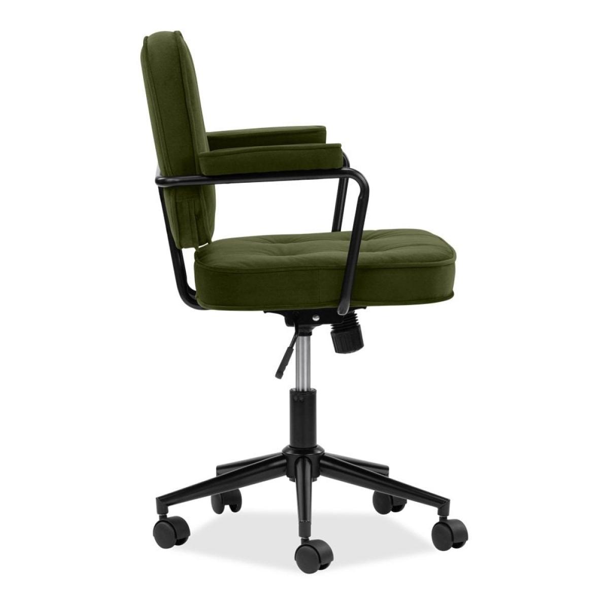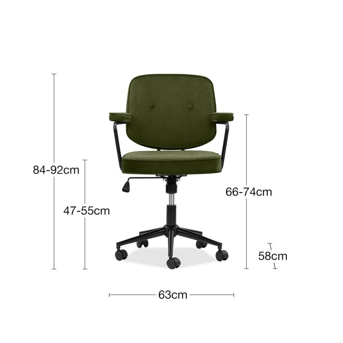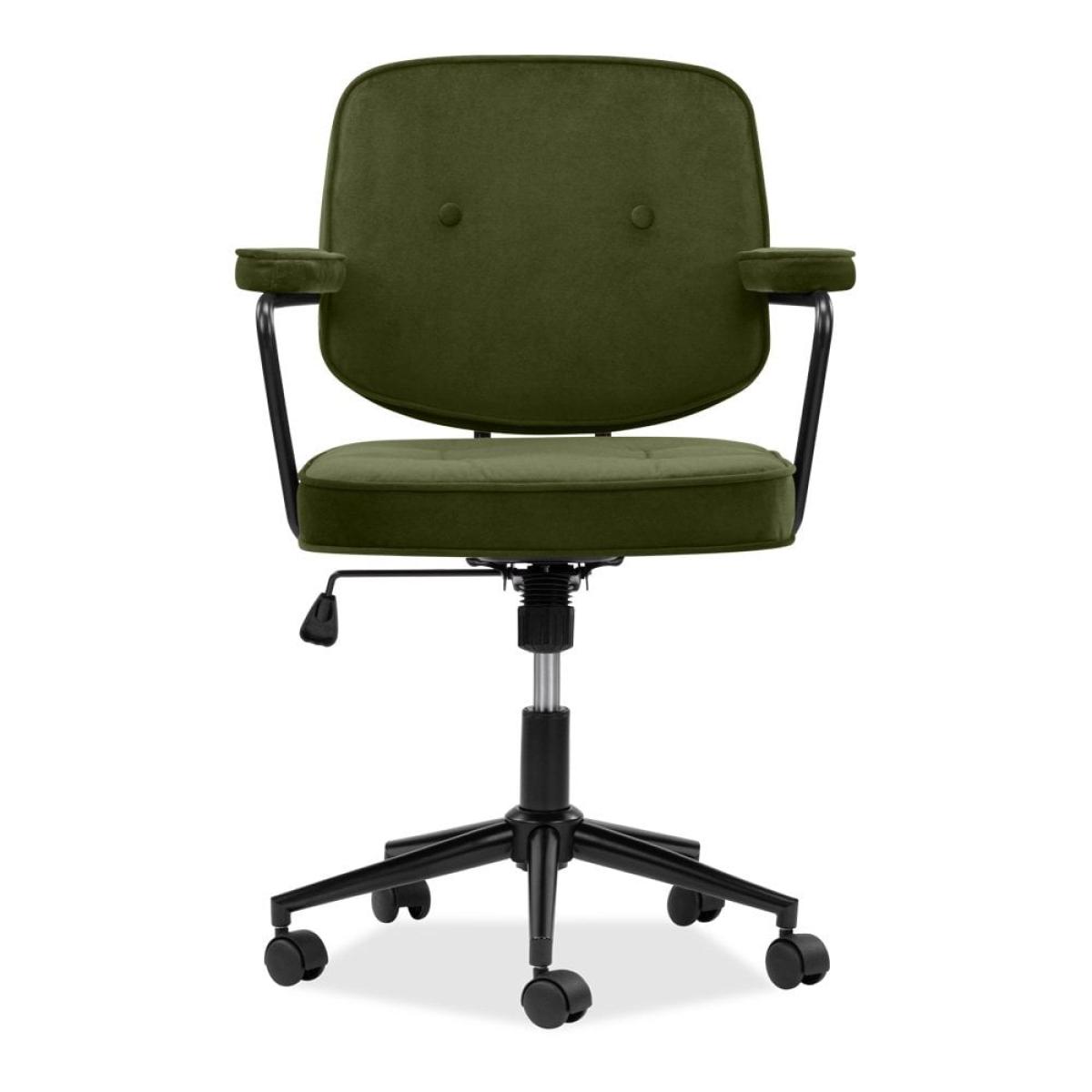 I love this office chair for its rich olive green velvet, which adds a touch of luxury and warmth to any workspace. It works particularly well in both contemporary and vintage-inspired interiors, where its colour can be complemented with brass or wood accents. Practical styling tips include pairing it with a sleek glass or wooden desk to keep the look modern, or contrasting with cosy textiles like textured throws or patterned rugs for a more eclectic feel. Its sustainable fabric also makes it a thoughtful choice for those looking to incorporate eco-friendly elements into their home office. Overall, this is a versatile piece that combines comfort with stylish appeal.