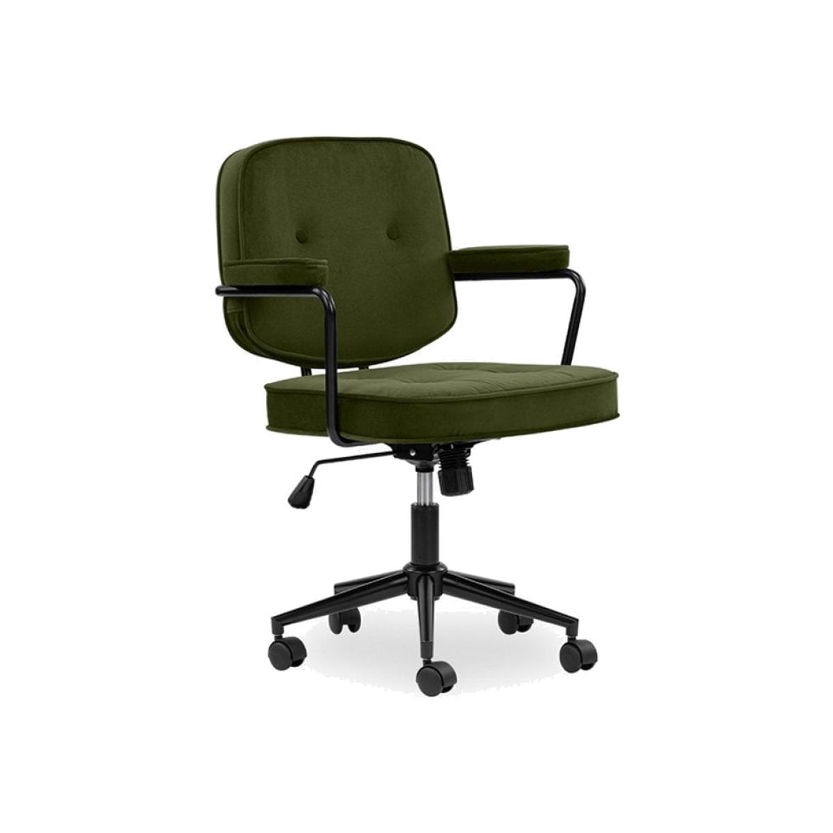 Incorporating mid-century elements into the home office work space. the Paige Office Chair Range features that classic button design on the padded upholstery. In luxe olive green velvet, with padding on the armrests, the Paige is a no-brainer when it comes to comfortable office chair design. Note the easy height adjustment, swivel function, and five wheels. For a rich depth of colour and unique softness, our velvet used in this chair is not only of the highest quality but it is made from 100% recycled PET yarns so it is kinder to the environment too.