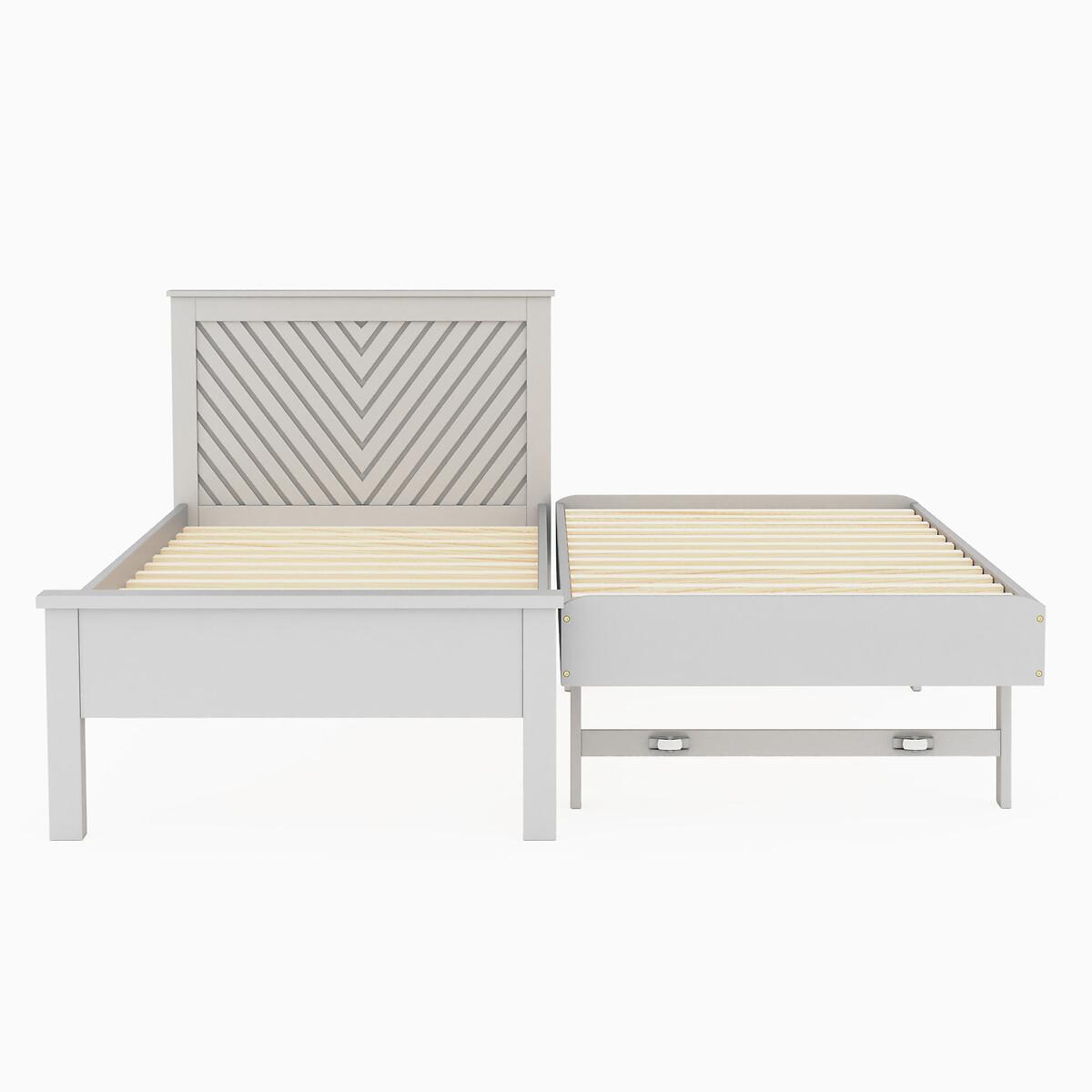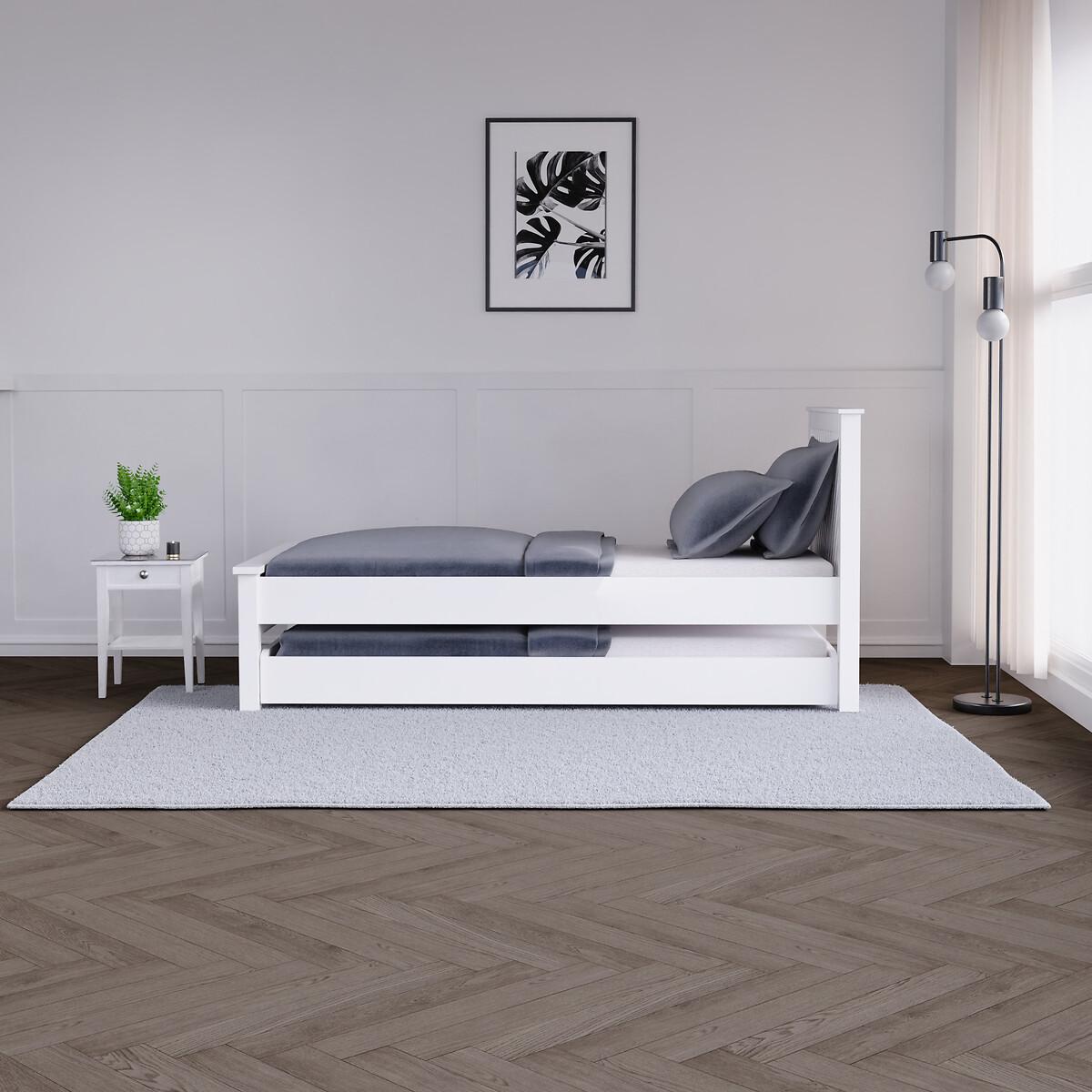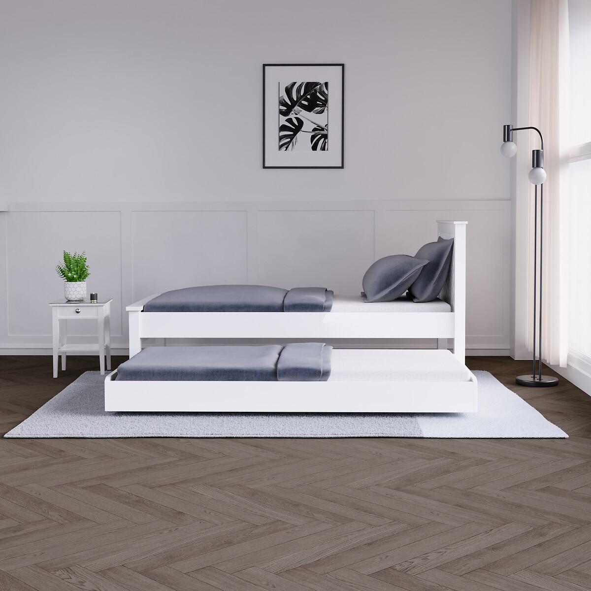 Perfect for sleepovers, this bed features pull-out full size single trundle bed making it easy to acocmodate extra guests. A slatted wood base allows air to circulate under the mattress, keeping it fresh and hygienic, whils a solid hevea rubberwood frame provides strength and durability. The chevron style headboard makes this a stylish addition to any bedroom. Product Details White Painted FinishPull- Out Trundle Bed(Single Size)Chevron Style Headboard Rubberwood Frame Mattress Not Included Supplied With Slatted Base Max Mattress Height For Trundle Pull-Out Bed: 16cm Assembly Required. Product Dimensions. Single: 206 cm x 100 cm x 100 cm , Weight - 56 KGParcel Dimensions. Single: Parcel 1 Packaged Dimensions - 125 cm x 109 cm x 8 cm, Weight 25.5 kg Parcel 2 Packaged Dimensions - 203.5 cm x 32.6 cm x 13 cm, Weight 18 kg Parcel 3 Packaged Dimensions - 198.5 cm x 30 cm x 9.5 cm, Weight 18 kg. This product will be dispatched by one of our trusted suppliers. You’ll be contacted by their selected courier about your delivery. Please note: this product cannot be delivered to all Offshore Islands, Northern Ireland or Republic of Ireland. KYOTO01