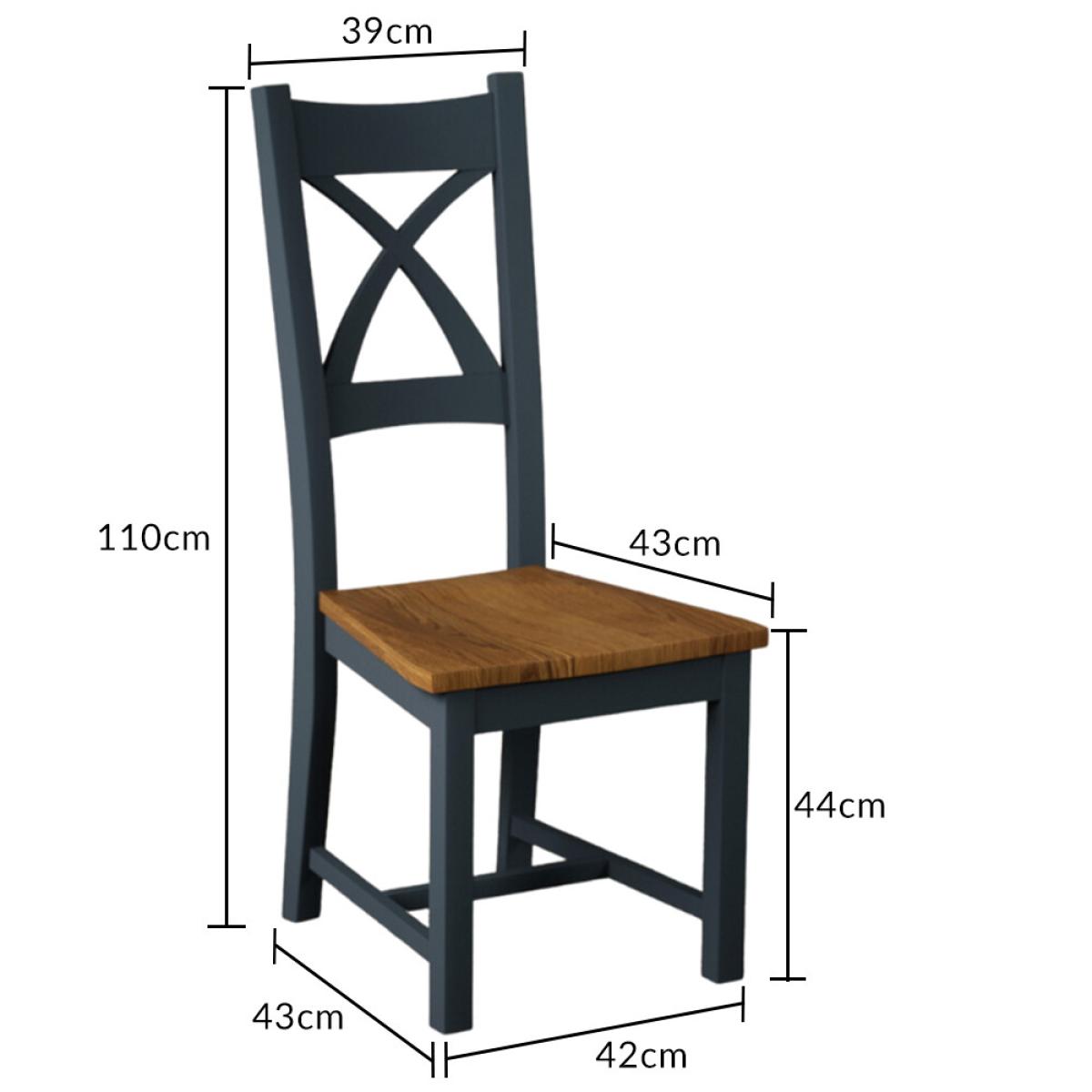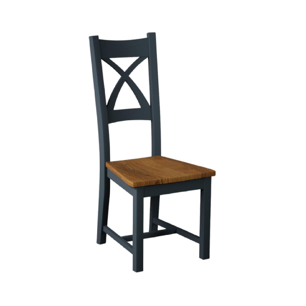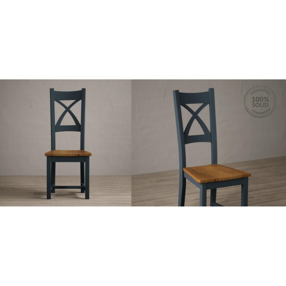 The Painted Dark Blue X Back Dining Chairs with Rustic Oak Seat Pad are crafted from 100% solid hardwood with a painted finish, complete with a comfortable oak seat pad.