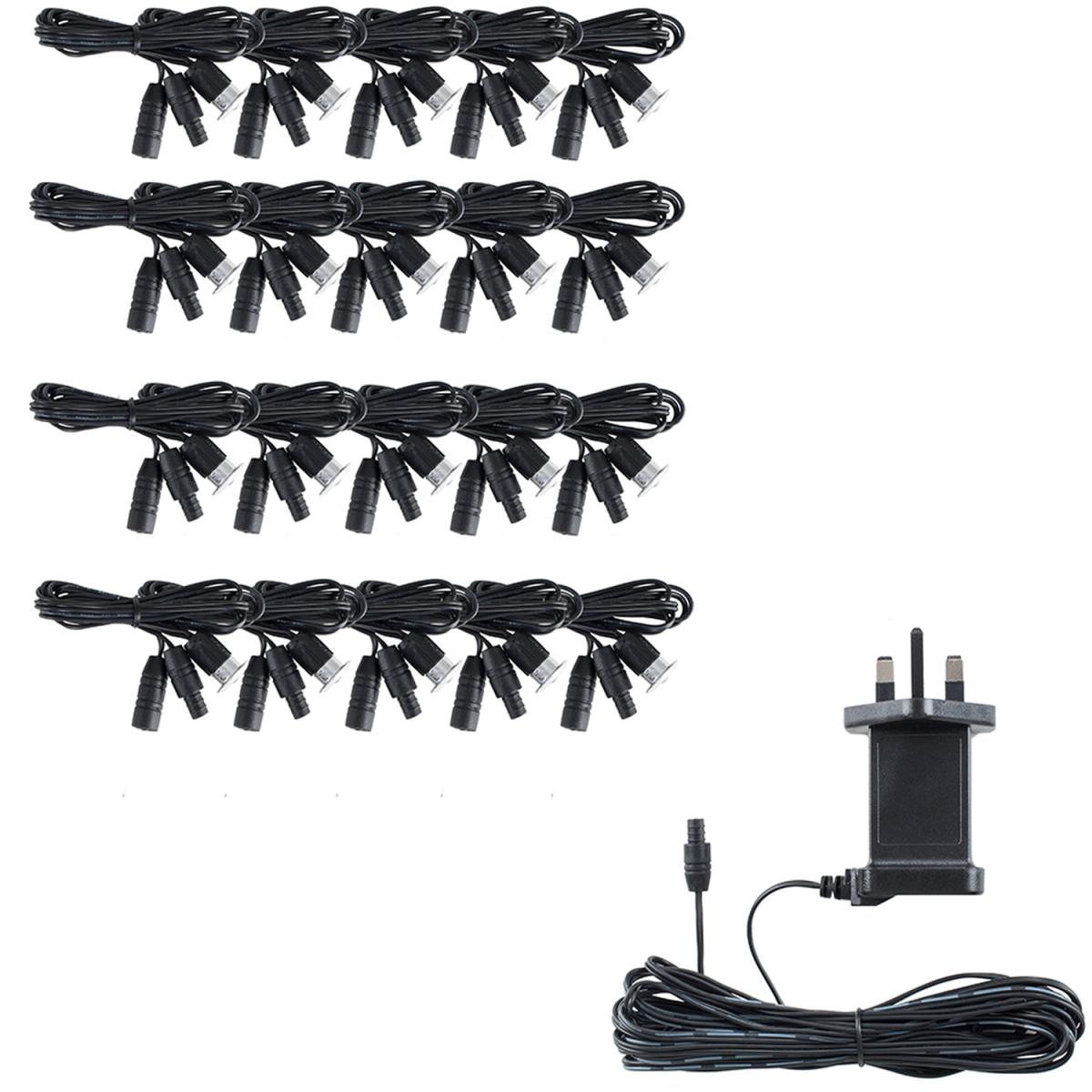 Complete Stainless Steel Decking Plinth Lights Kit. Includes all bulbs, cables, and connections. Update your garden with these fantastic lights. These white LED's light up your decking beautifully. IP67 outdoor rating. This kit contains 20 x 15mm LED decking lights (1m of cable between each light). 1 x transformer with 2m of cable to 3 pin plug for indoor connection to mains power. 5m cable from transformer to first light.