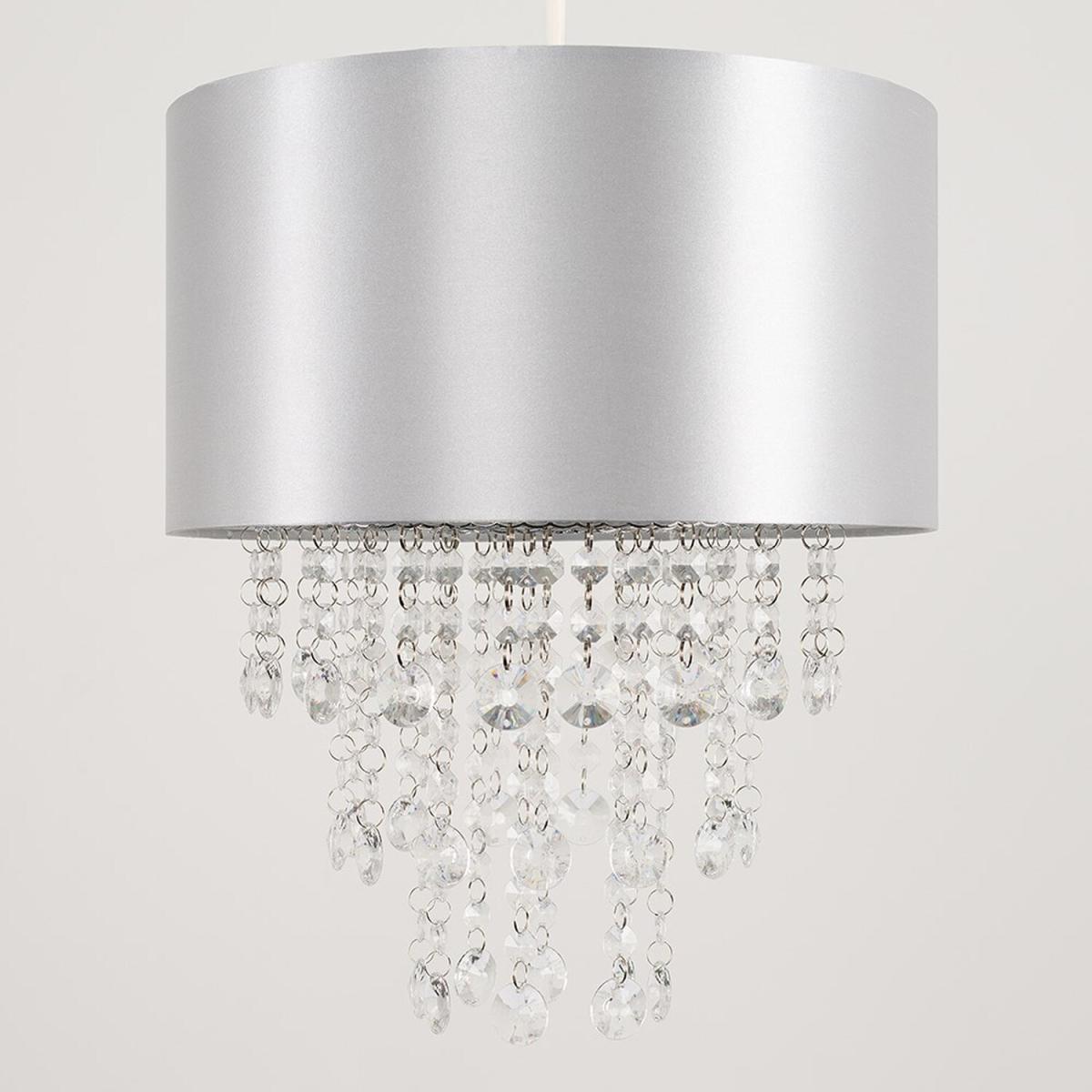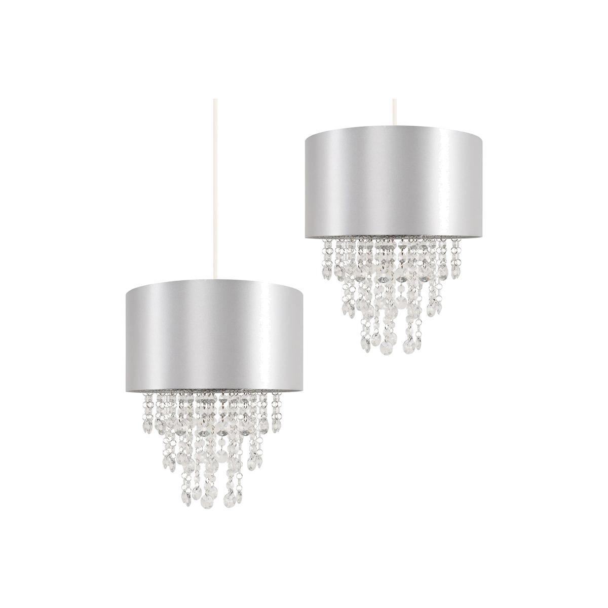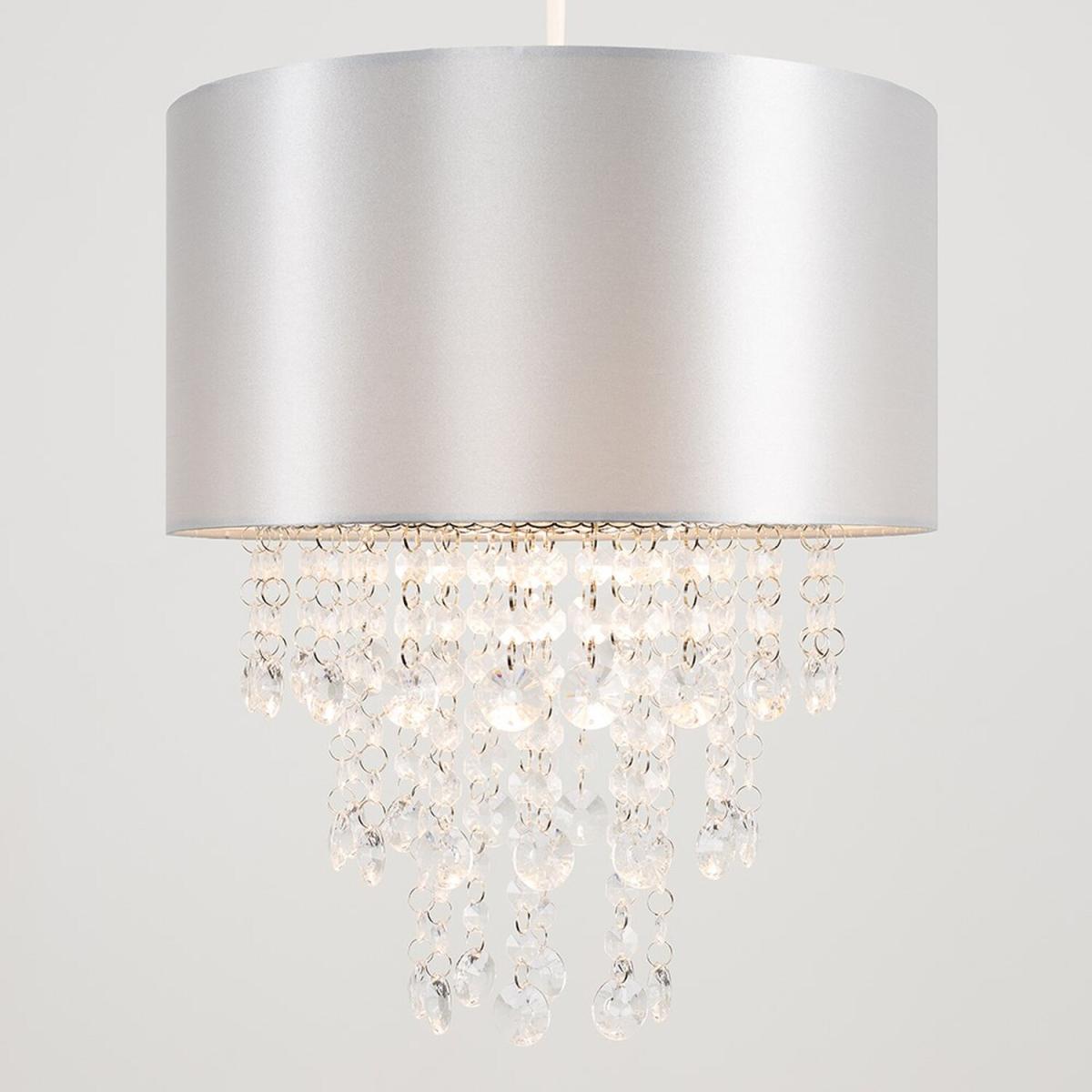Pair of modern cylinder ceiling pendant light shades in a grey fabric finish. Features cascading, light-reflecting clear acrylic jewel effect droplets, which cast the light beautifully around the room. Easily fits to your standard ceiling light socket - no wiring required. With a variety of colours available, this elegant lampshade goes perfectly with almost any style of interior design. Ideal for lounges, dining rooms, bedrooms and hallways.