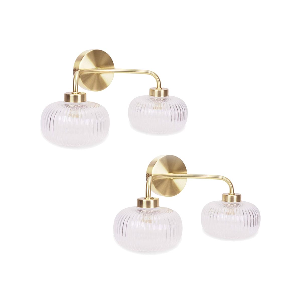 Illuminate your space with this pair of two-way wall light fittings. Suiting any living room, bedroom, bathroom or reading nook, these dual wall lights feature statement metal in a choice of matte black, polished chrome or brushed gold finish with ribbed glass shades. The textured shades not only provide a stylish look but also diffuses the light softly, creating a cosy atmosphere. With a perfect balance of style and functionality, these lights bring a touch of modern glamour to any space.