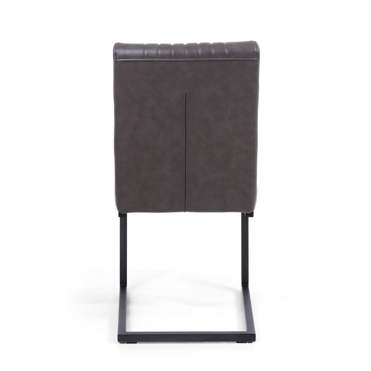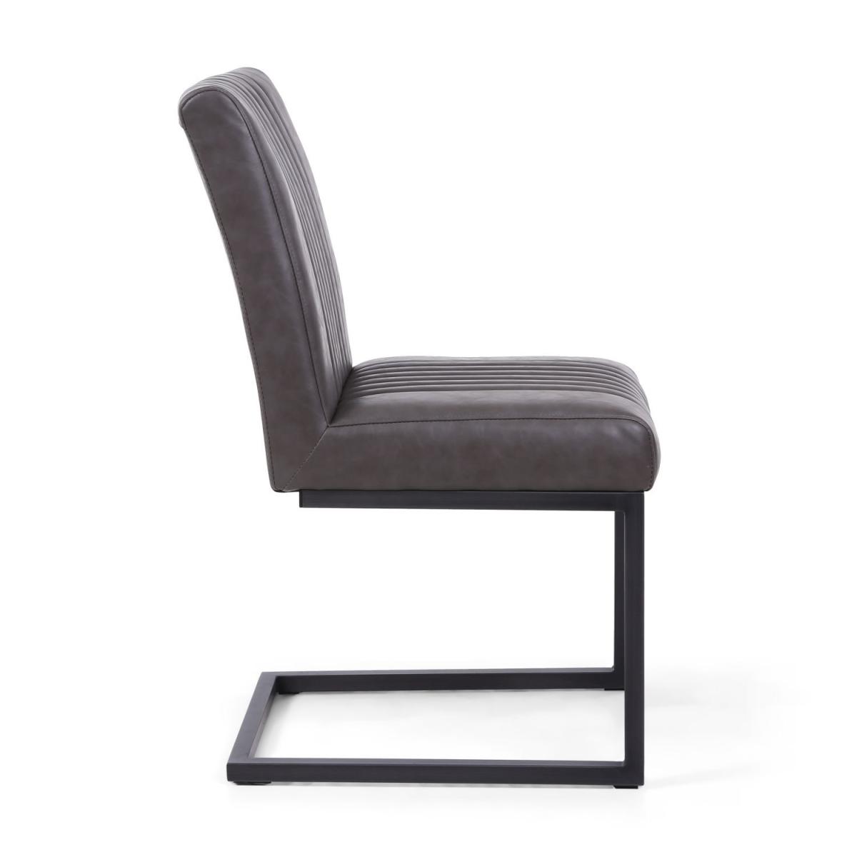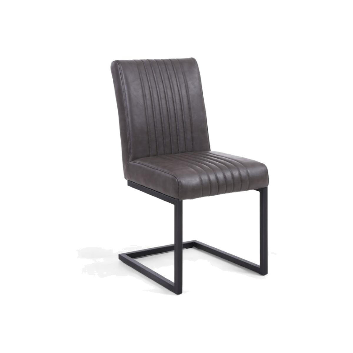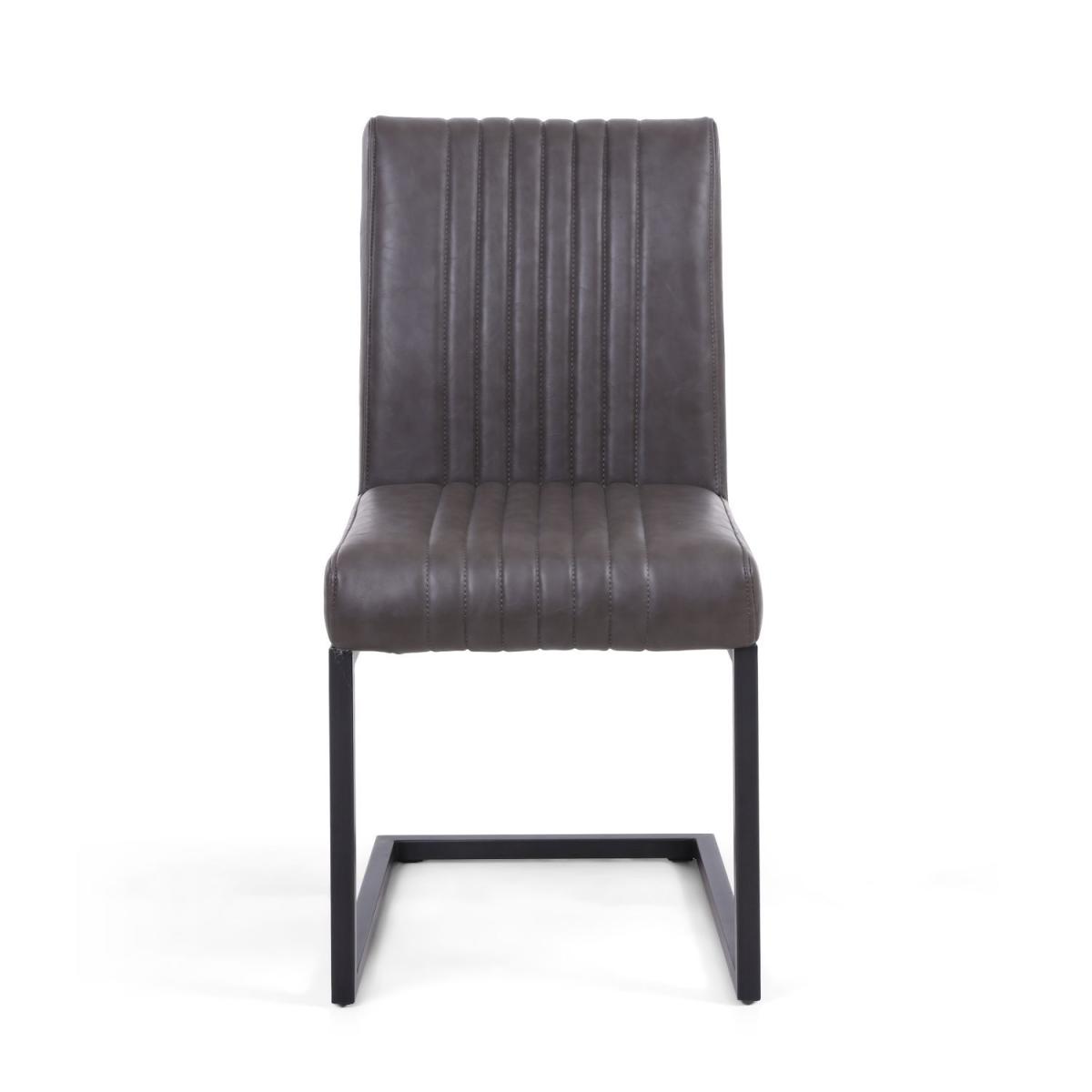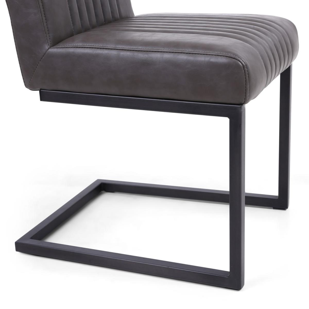 A modern industrial dining chair, upholstered in durable grey leather effect. Vertical centre stitching. Supplied with black metal cantilever legs.