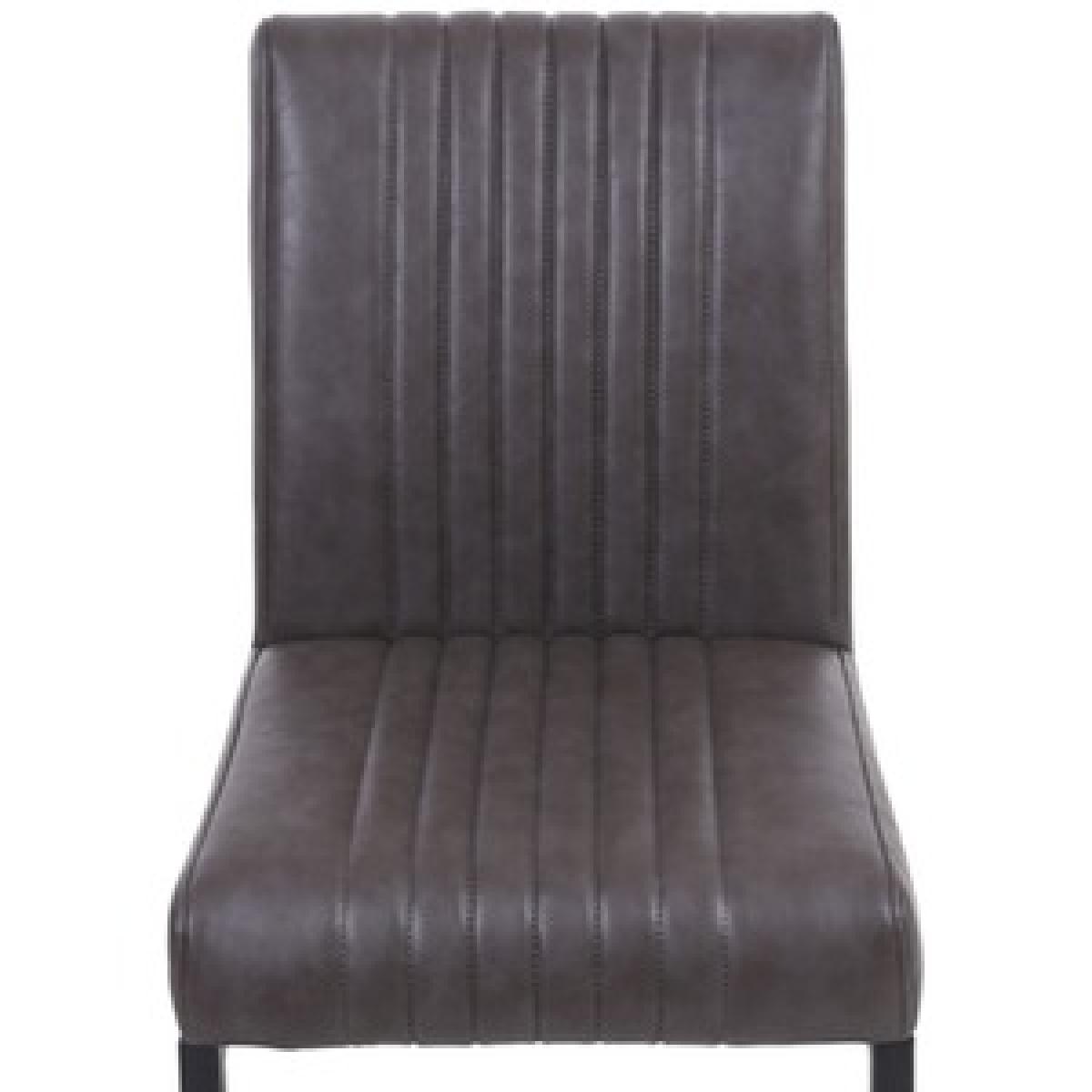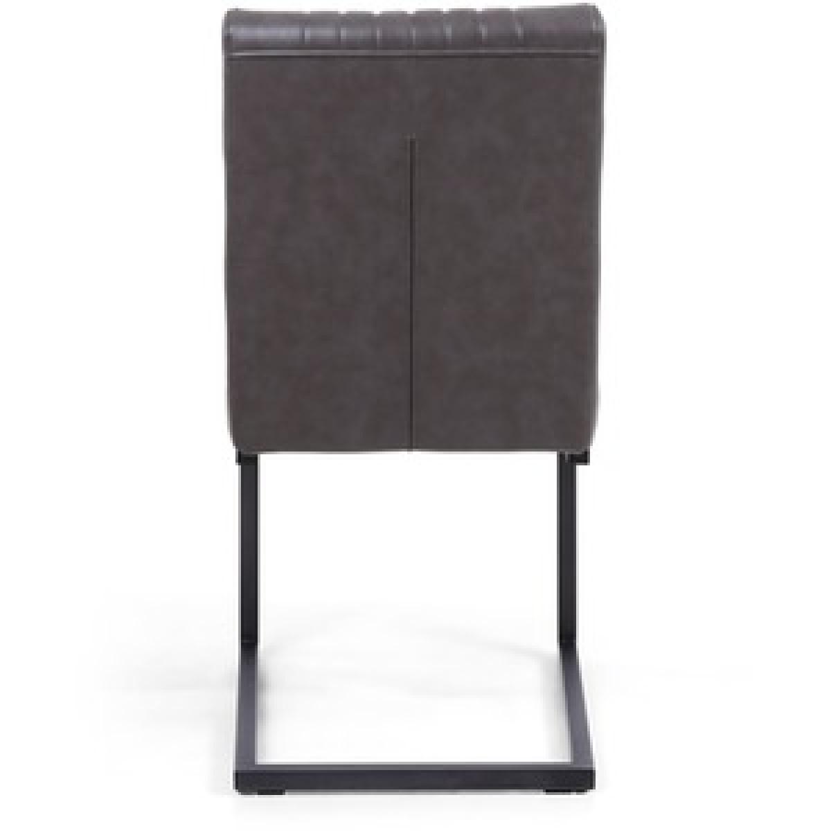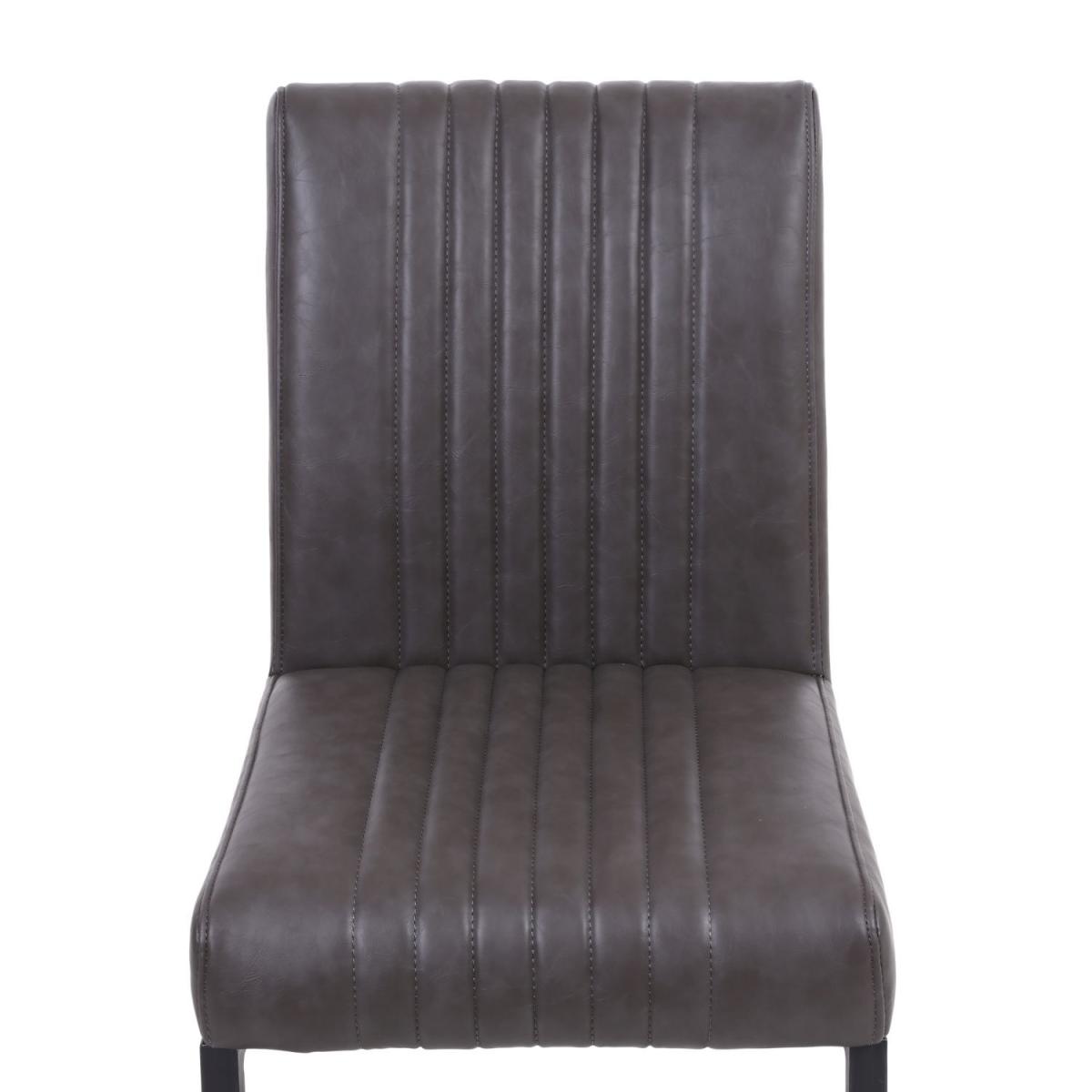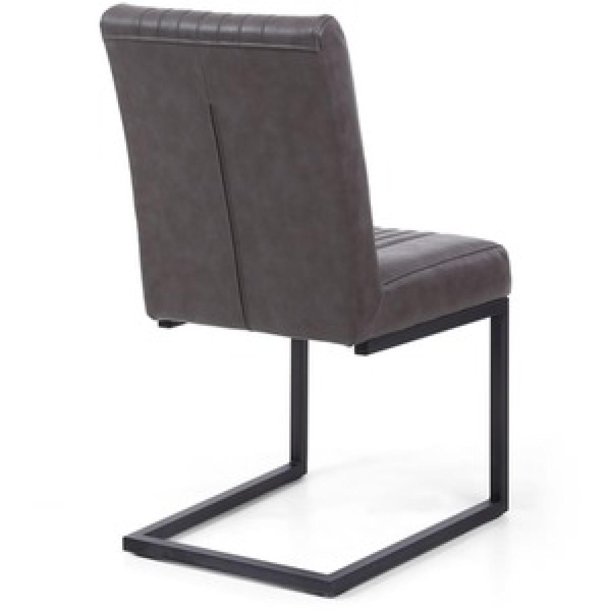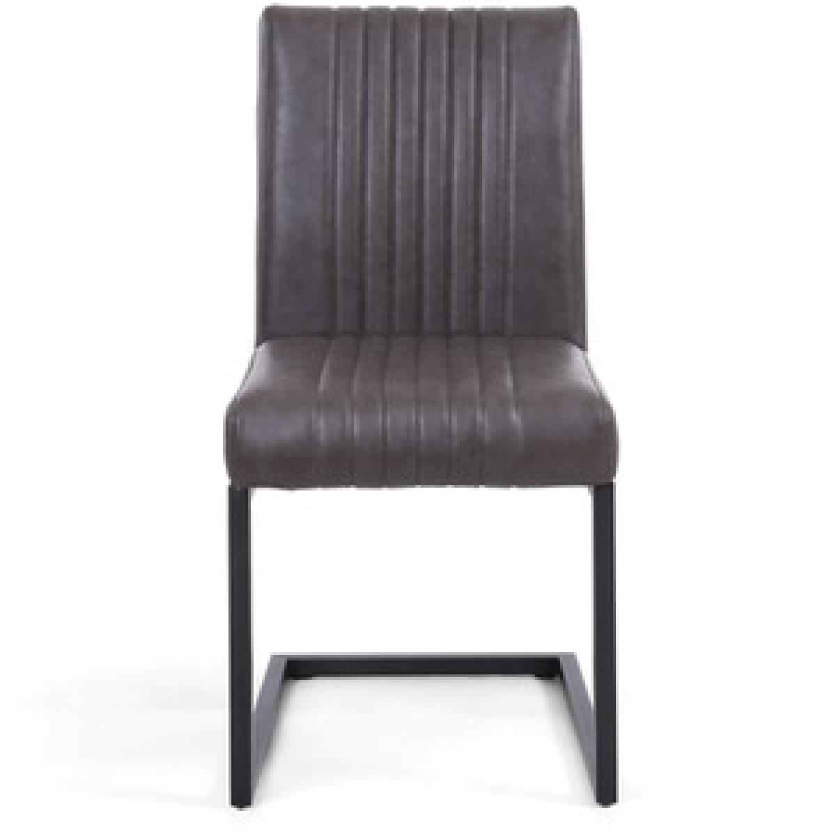 A modern industrial dining chair, upholstered in durable grey leather effect. Vertical centre stitching. Supplied with black metal cantilever legs.