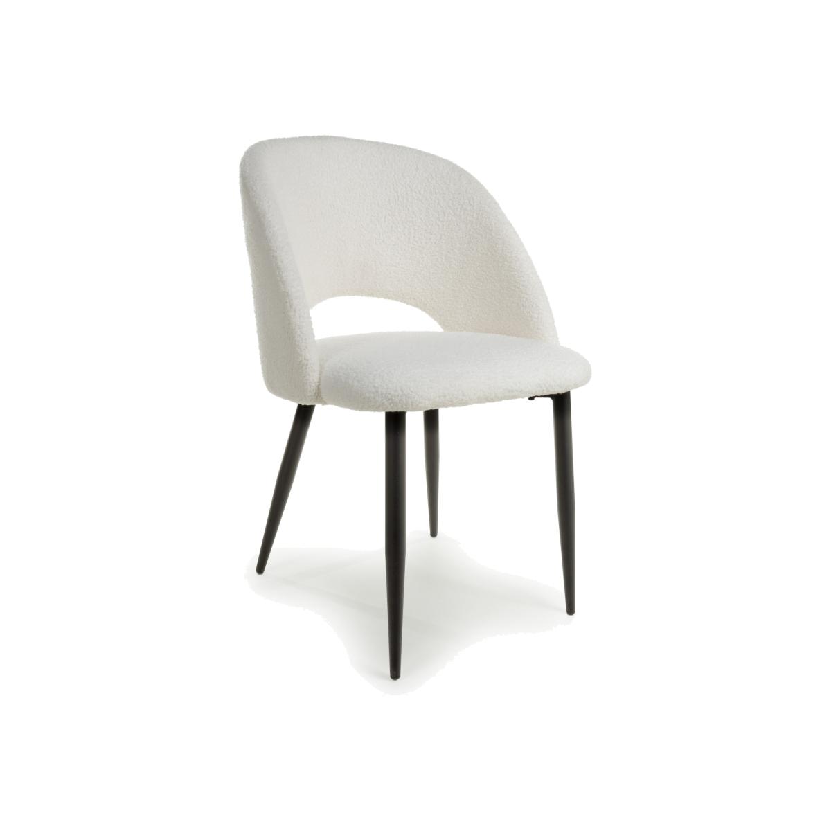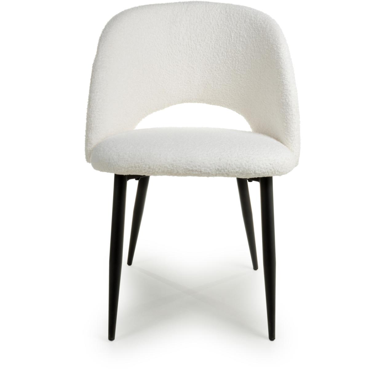 This opulent dining chair comes upholstered in luxurious boucle fabric. The gently curved backrest arcs around a signature cutout hole. Supplied with cross frame rounded black metal legs. Assembly required. Sold in boxes of 2.