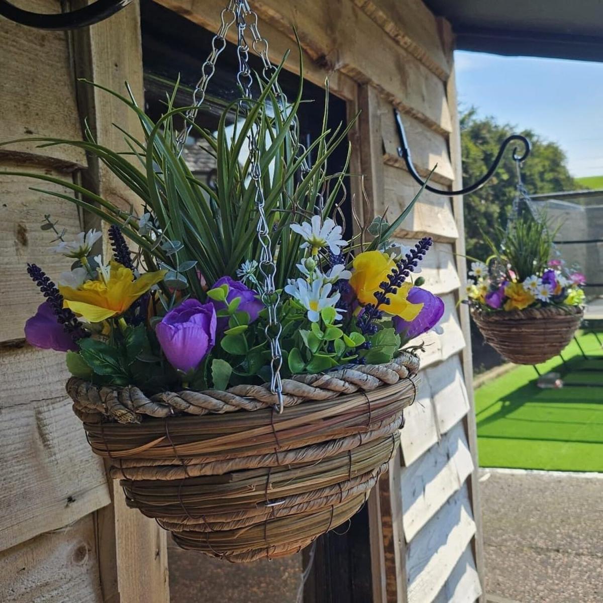 VERSATILE DESIGN:Beautiful mixed meadow flower display in a 10 inch woven decorative hanging basket, perfect for indoor spaces and home decoration PREMIUM QUALITY:Crafted from durable materials featuring lifelike daffodils and mixed meadow flowers PERFECT SIZE:Ideal for hanging in entryways, porches, or as a striking centrepiece MAINTENANCE FREE:Artificial flowers require no watering or pruning, maintaining their vibrant appearance year-round COMPLETE SET:Pair of decorative hanging baskets featuring mixed meadow flower displays, each measuring 10 Inches in diameter PREMIUM CONSTRUCTION:Crafted from durable materials with a round woven basket design, perfect for long-lasting artificial arrangements OUTDOOR USE: These baskets are perfect for outdoor or indoor use, brightening a room or pulling together a garden scene.