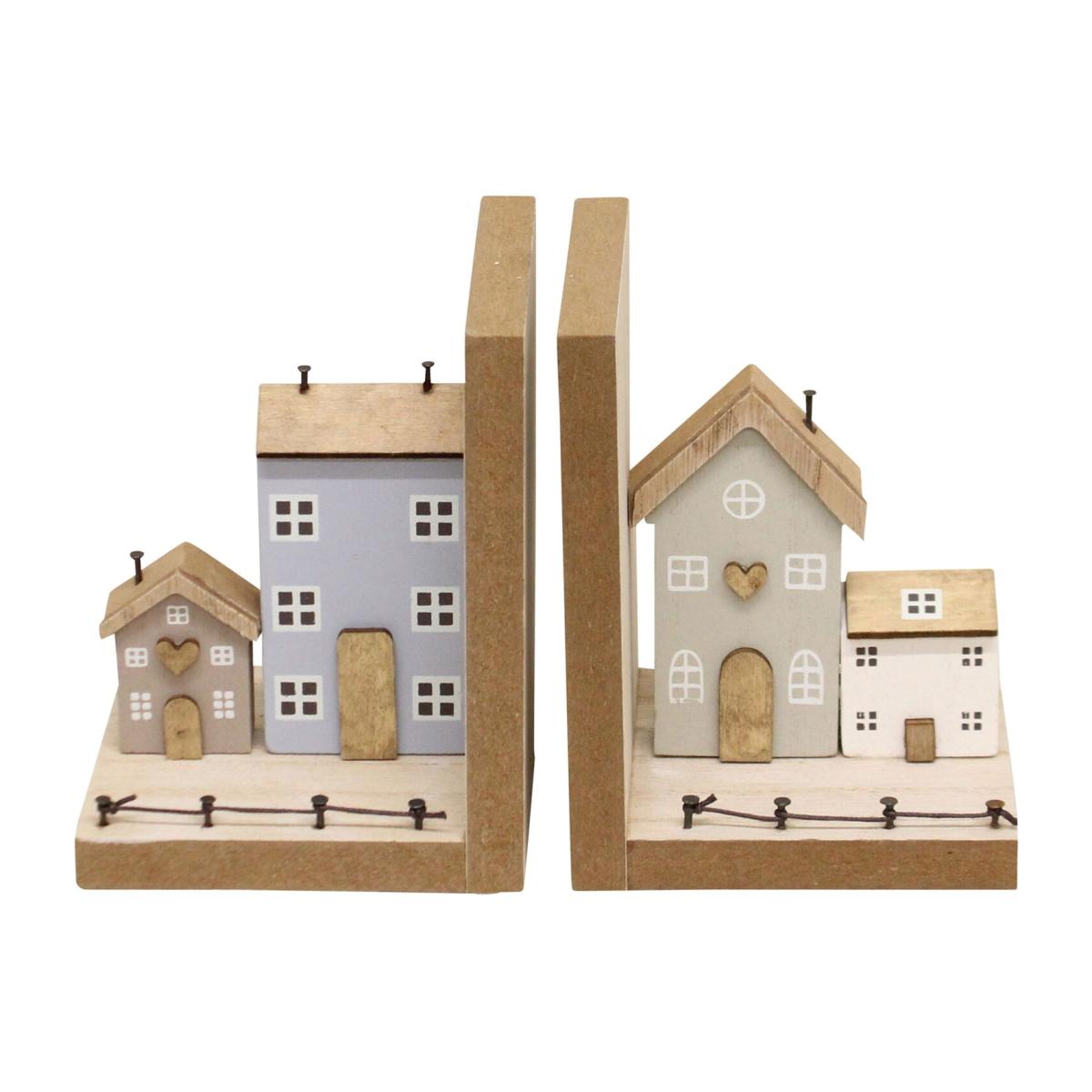 A pair of wooden bookends in our wooden houses design. Finished in neutral colours with cute touches such as picket fences and painted windows. Made of Paulownia Wood and MDF.