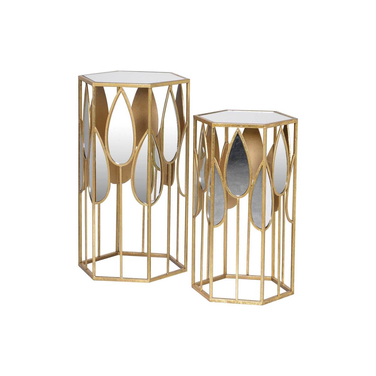 I love these side tables because they bring a touch of glamour and sophistication without overwhelming a space. Their hexagonal shape and mirrored surfaces make them versatile - they work well in contemporary, glamour, or eclectic interiors. The gold framework adds warmth and richness, making them ideal for layering with other metallic accents or soft furnishings. Practical styling tips include placing them beside a armchair or sofa to serve as essential surface areas, or grouping both together in a corner for visual impact. They look especially striking next to a plush velvet armchair or a sleek modern sofa, and can easily be styled with decorative trays, candlesticks, or small statement lamps for added personality.