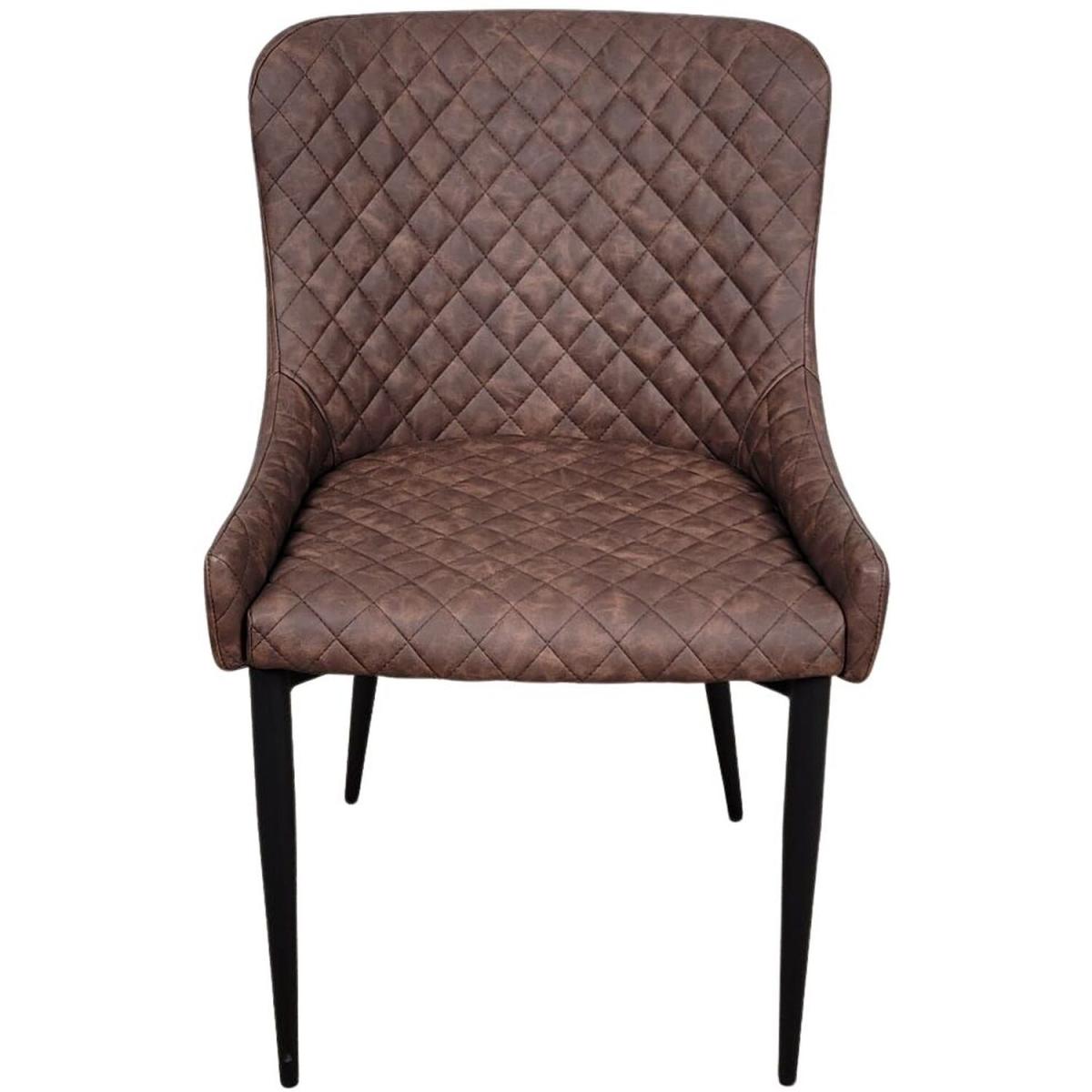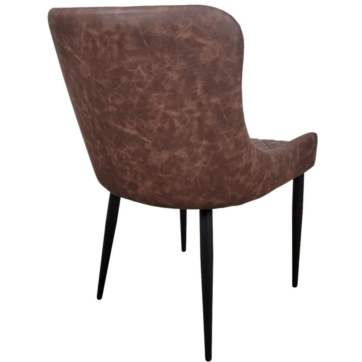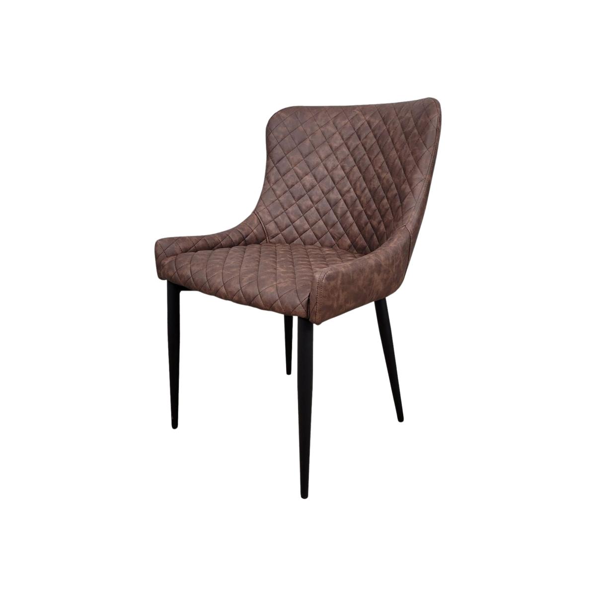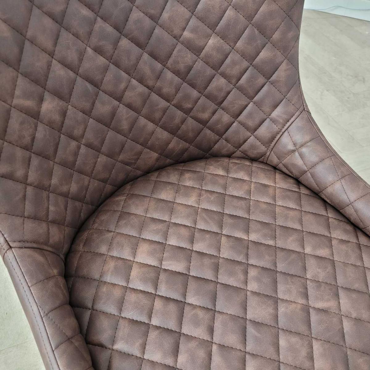 Upholstered in a high quality brown distressed PU leather giving it a quality authentic feel and durability. The brown leather effect is distressed to add to its authentic industrial and retro look. The scoop-shaped seat is quilted and curved to provide comfort and support and is finished in a diamond stitch pattern. With its low curved arm the dining chair provides comfort whilst being practical to help push and store underneath the breakfast bar or kitchen island. The black metal leg frame offers a sturdy base and adds to the industrial style. The perfect addition to the home or ideal for bars, bistros, cafes, restaurants and pubs.