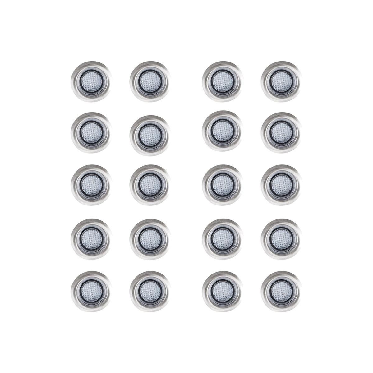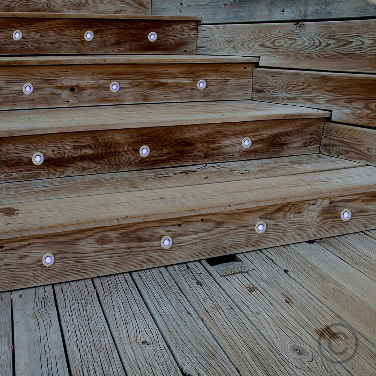 Complete Stainless Steel Decking Plinth Lights Kit. Includes all bulbs, cables, and connections. Update your garden with these fantastic lights. These blue LED's light up your decking beautifully. IP67 outdoor rating. This kit contains 20 x 40mm LED decking lights (1.5m of cable between each light). 1 x transformer with 3 pin plug for indoor connection to mains power. 5m cable from transformer to first light.