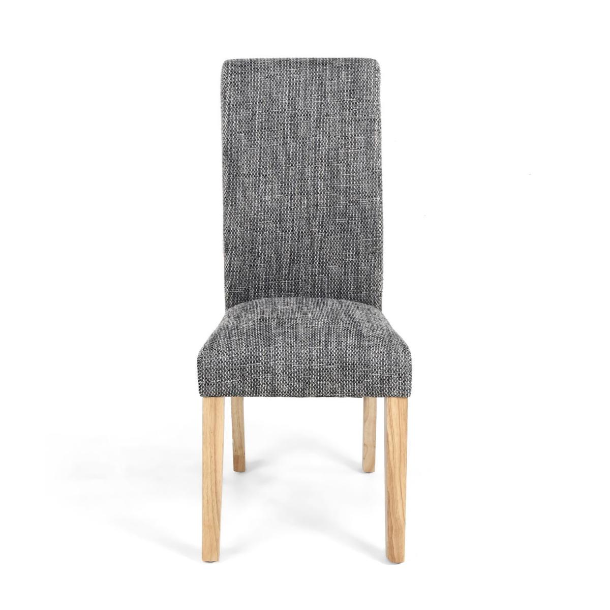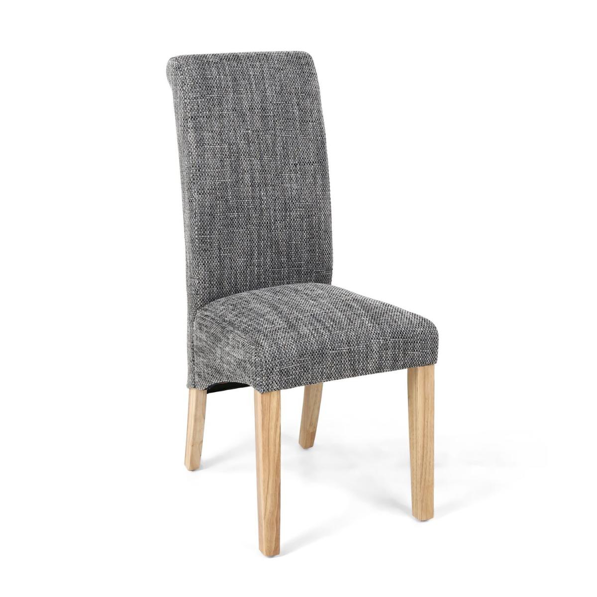 A classic roll back design dining chair, upholstered in a fashionable grey tweed effect. Sprung and belted seat. Supplied with natural rubberwood legs. Assembly required.