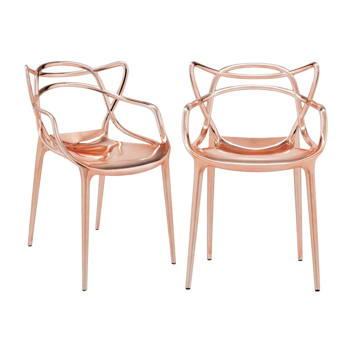 I love these Kartell metallic Masters chairs for their contemporary, sculptural silhouette and lustrous finish, which add a refined touch to any dining space. They work particularly well in modern interiors that embrace a mix of textures and finishes, such as glass, marble, and polished metals. The metallic rose-gold hue makes them a statement piece without overpowering the room, so I suggest pairing them with neutral or monochrome dining tables to let the chairs shine. Practical styling tips include using cushions for added comfort and colour contrast, or combining these chairs with softer textiles around the table to soften their sleek lines and create a balanced, stylish dining area.