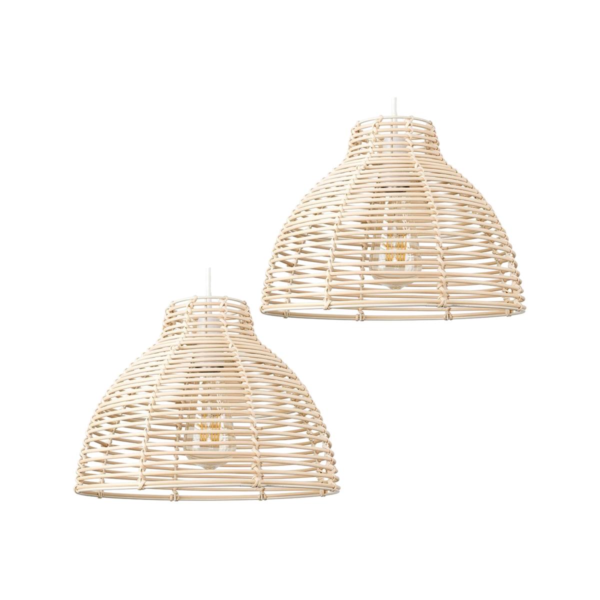 Pair of modern wicker basket style ceiling pendant light shades in a cream finish. These contemporary ceiling shades are a great way to add a rustic style to a room. It simply attaches to an existing ceiling light socket - no wiring required. Pendant shades are a great way to update any room.