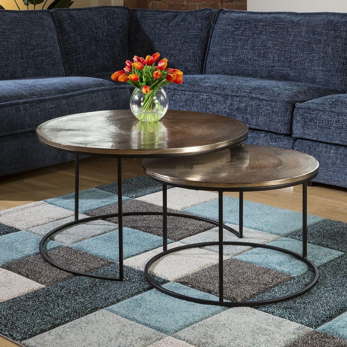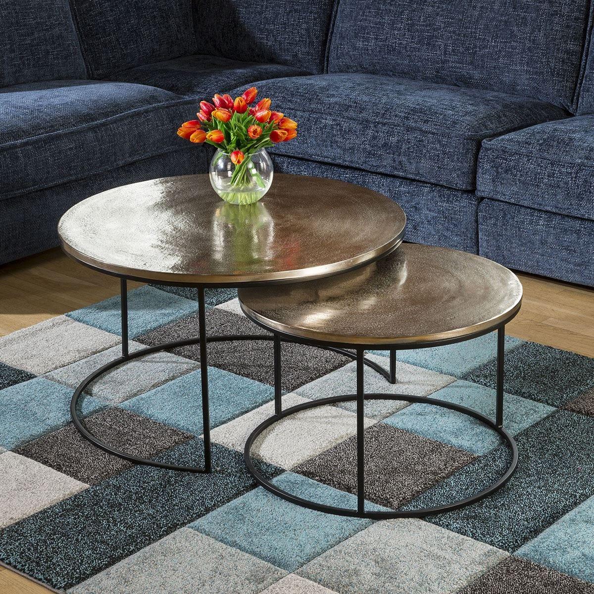 Delightful set of round coffee tables featuring strong black powder coated steel frames and textured aluminium tops finished in a champagne gold colour. A touch of class for your lounge, living room or conservatory. Manufactured in Holland by one of Europes leading high end factories to the highest quality standards. As part of the Paramount range we also have many other matching items, if you can't see them online please contact us for a full brochure. As part of the Asher range we also have many other matching items, if you can't see them online please contact us for a full brochure. W80cm D80cm H46cm Premium Quality Furniture Fully Assembled