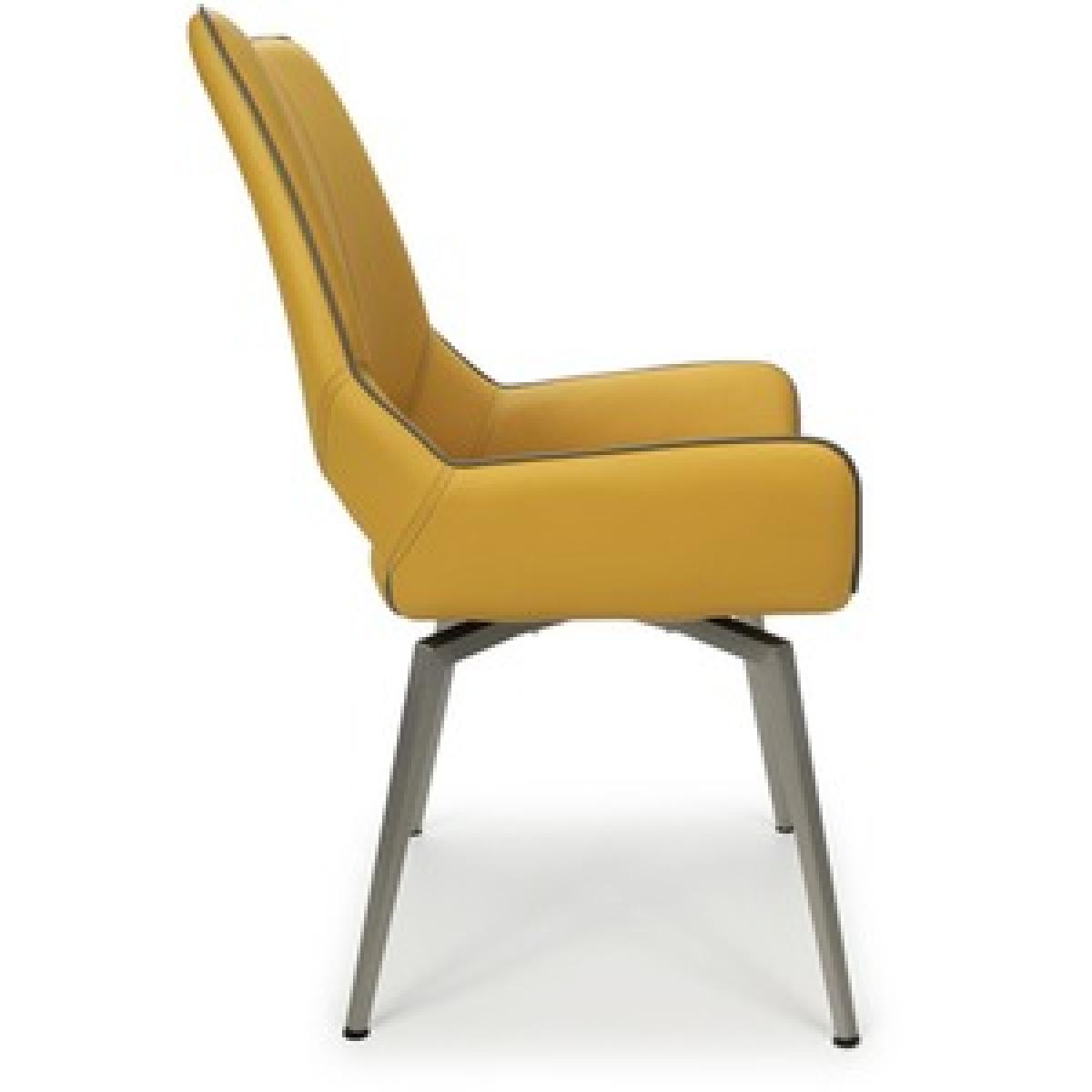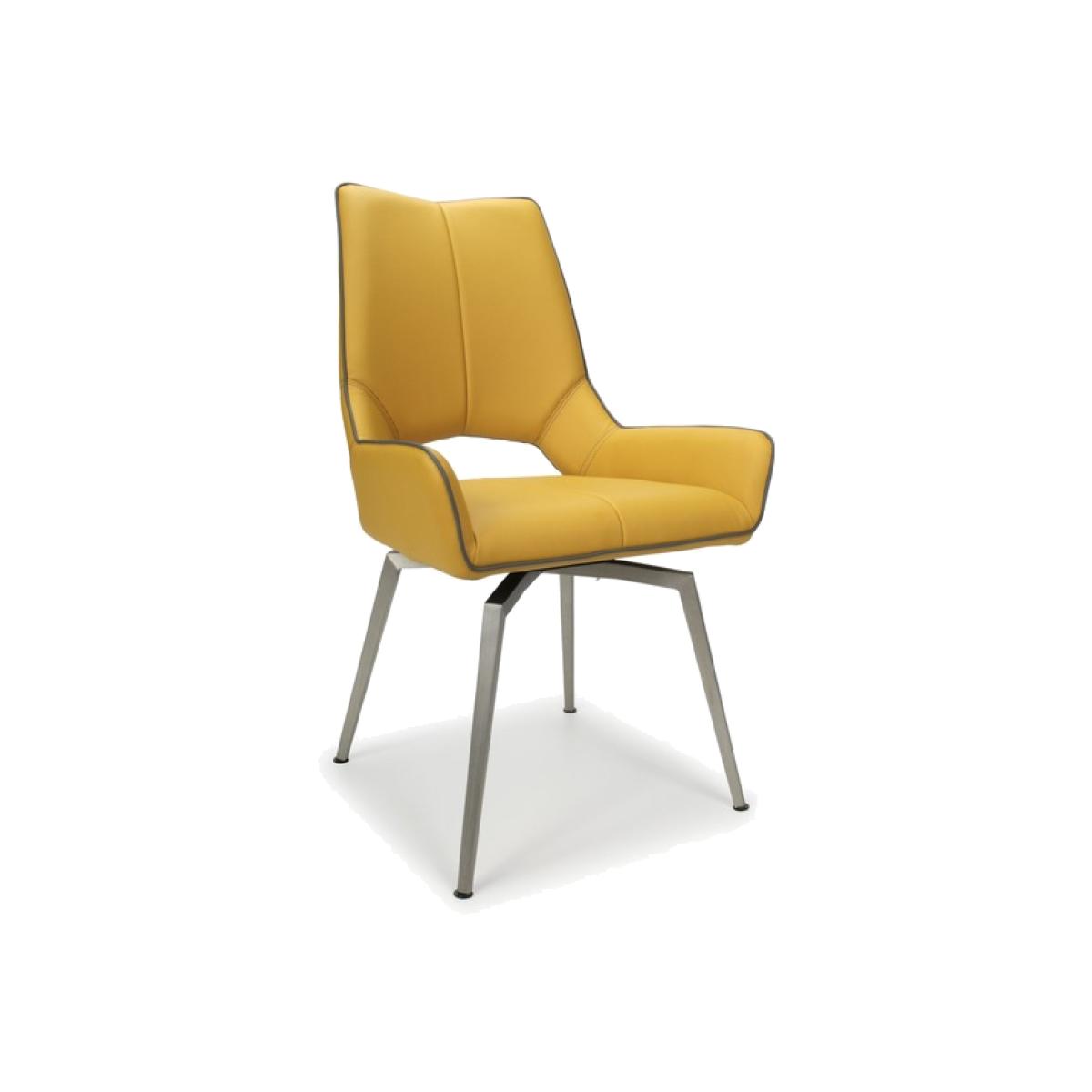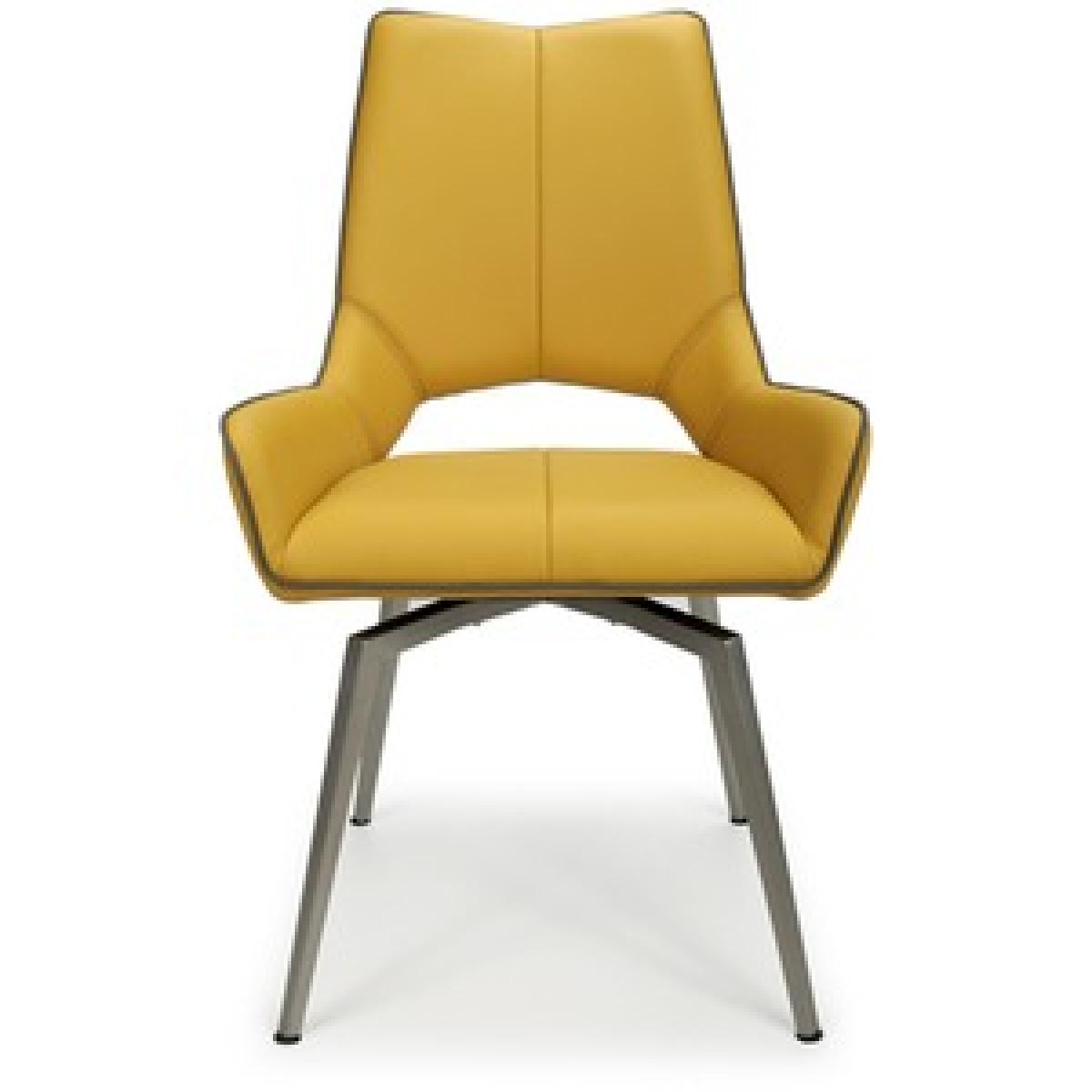 An ultra-modern angled dining chair, upholstered in yellow leather effect. The seat smoothly swivels before gently returning to a central position. Supplied with stainless steel legs. Assembly required. Sold in boxes of 2.