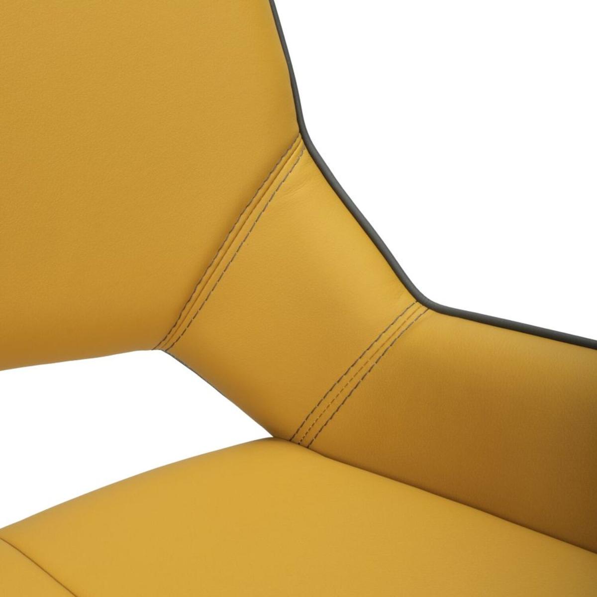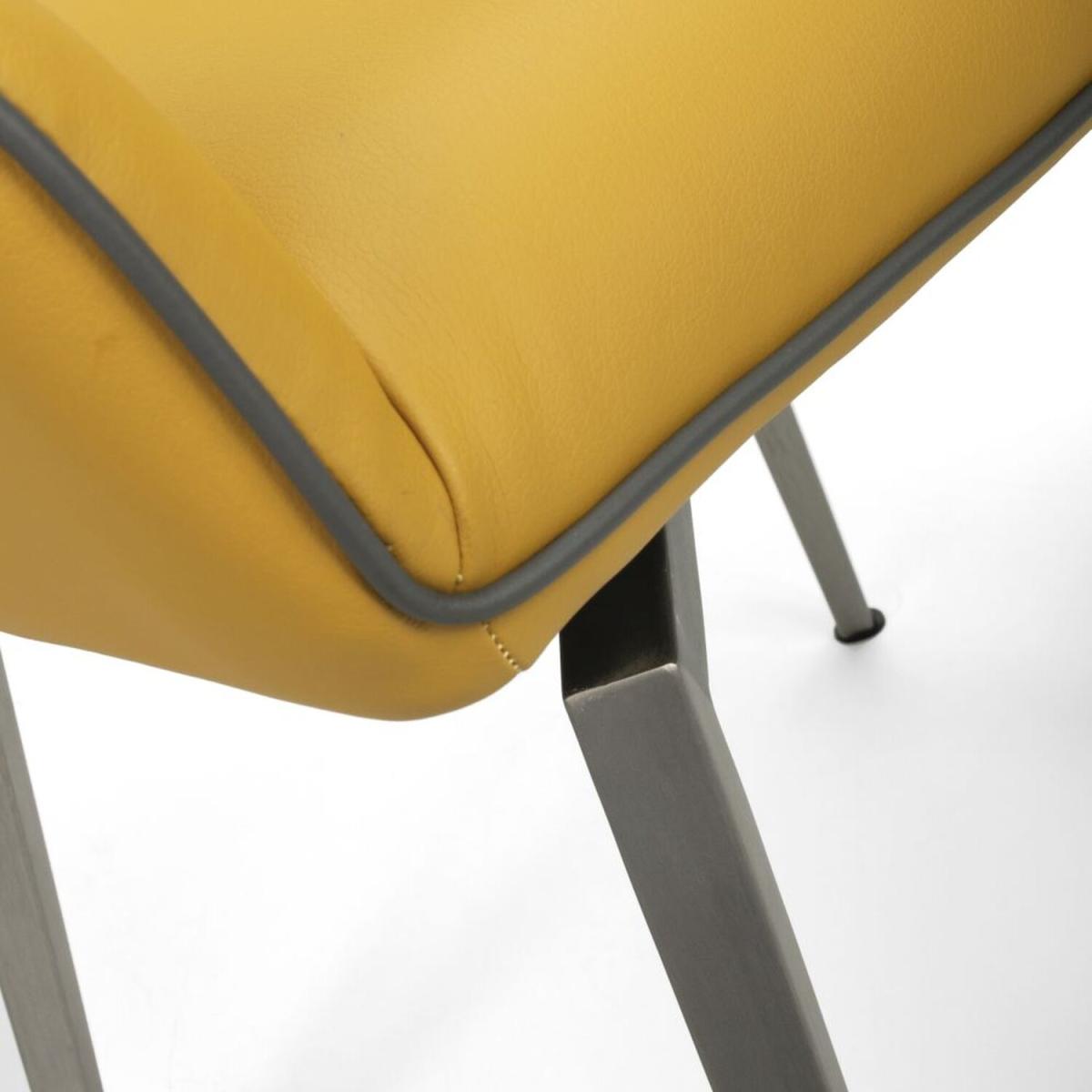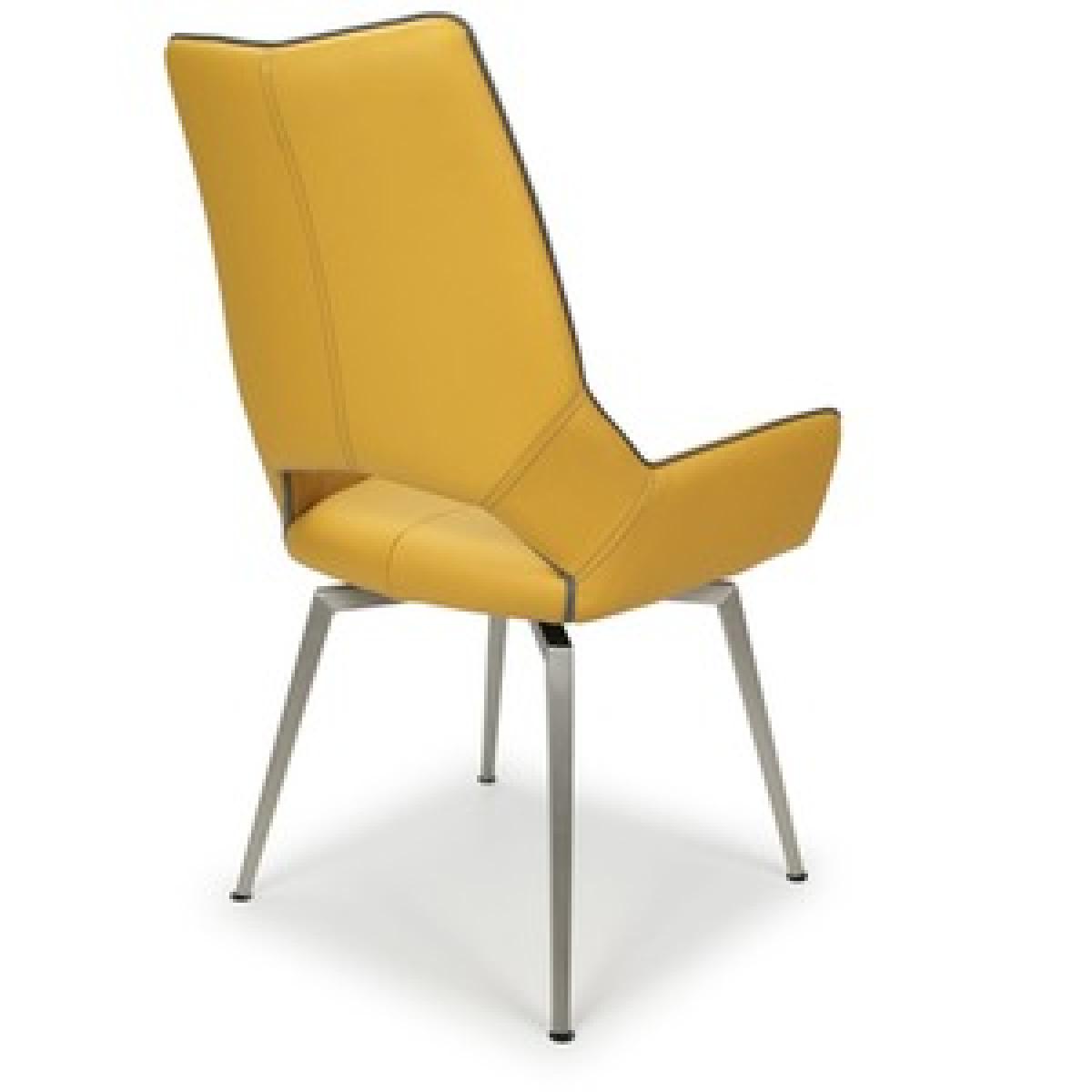 An ultra-modern angled dining chair, upholstered in yellow leather effect. The seat smoothly swivels before gently returning to a central position. Supplied with stainless steel legs. Assembly required. Sold in boxes of 2.