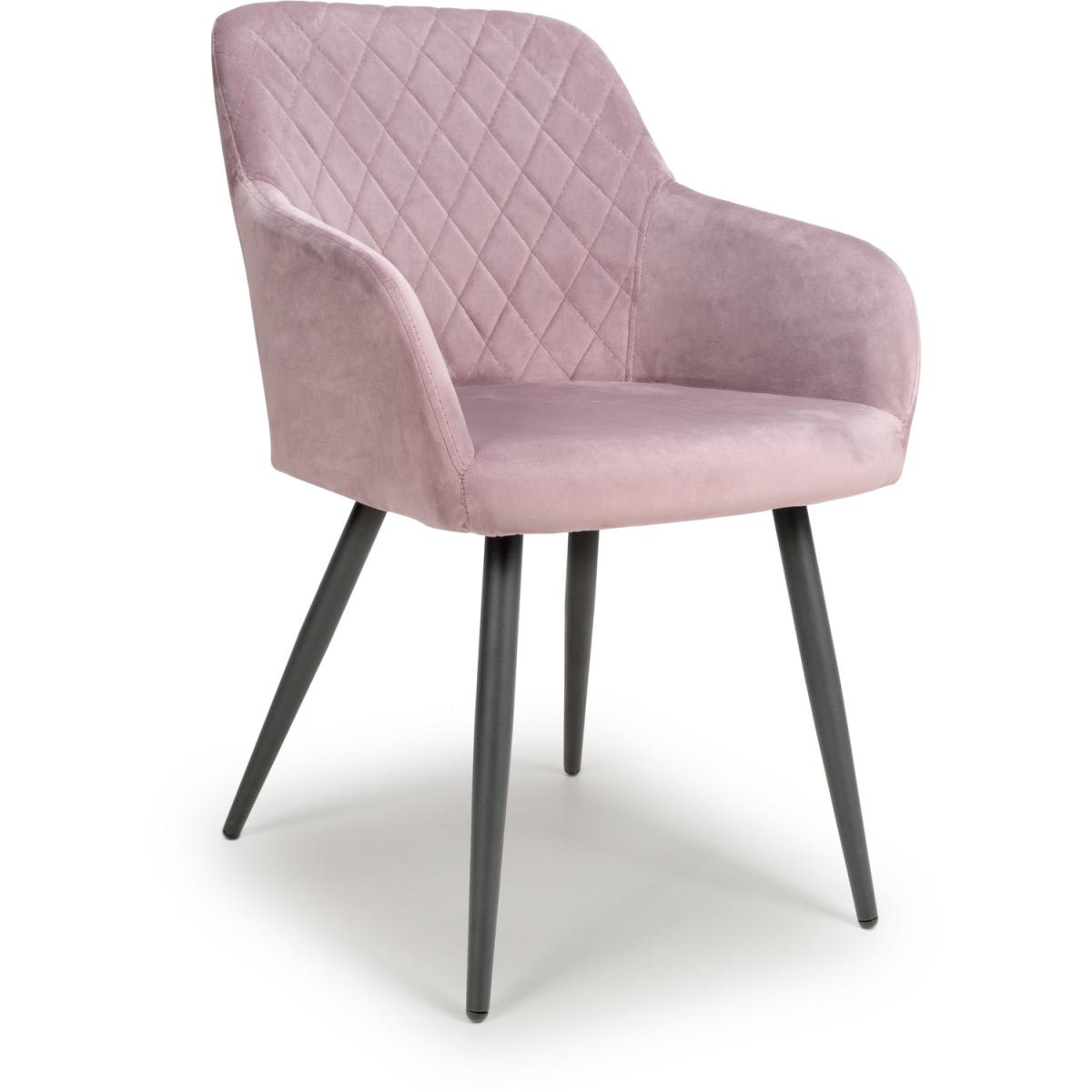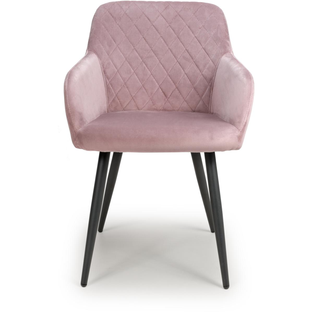 A plush elegant dining chair, upholstered in brushed velvet. An eye catching diamond stitched back, complemented by high arm rests. Supplied with black metal tapered legs. Leg assembly required. Sold in boxes of 2.