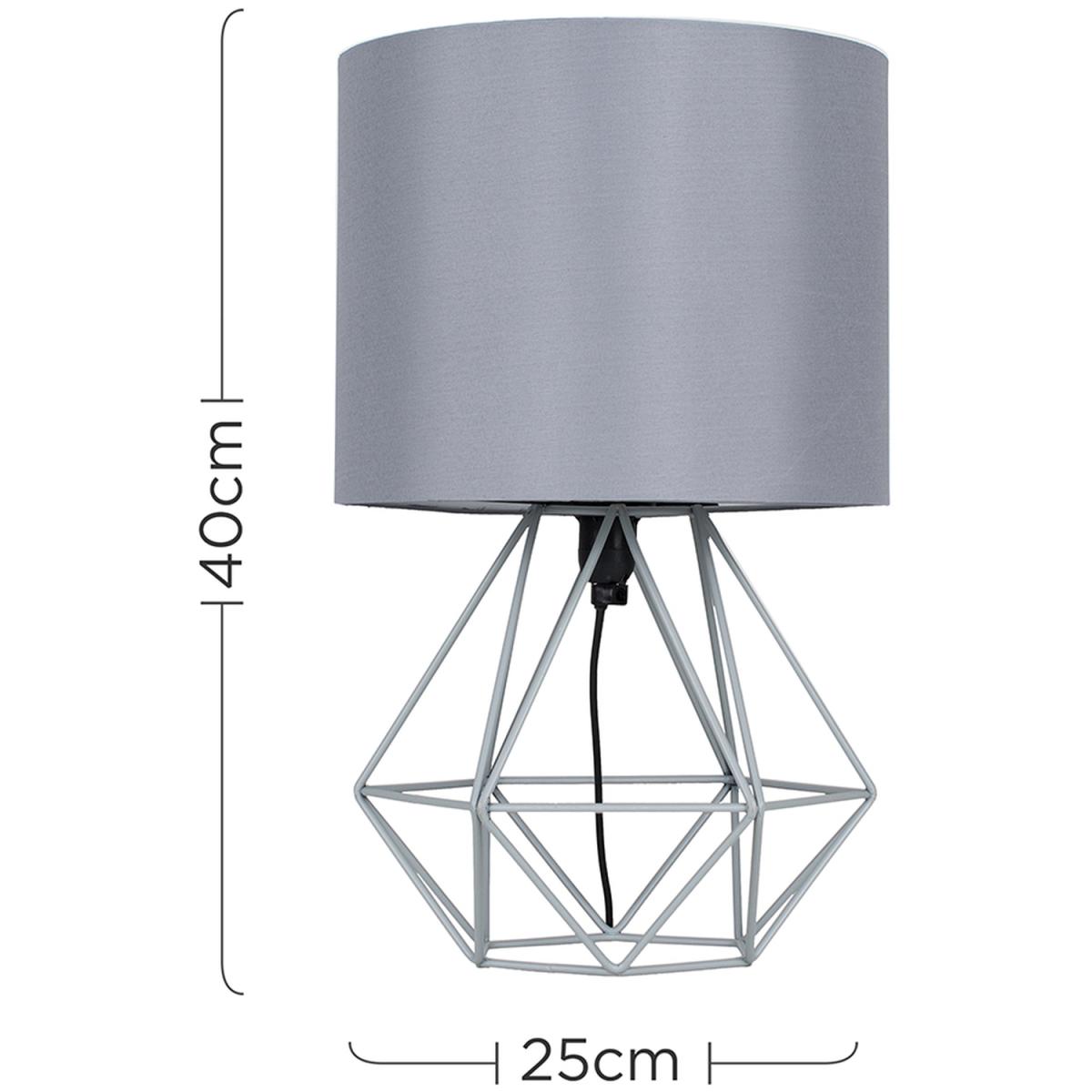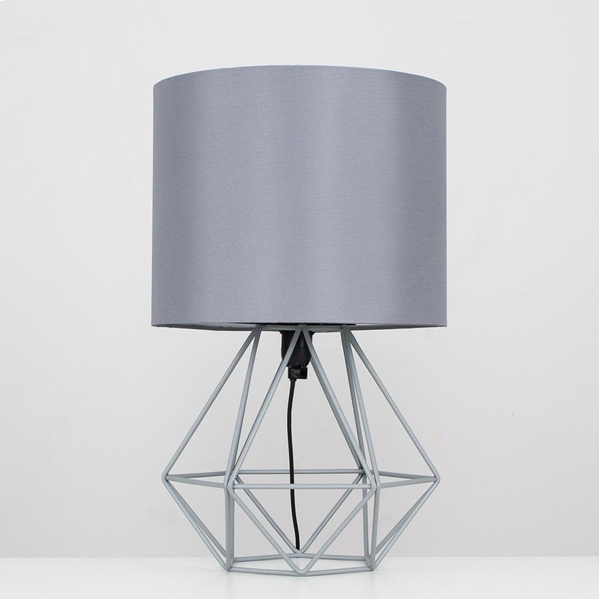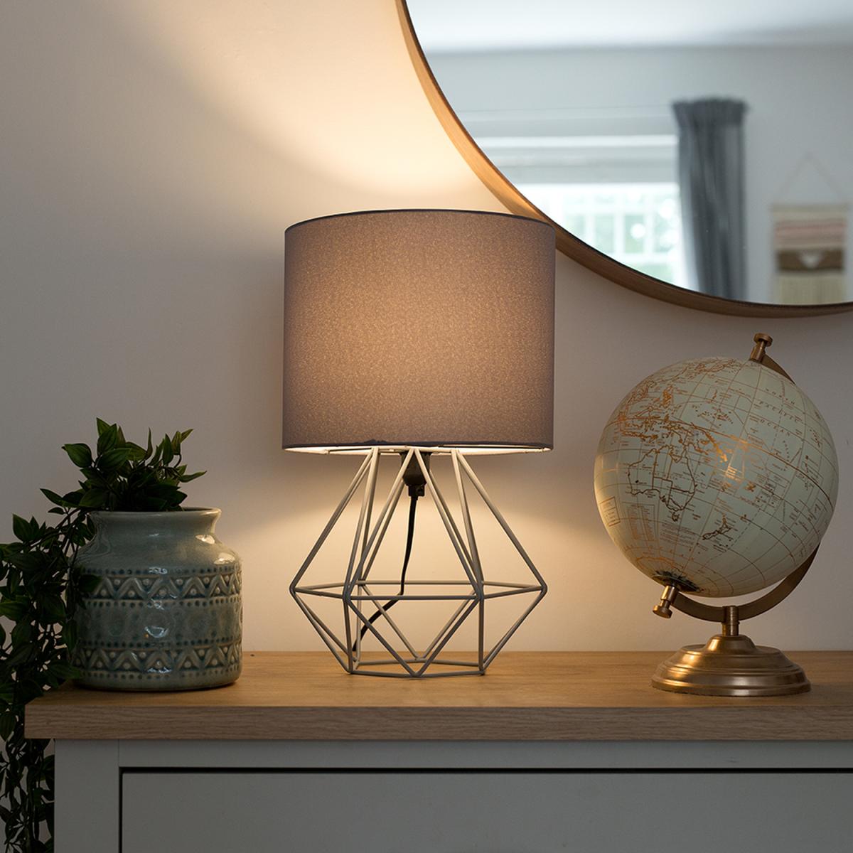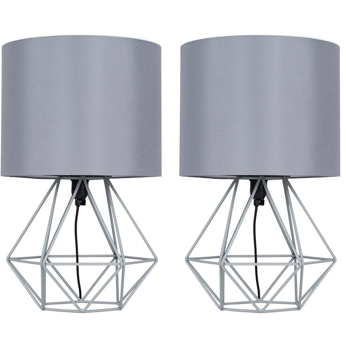 Pair of modern geometric style table lamp bases in a grey finish, complete with grey fabric shades. These contemporary table lamps are a great way to brighten up any room in your home. Its simply yet stylish design will add a minimalist touch to your living space. Complete with an in-line onoff switch. Ideal for use in lounges, hallways, bedrooms and other living areas. Table lamps are brilliant as complementary lighting and are perfect to light up dull corners.