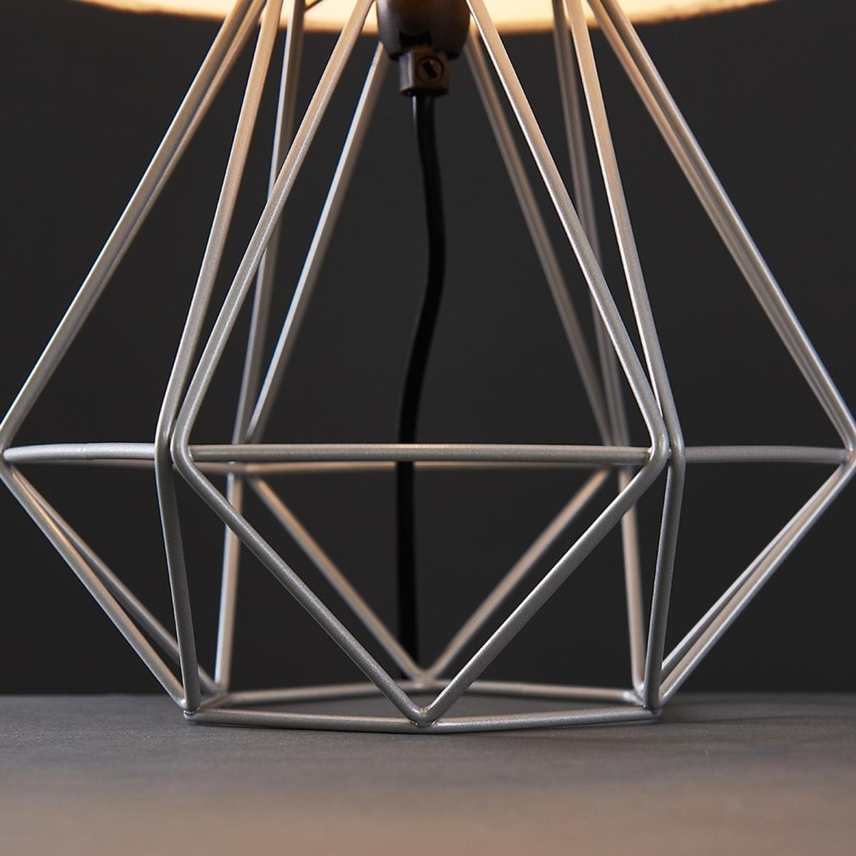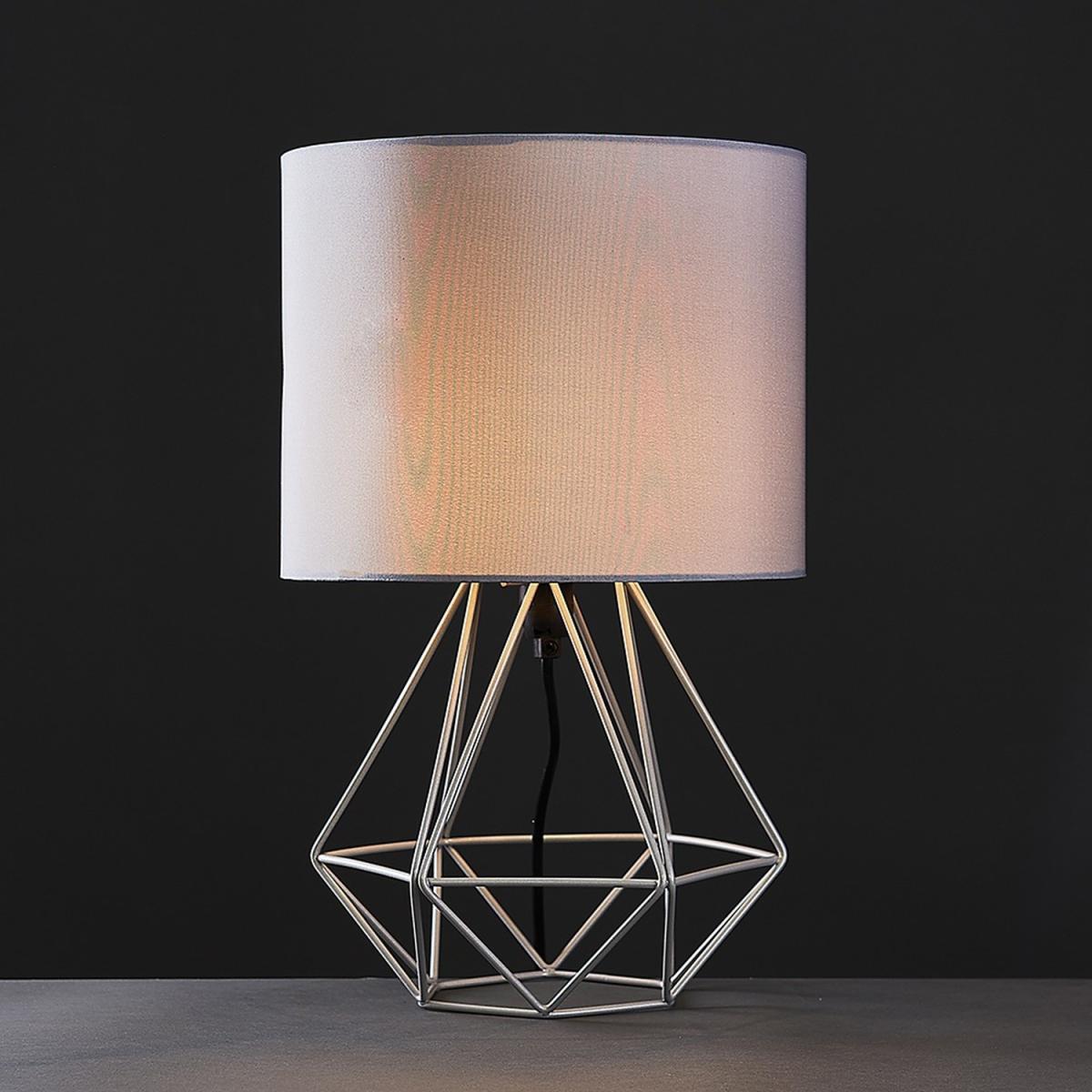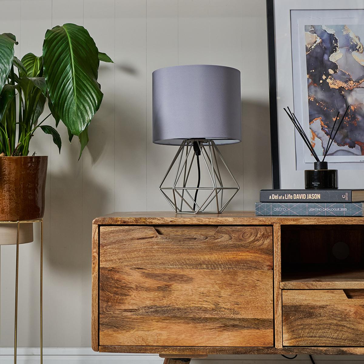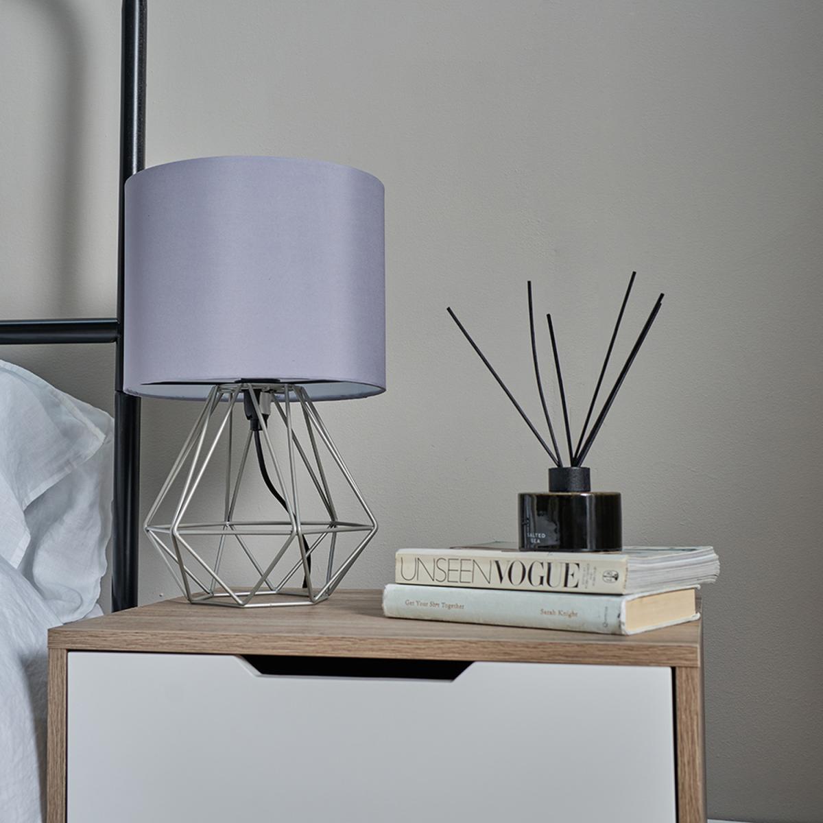 Pair of modern geometric style table lamp bases in a grey finish, complete with grey fabric shades. These contemporary table lamps are a great way to brighten up any room in your home. Its simply yet stylish design will add a minimalist touch to your living space. Complete with an in-line onoff switch. Ideal for use in lounges, hallways, bedrooms and other living areas. Table lamps are brilliant as complementary lighting and are perfect to light up dull corners.